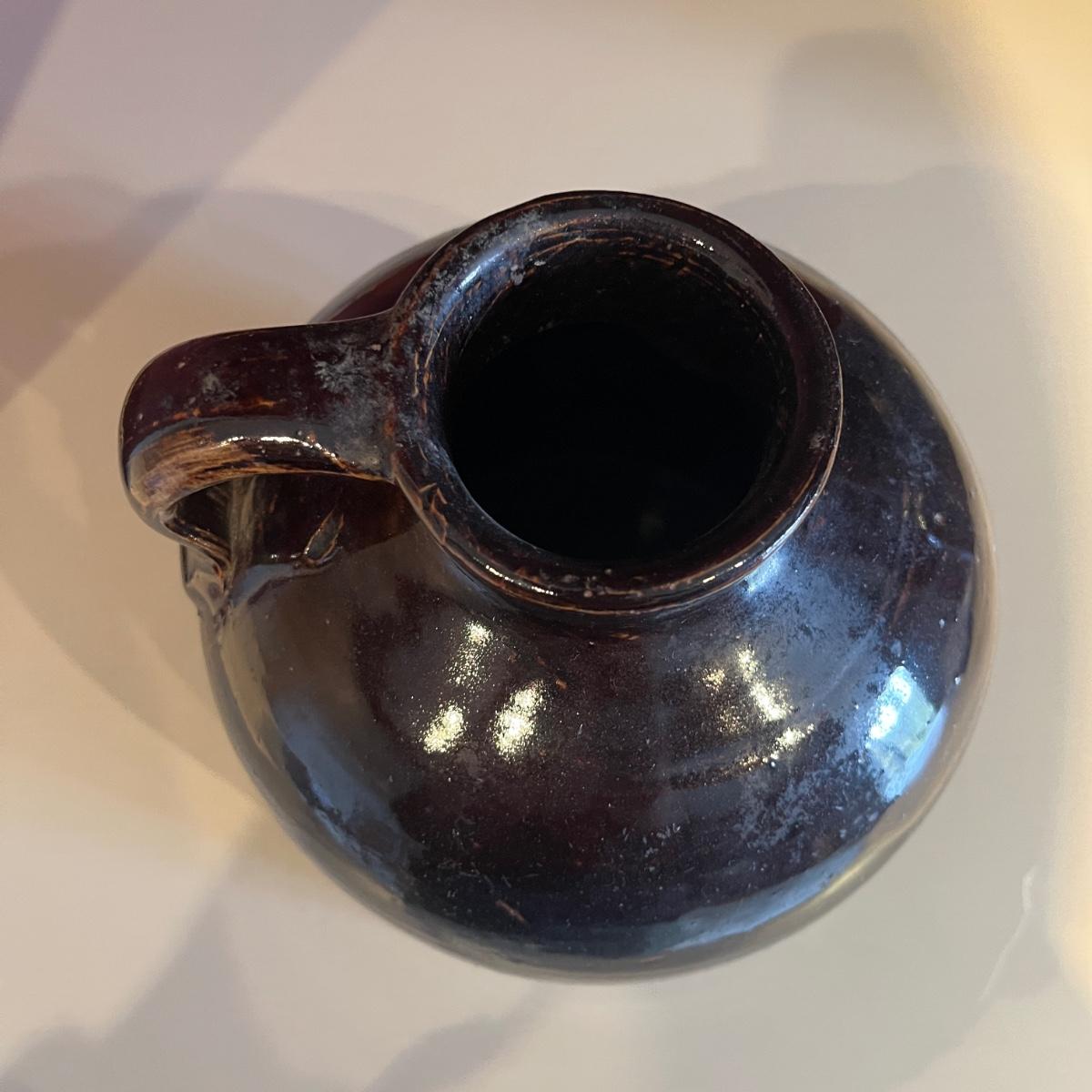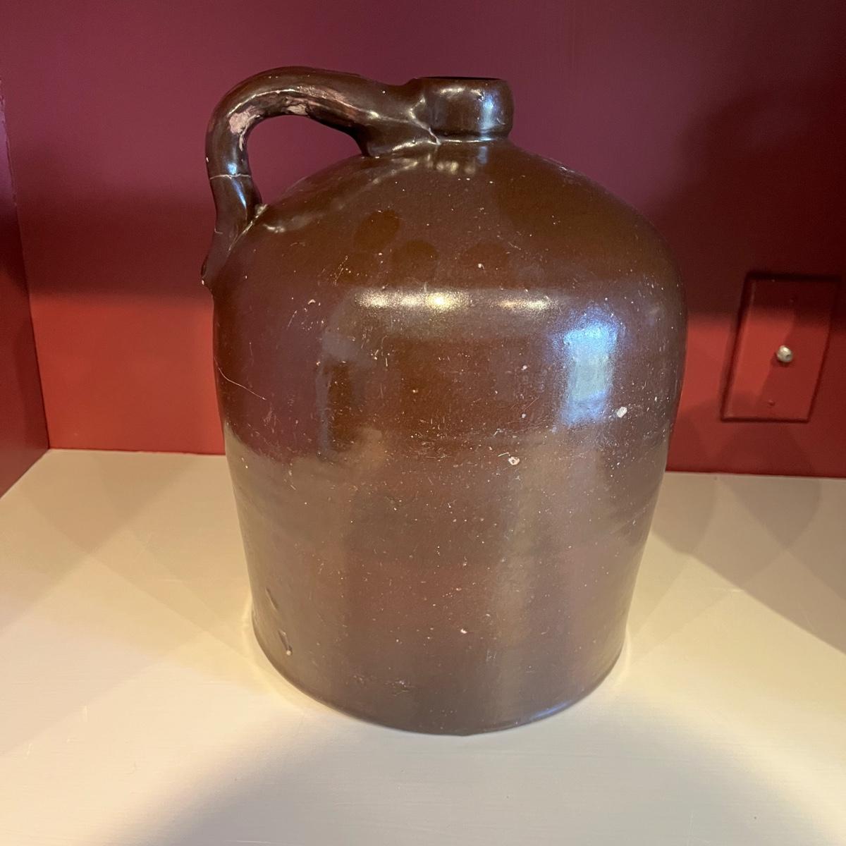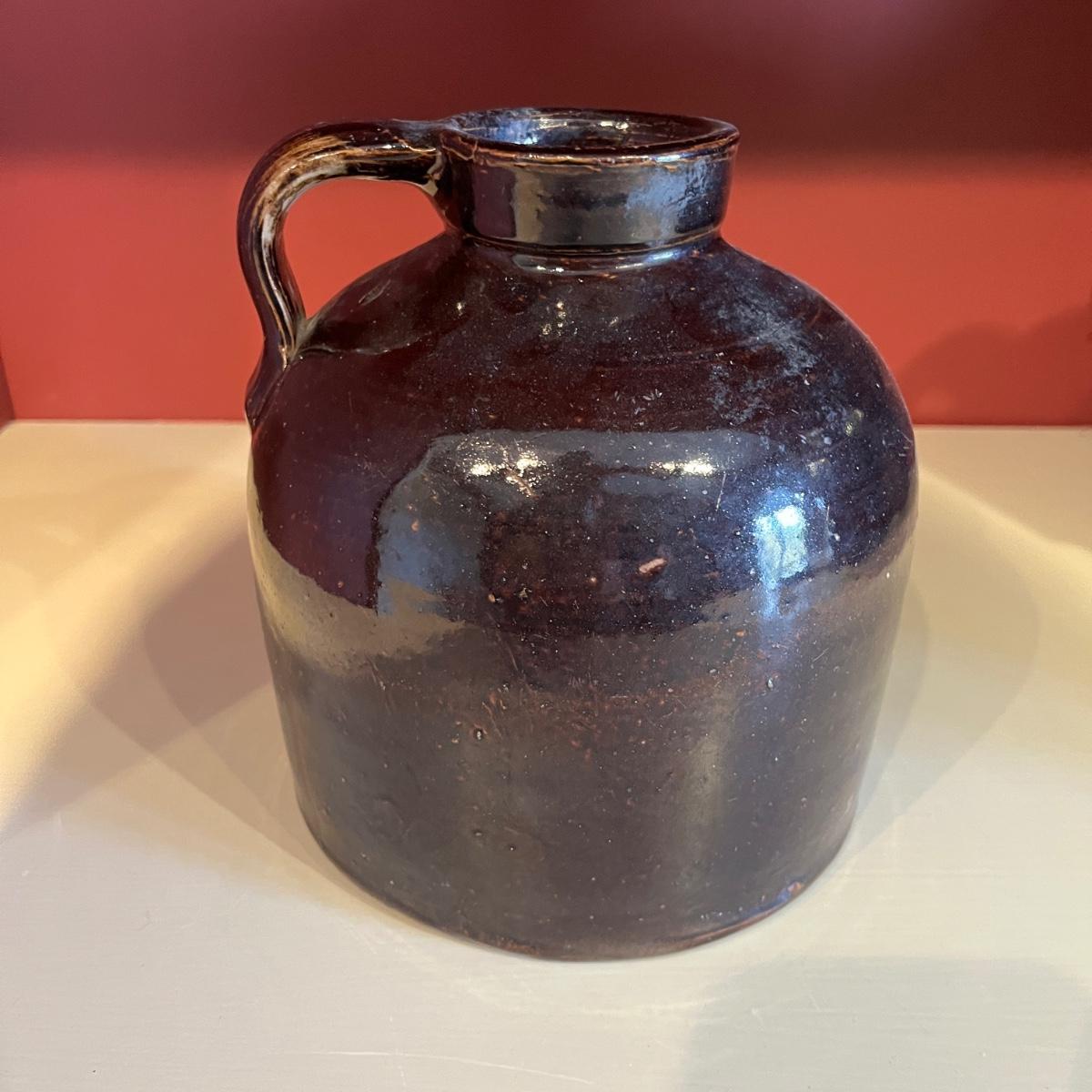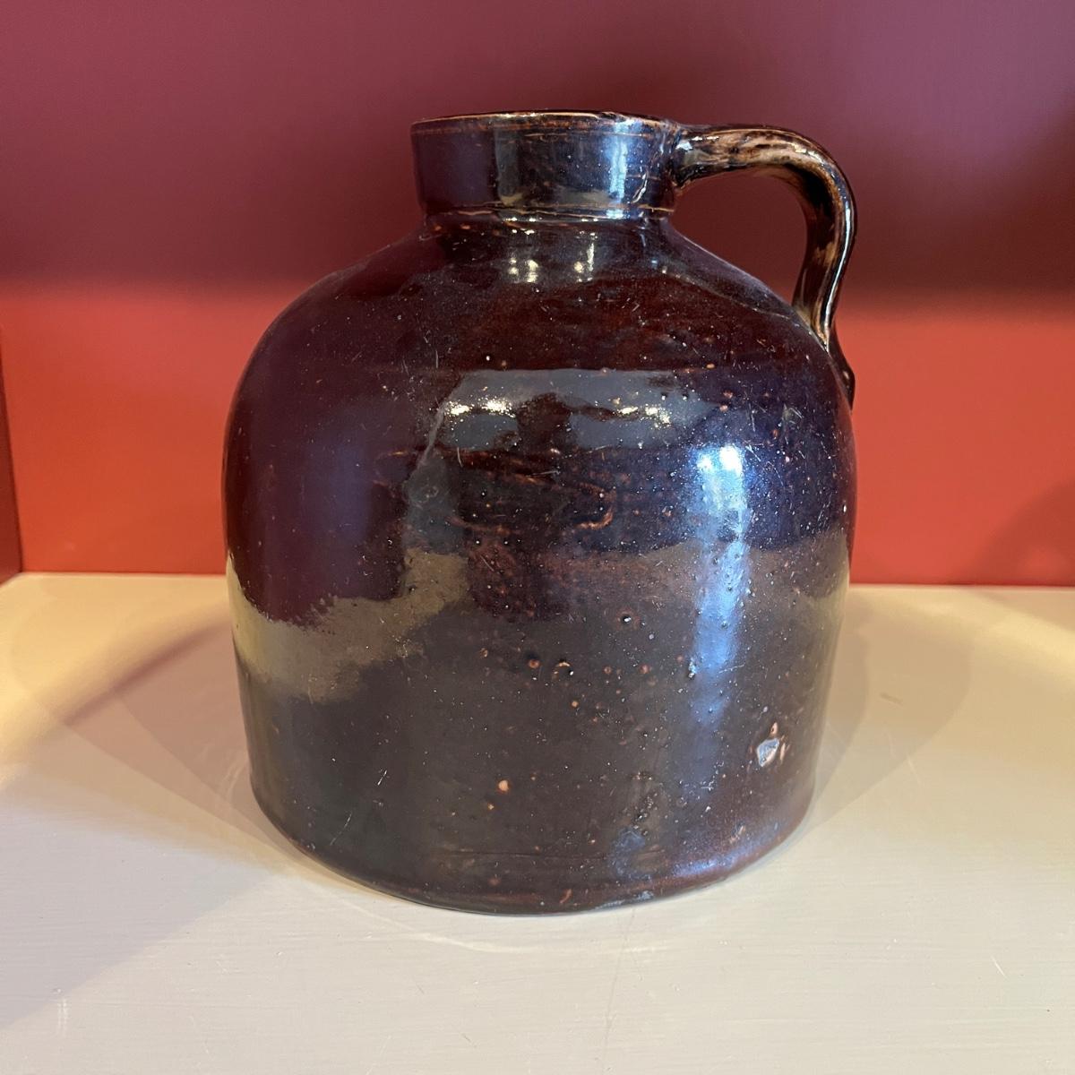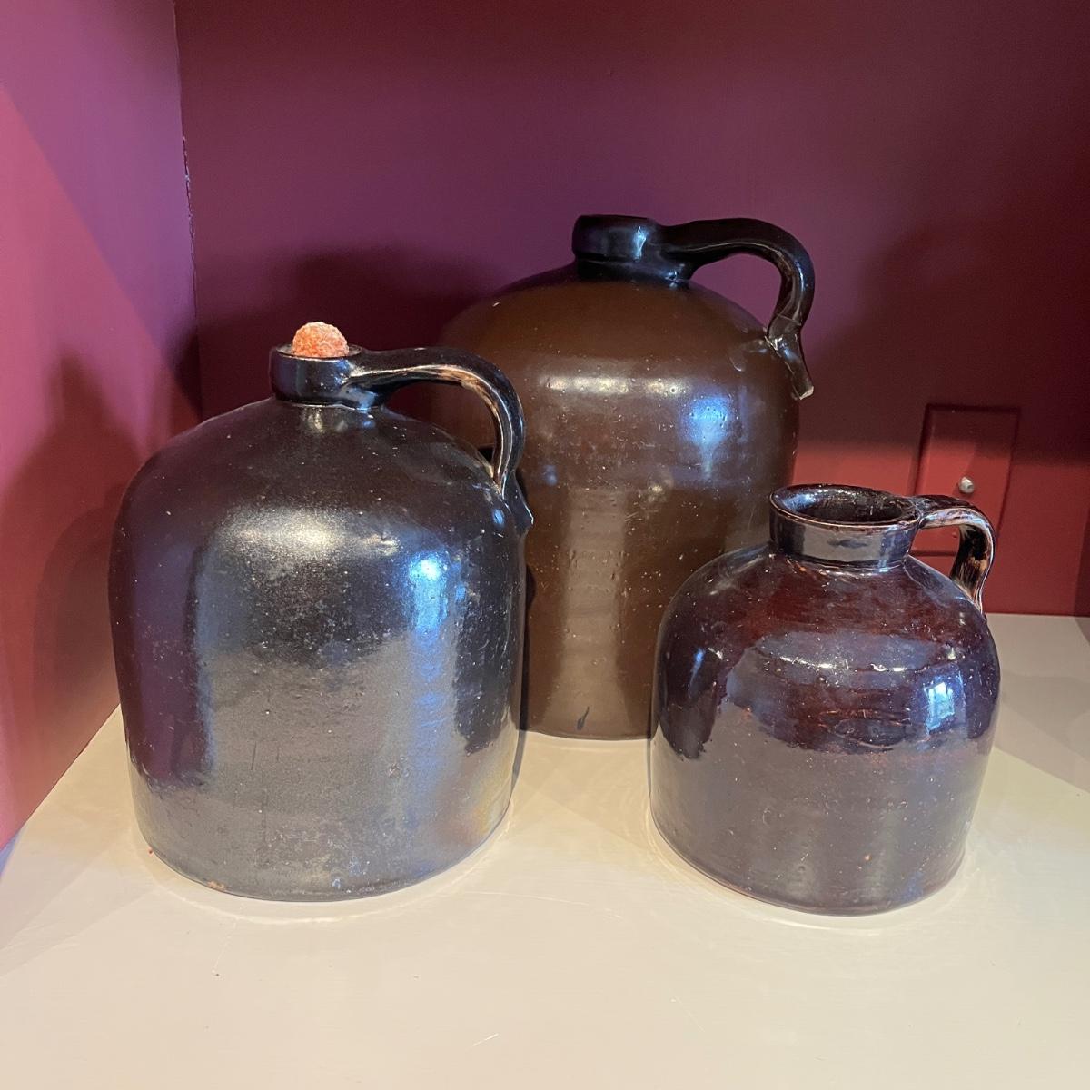 Lot contains three brown pottery jugs in three different sizes. Yes, that is a corncob for a cirk! Largest jug measures 9”D x 11”H and appears to have a crack on the handle, but may also be the glaze, it'shard to decifer, see picture. Jugs are unmarked.