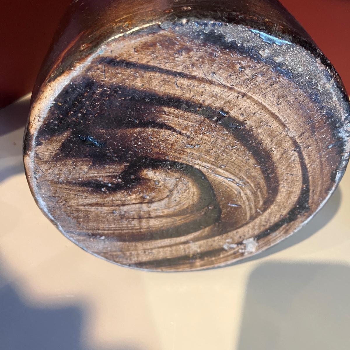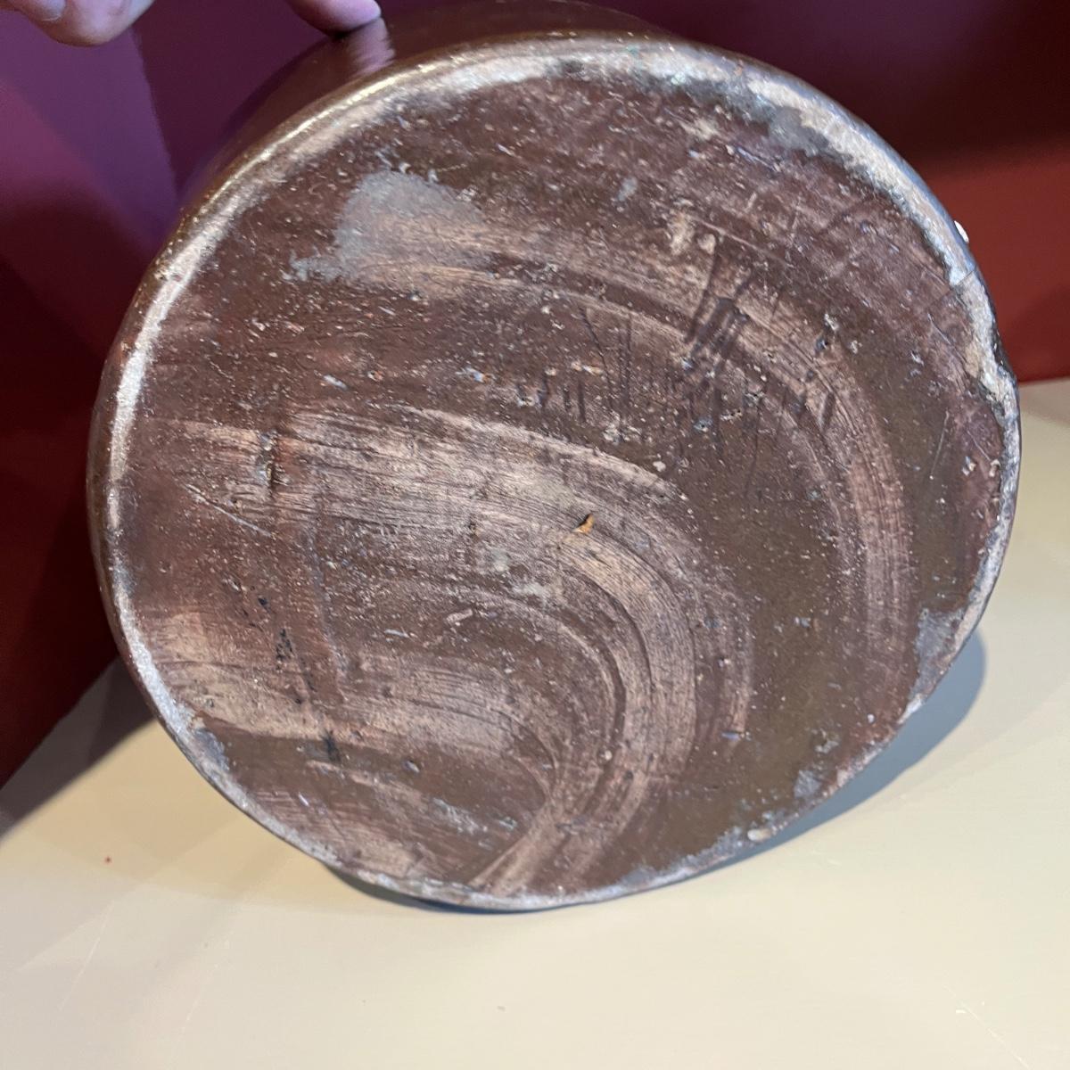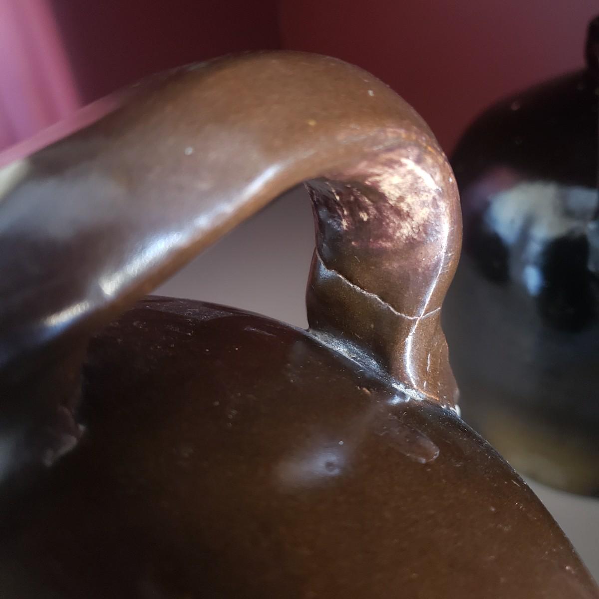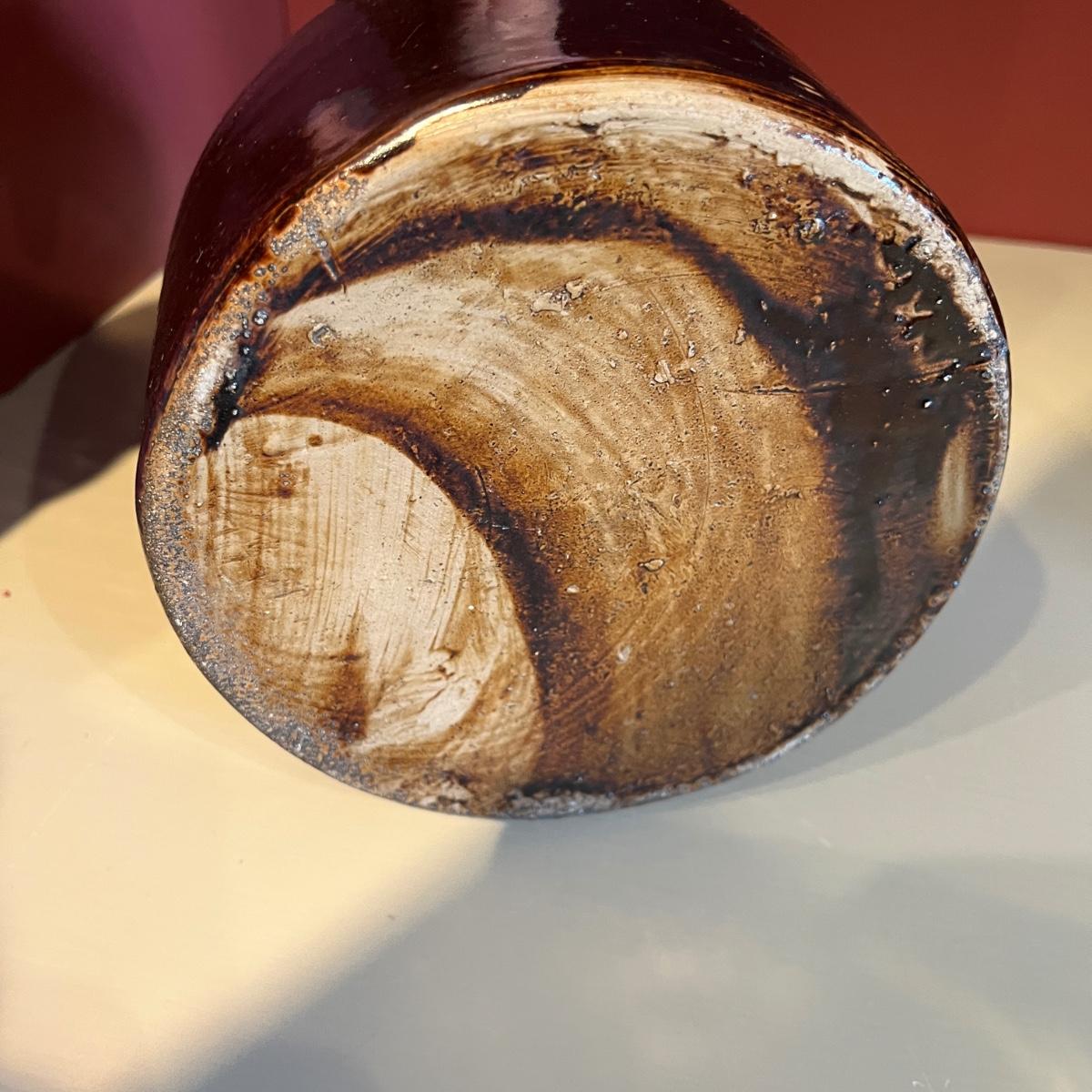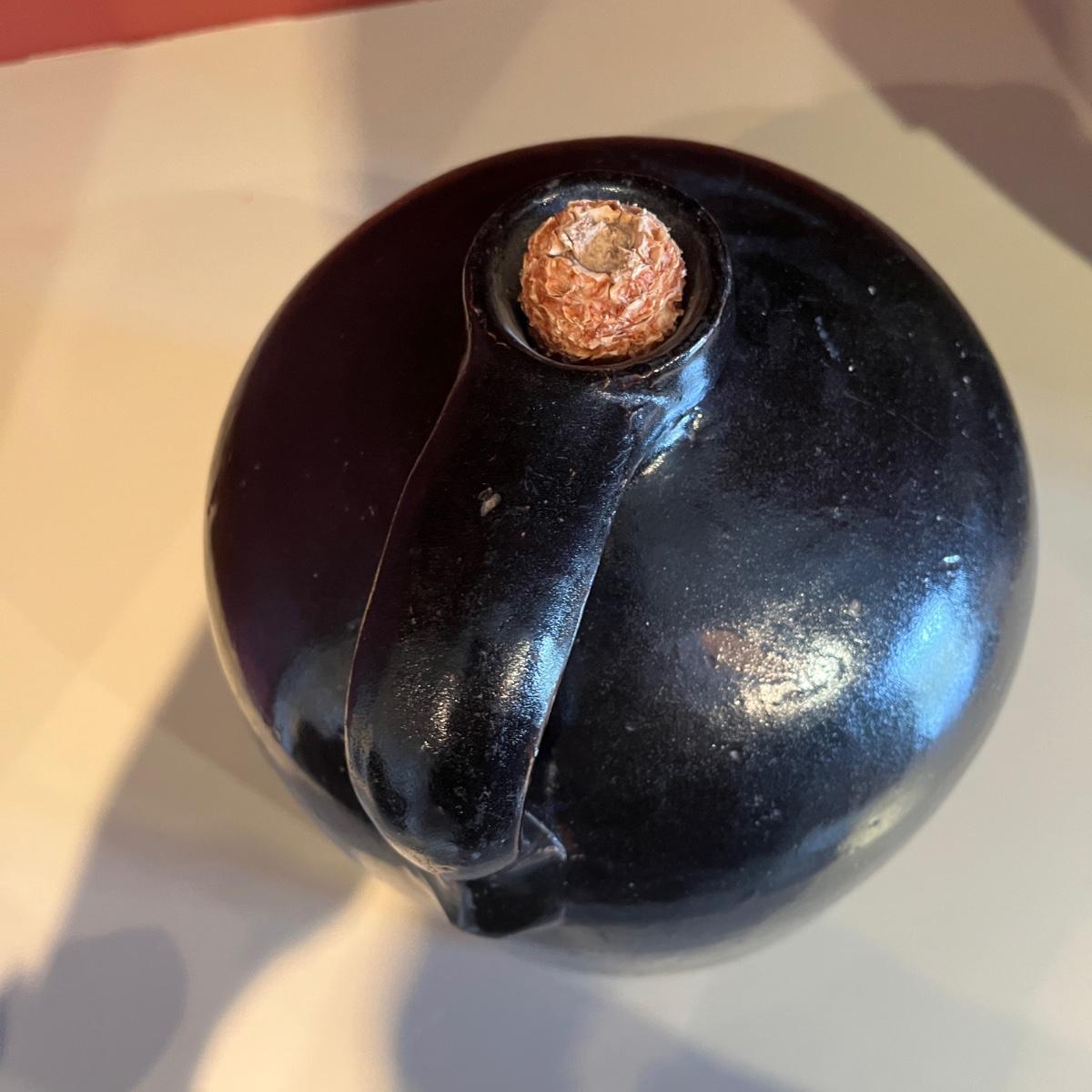 Lot contains three brown pottery jugs in three different sizes. Yes, that is a corncob for a cirk! Largest jug measures 9”D x 11”H and appears to have a crack on the handle, but may also be the glaze, it'shard to decifer, see picture. Jugs are unmarked.