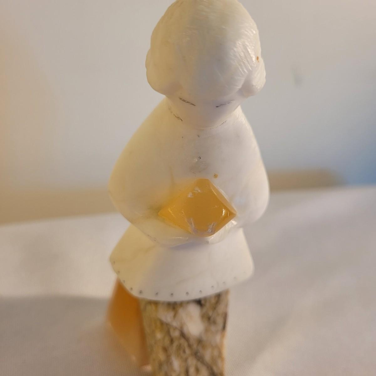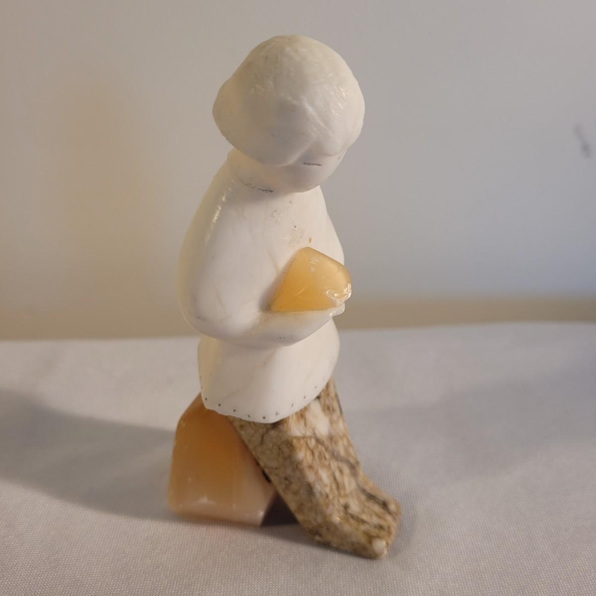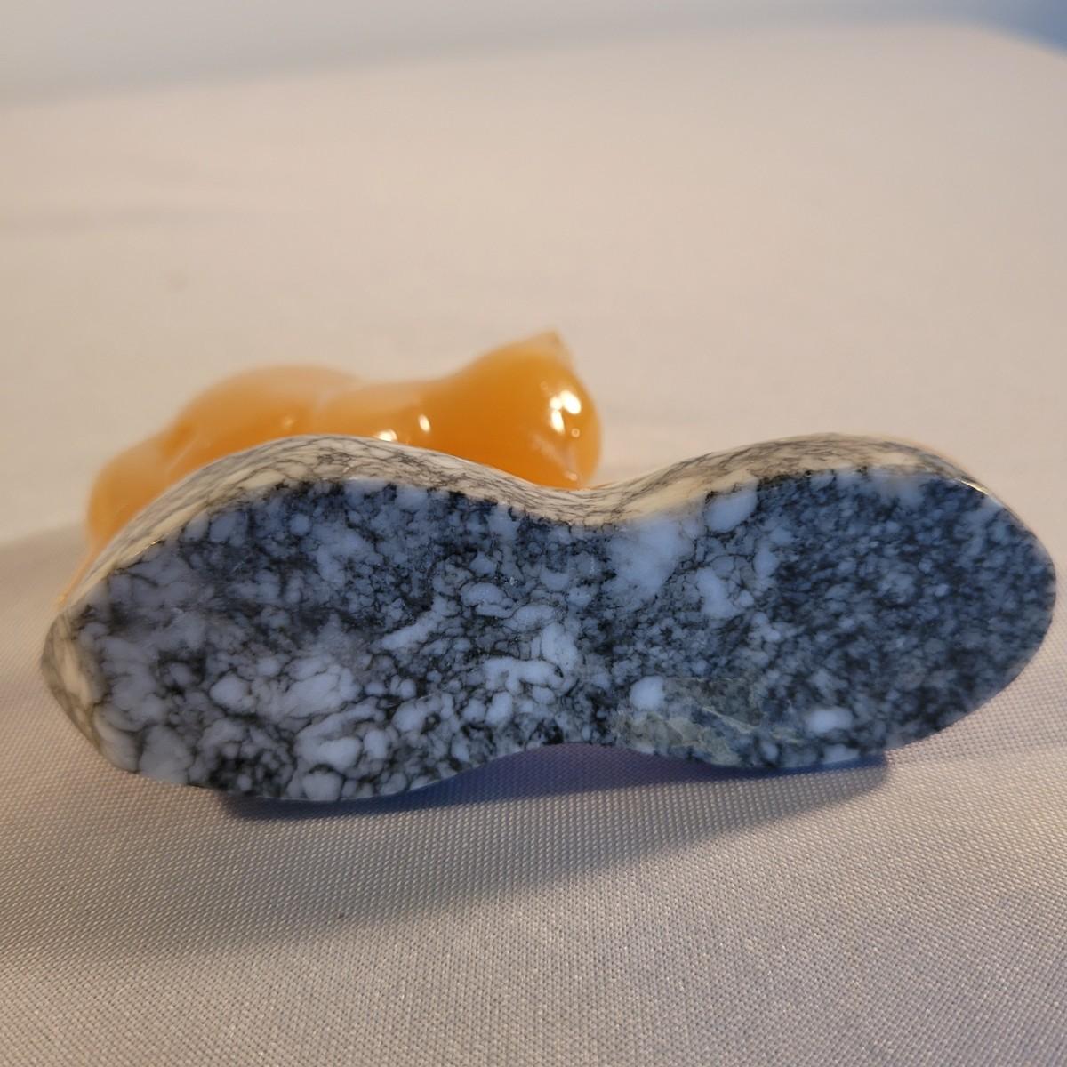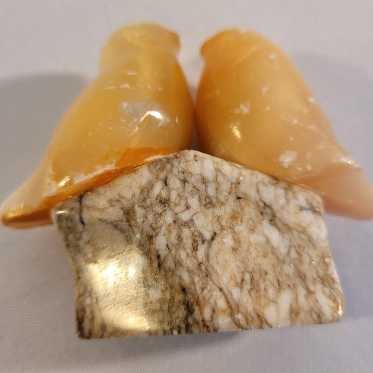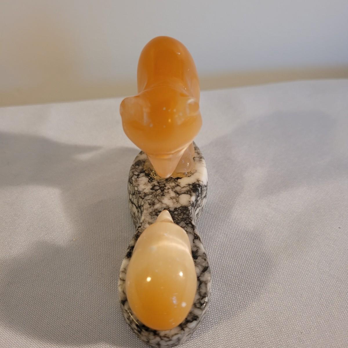 This lot includes what appears to be three calcite mixed figurines. The first figurine is of a woman standing and holding the top of the stone. It appears be made from calcite, marble, and possibly white granite. The figure measures 1.5" x 2.5" x 5"H. It is labeled USSR on the bottom. The second figurine is of a fox and hedgehog. It appears to be made from calcite and marble. The third figurine depicts two birds, beak to beak. It is also made from calcite and marble. The birds show some wear.