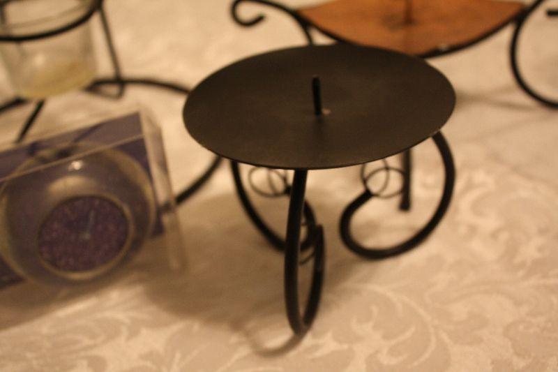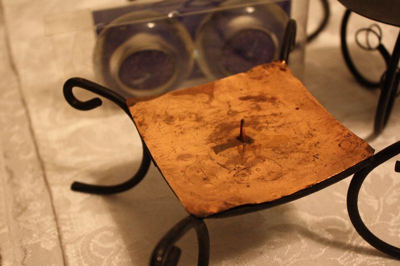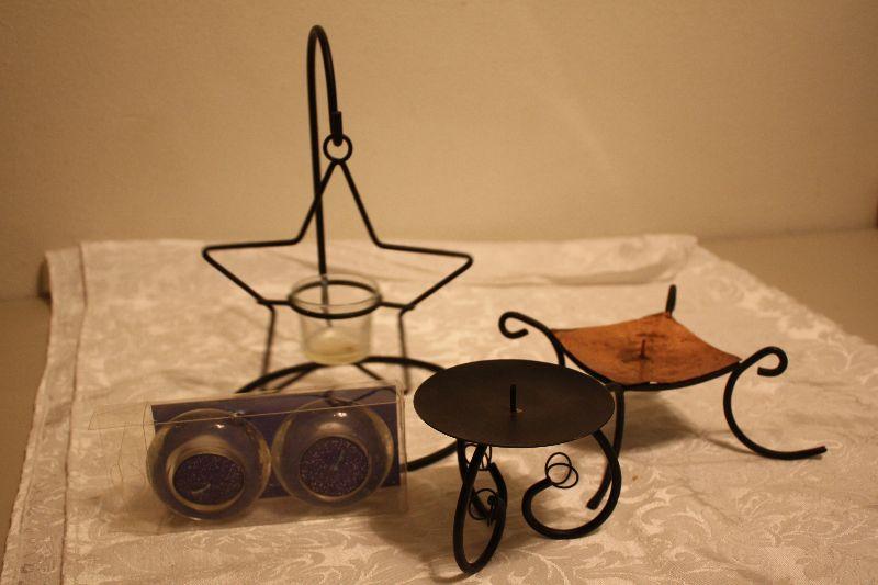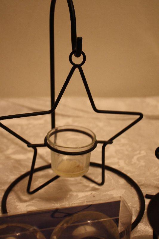 One Black Metal candle holder, One Copper looking Candle holder, One Black metal Star hanging candle holder (10"), Two fancy tea light candles