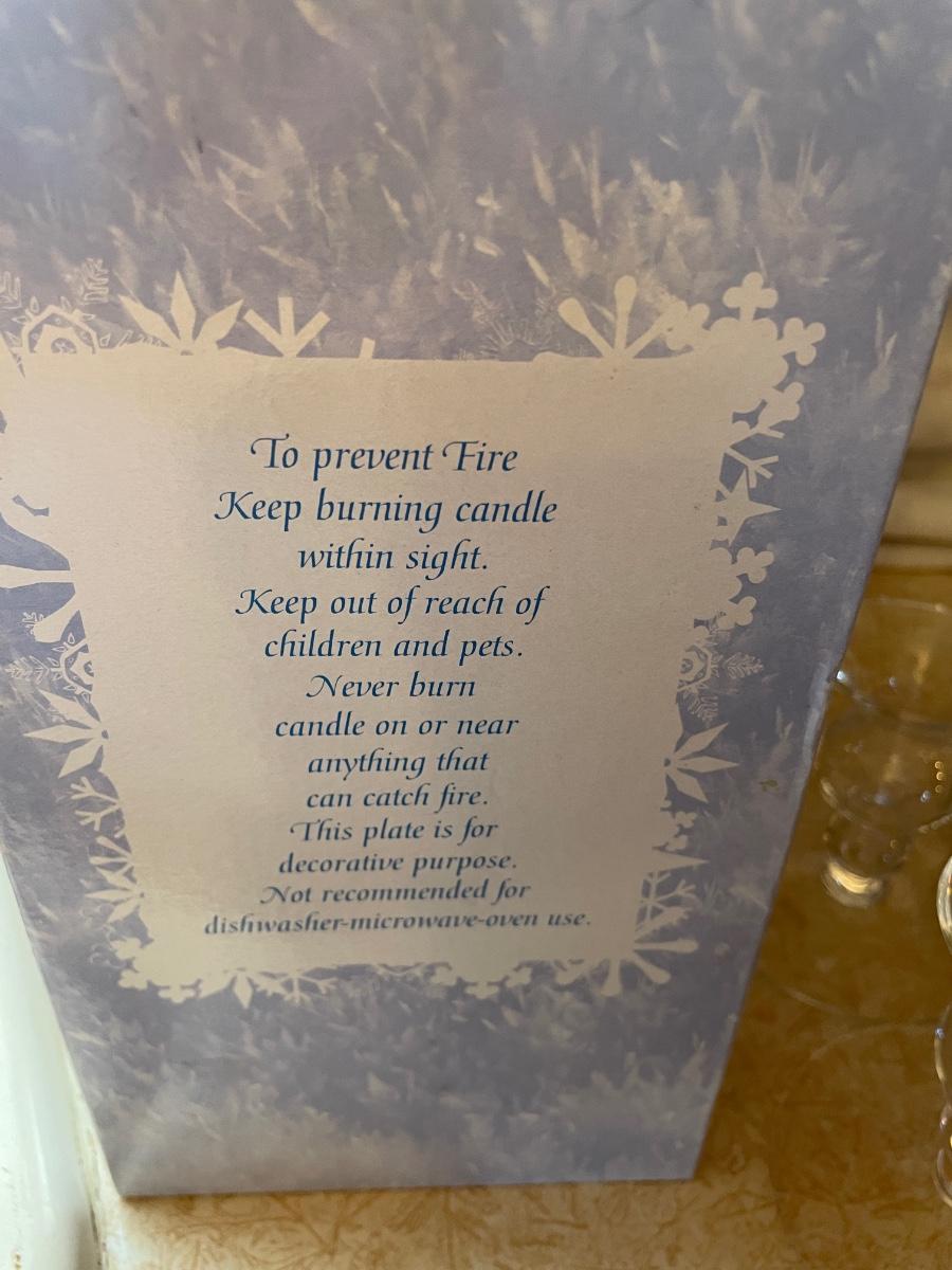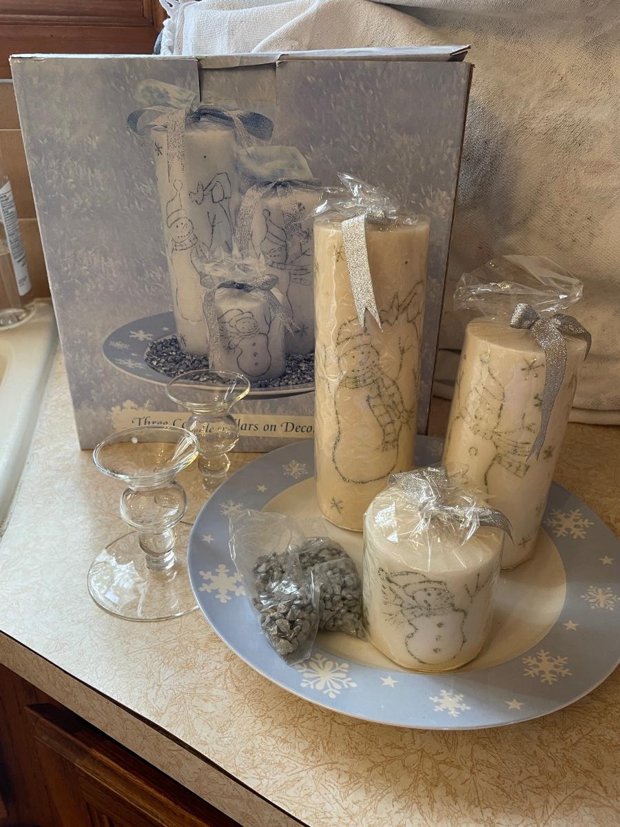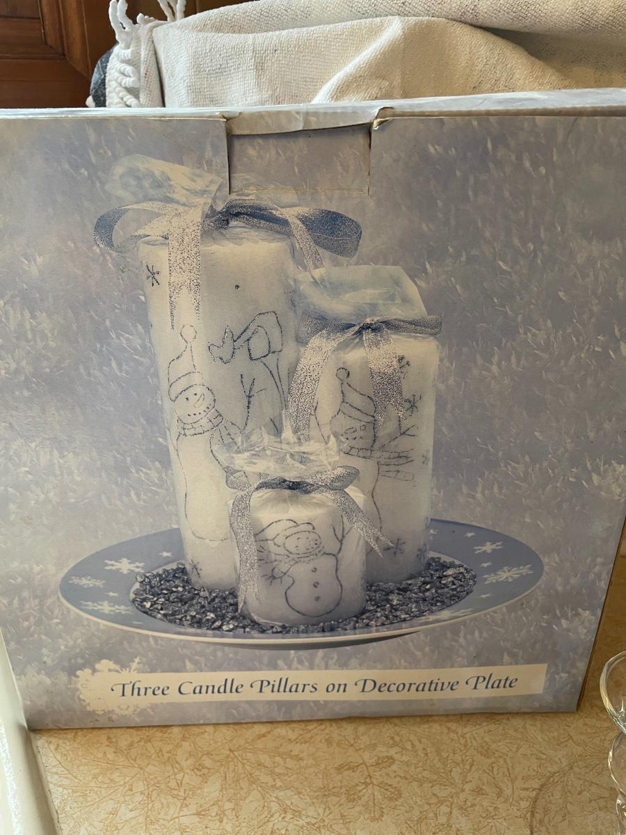 THREE PILLAR CANDLES ON DECORATIVE PLATE