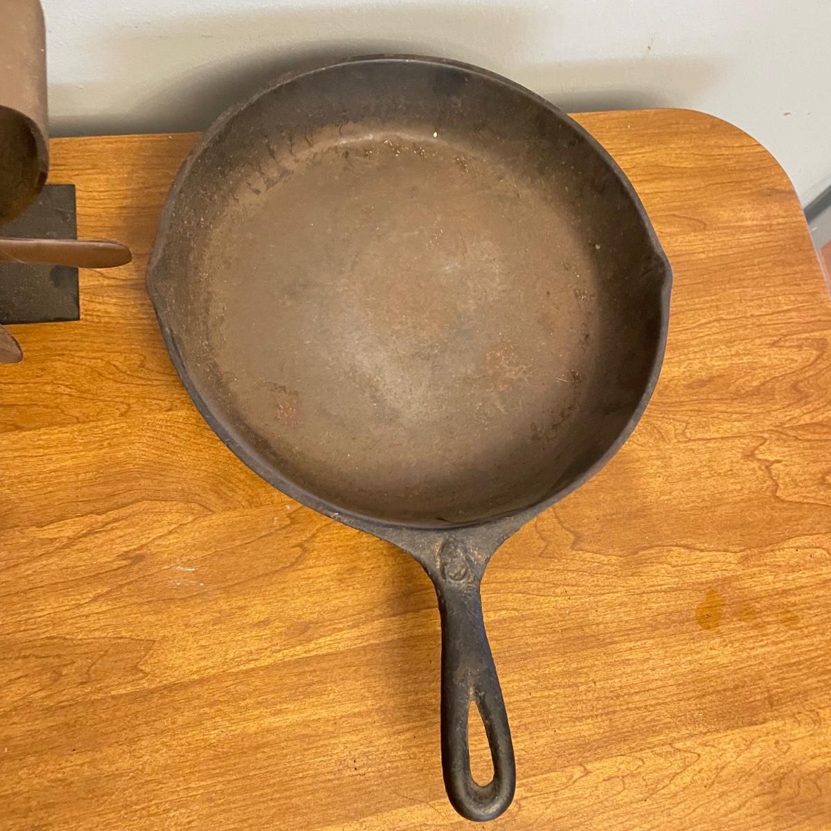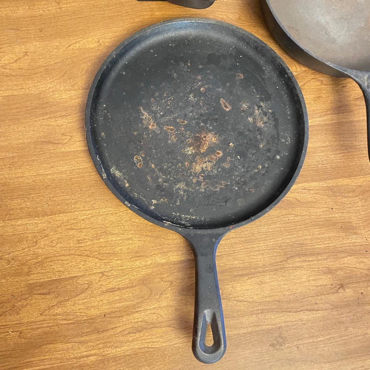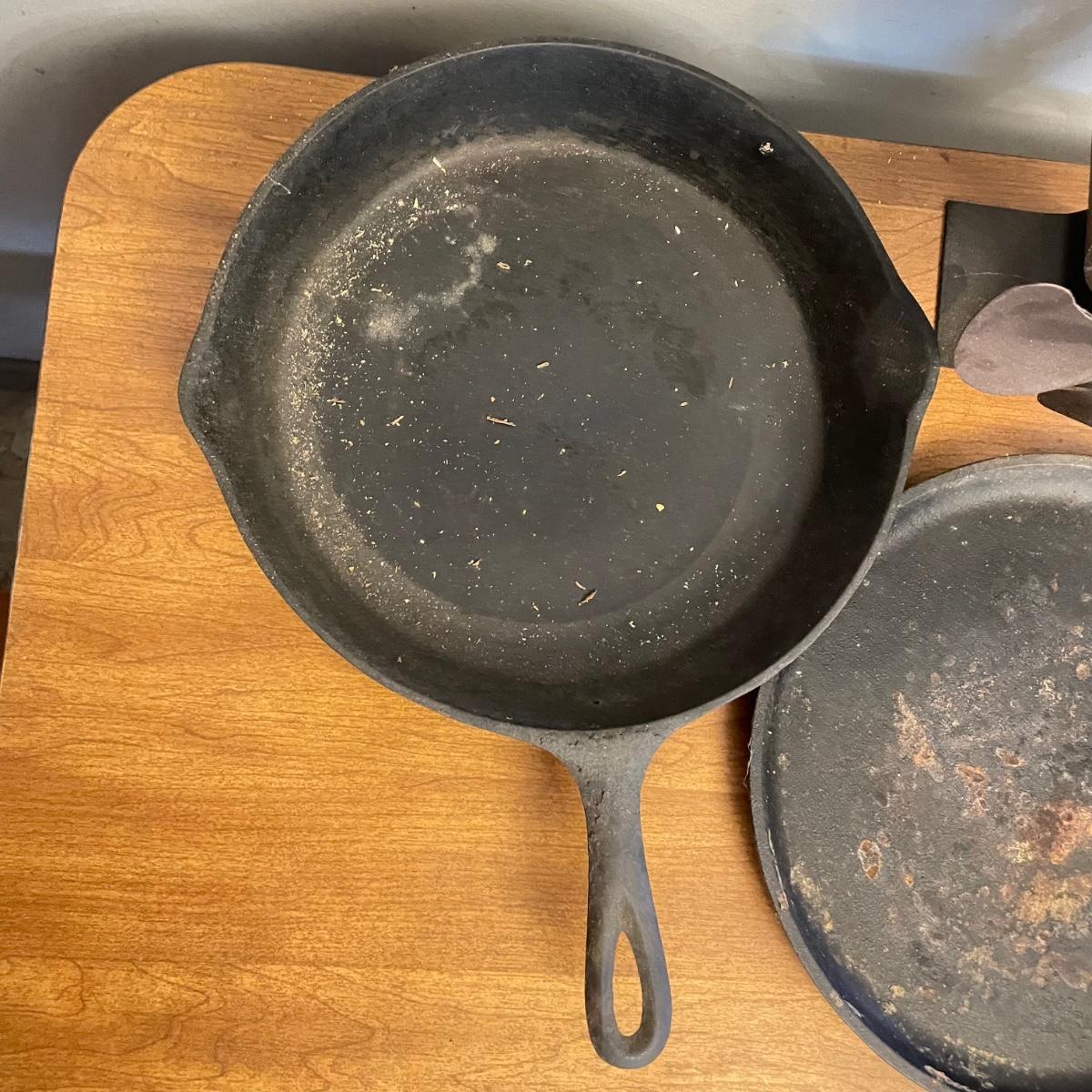 Two number 8 cast iron skillets plus one Lodge 10” griddle. Two pans show rust. Lot also features an Aobosi heat powered stove fan. Fan was not tested and measures 5.5” x 4.5” x 8”. See images. Local pick up only.