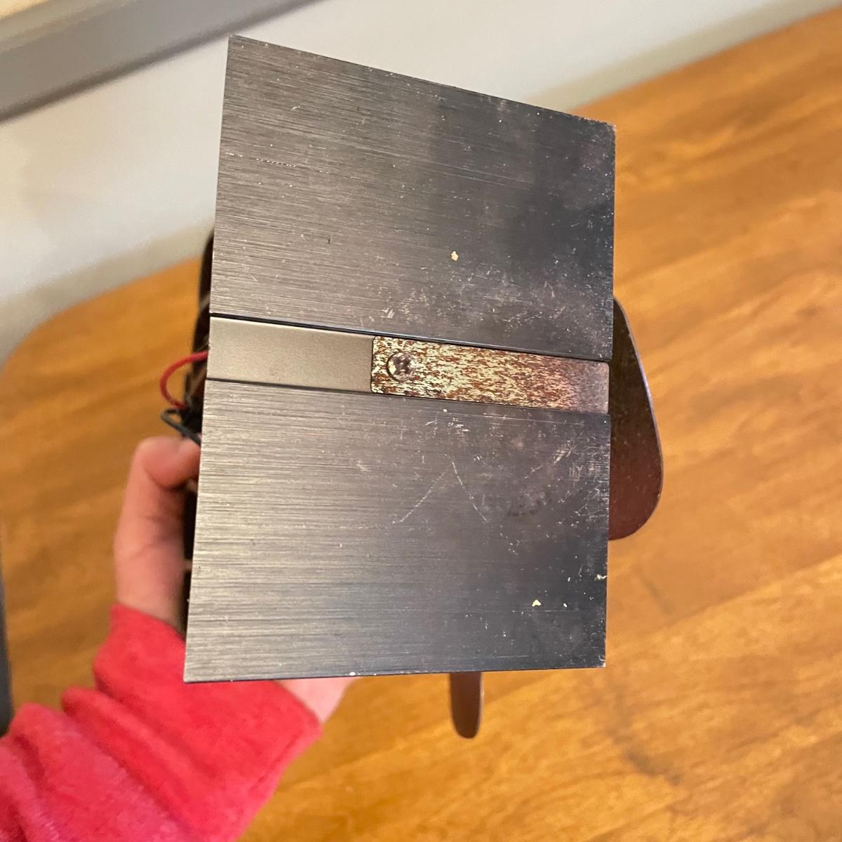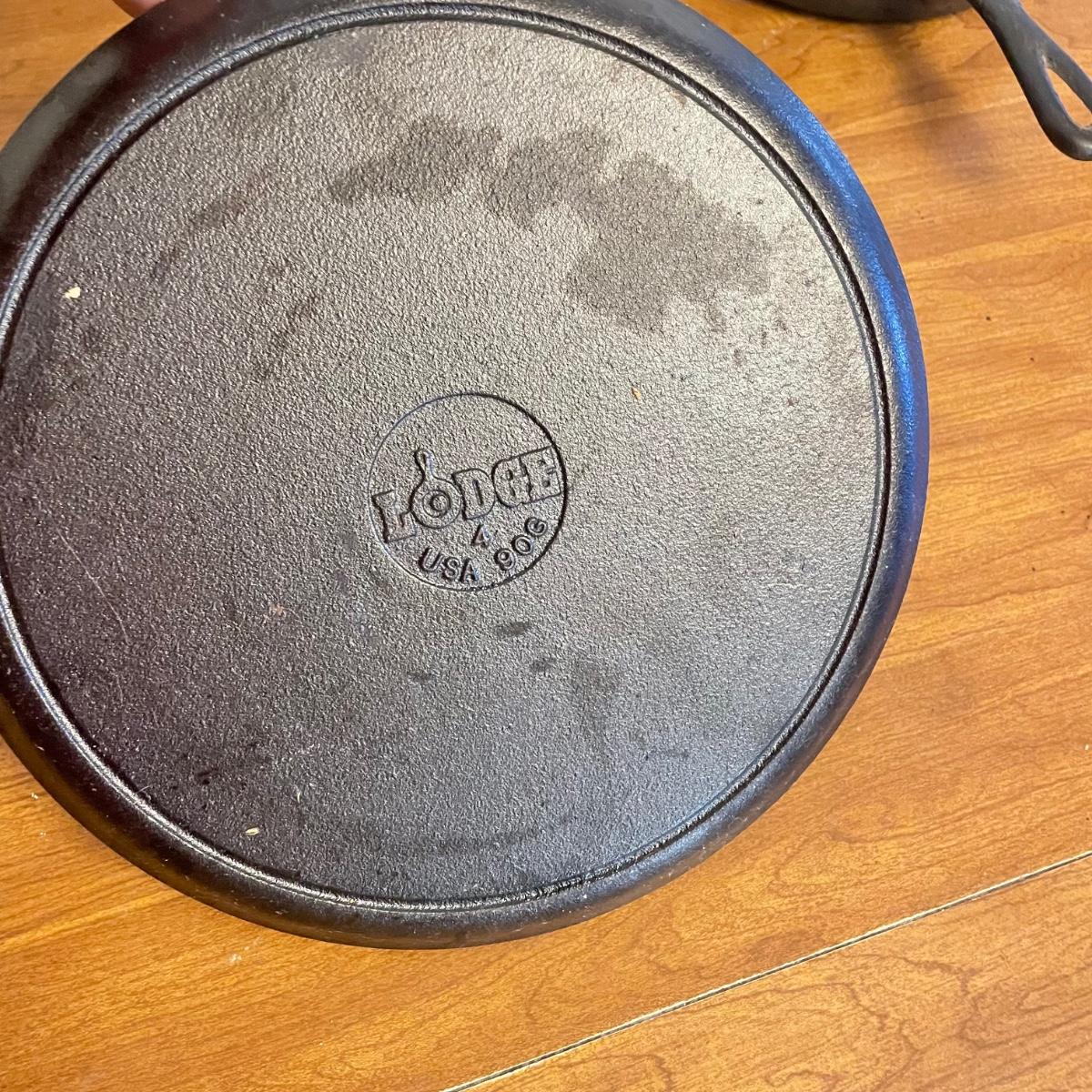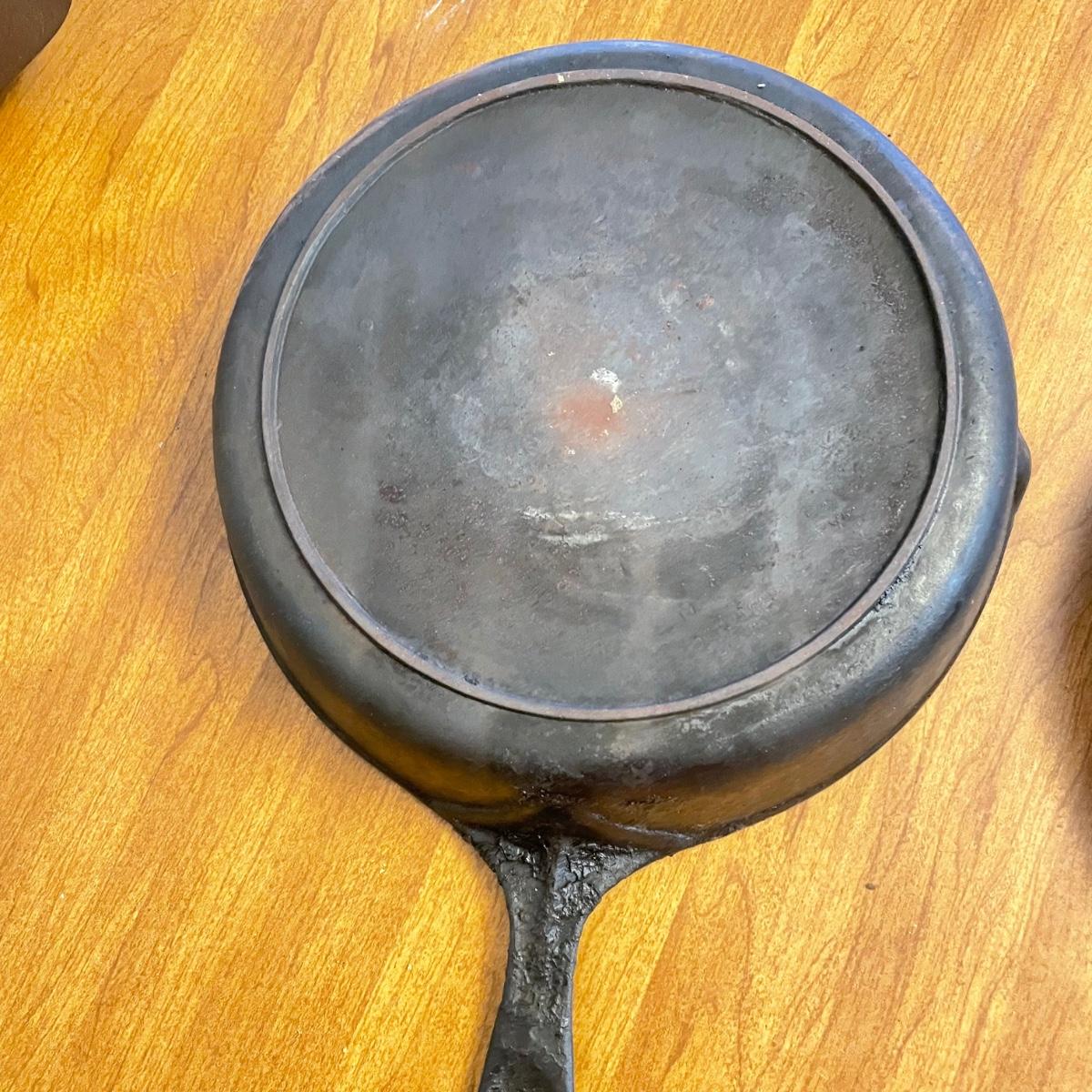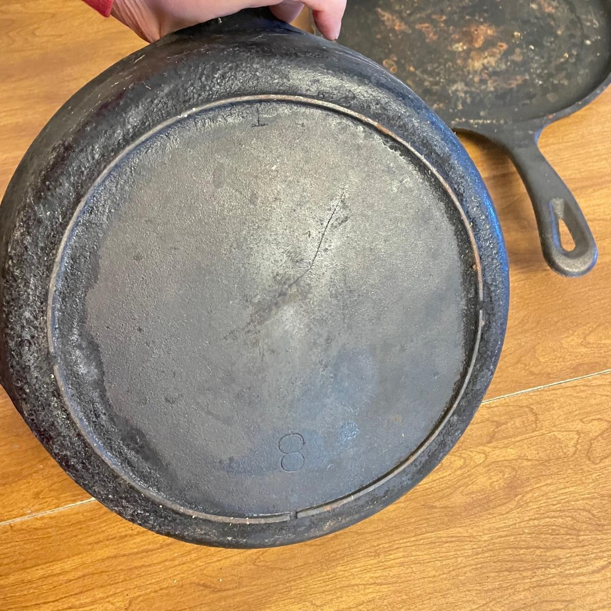 Two number 8 cast iron skillets plus one Lodge 10” griddle. Two pans show rust. Lot also features an Aobosi heat powered stove fan. Fan was not tested and measures 5.5” x 4.5” x 8”. See images. Local pick up only.