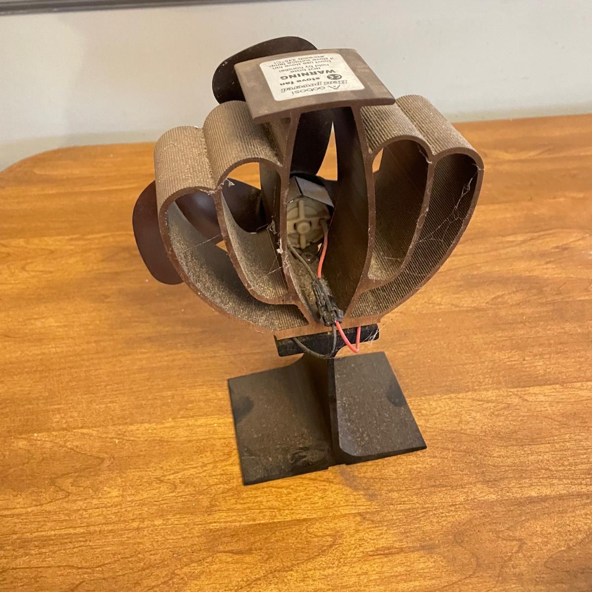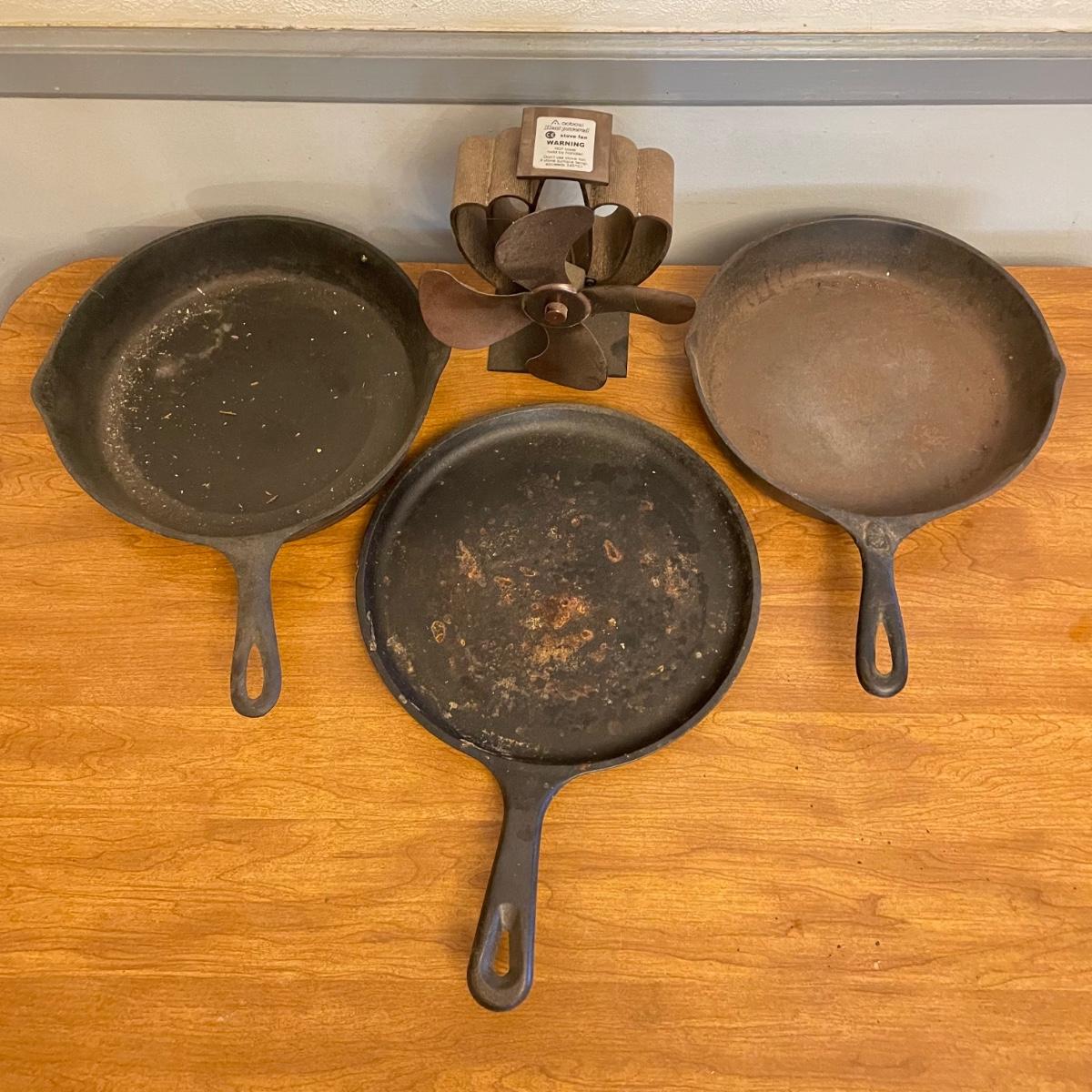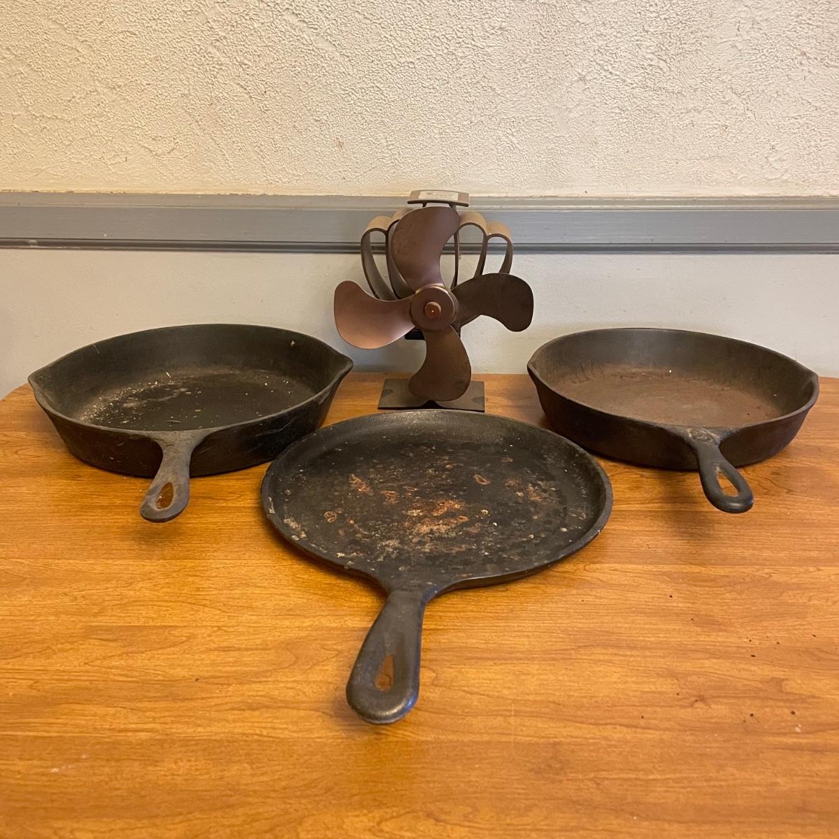 Three Cast Iron Pans and Heat Powered Stove Fan (K - SS)