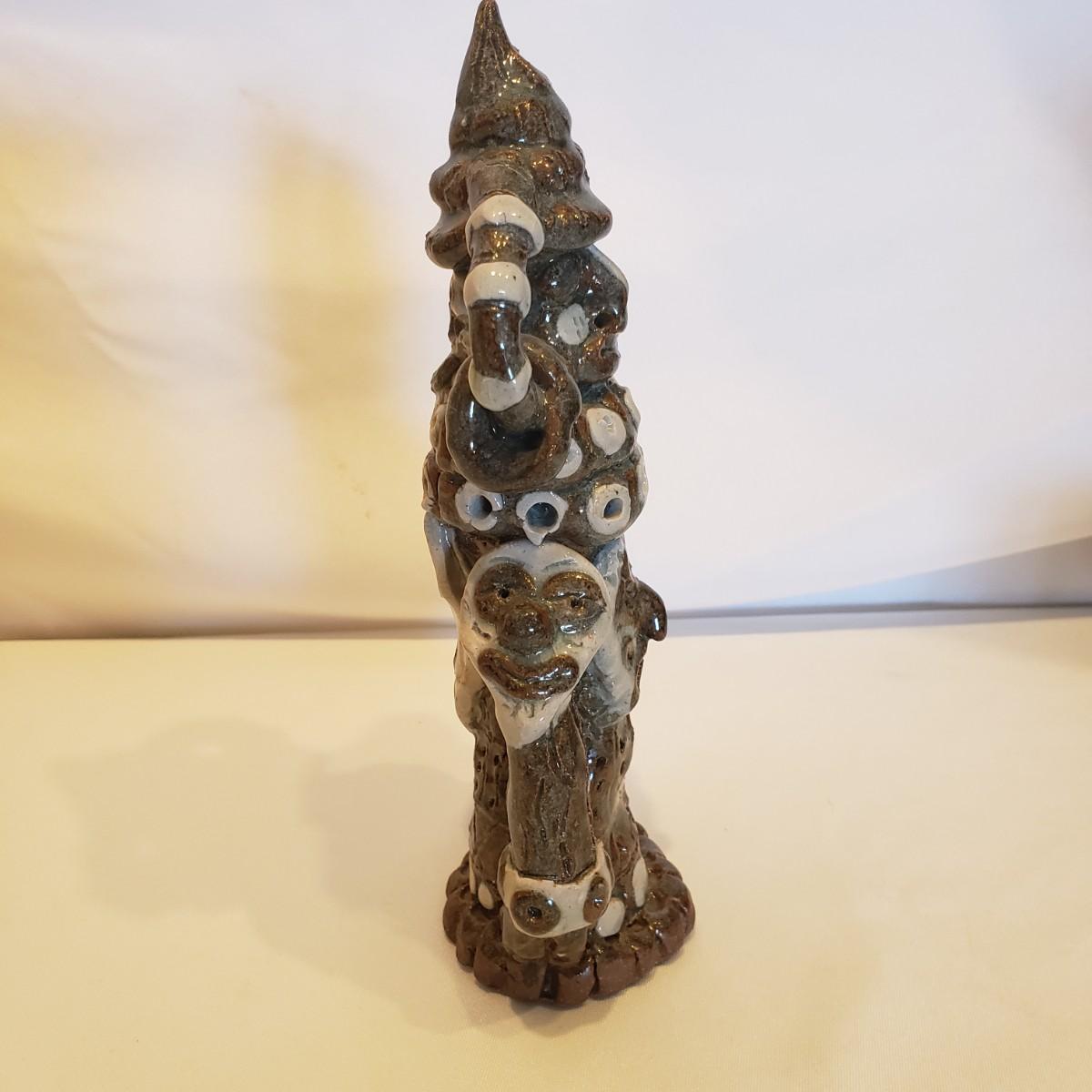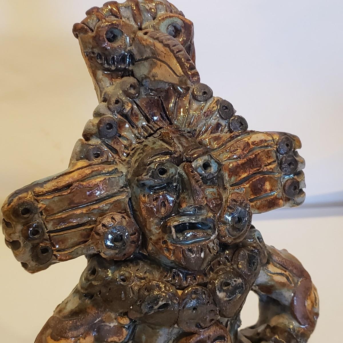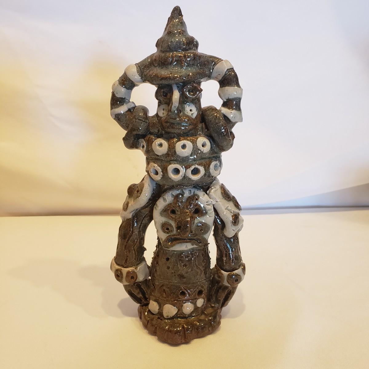 These three ceramic figures were made by artist A. B. and appear to be unknown deities. Each piece has exquisite details, please see pictures. The figure on the horse measures 9" x 4" x 10"H. They are on the heavier side. Shipping available. Shipping can be costly. We suggest contacting our preferred local shipping provider, Postage Express, with dimensions and getting an estimate before bidding: (828) 255-9250 or shipping@postageexpressnc.com.