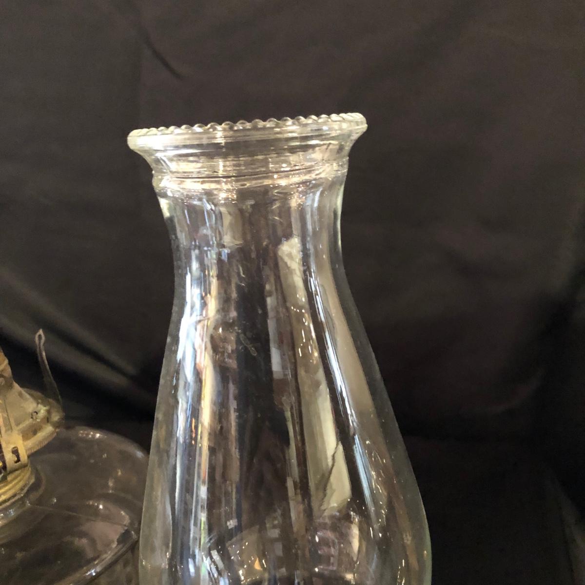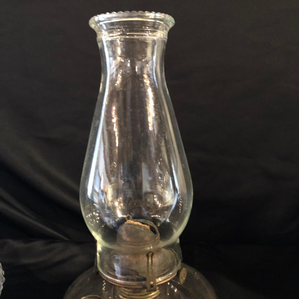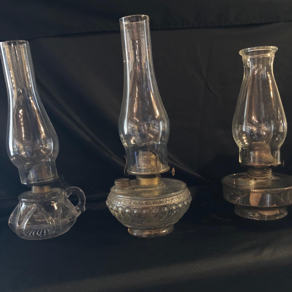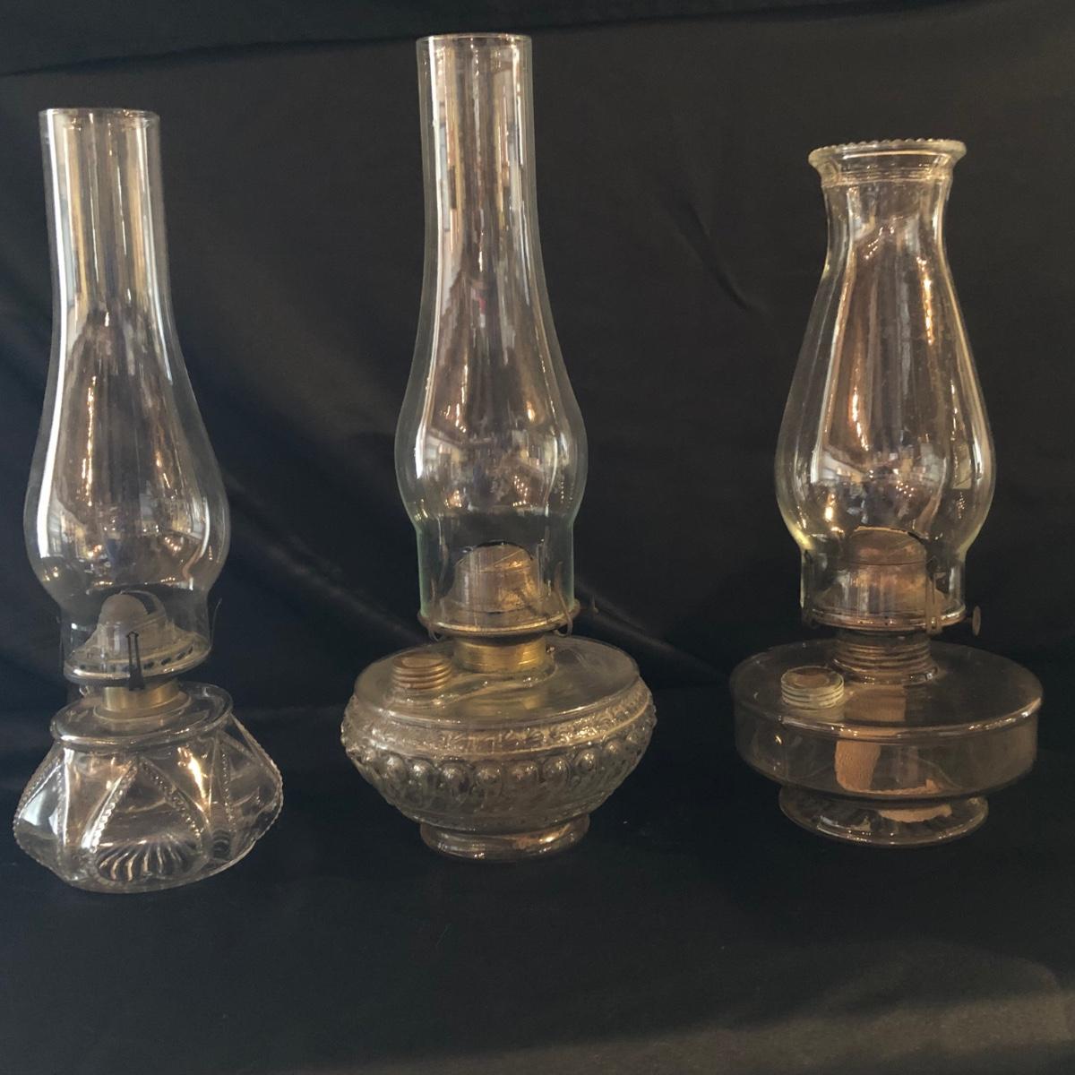 All 3 lamps have knobs to turn the wick and two of the three lamps have wicks. Each oil lamp has a chimney and intact bowls with no cracks or chips. The tallest measures 14.5” with a bowl of about 6”. The shortest chimney has a beaded top and stands 13” tall. Shipping Available.