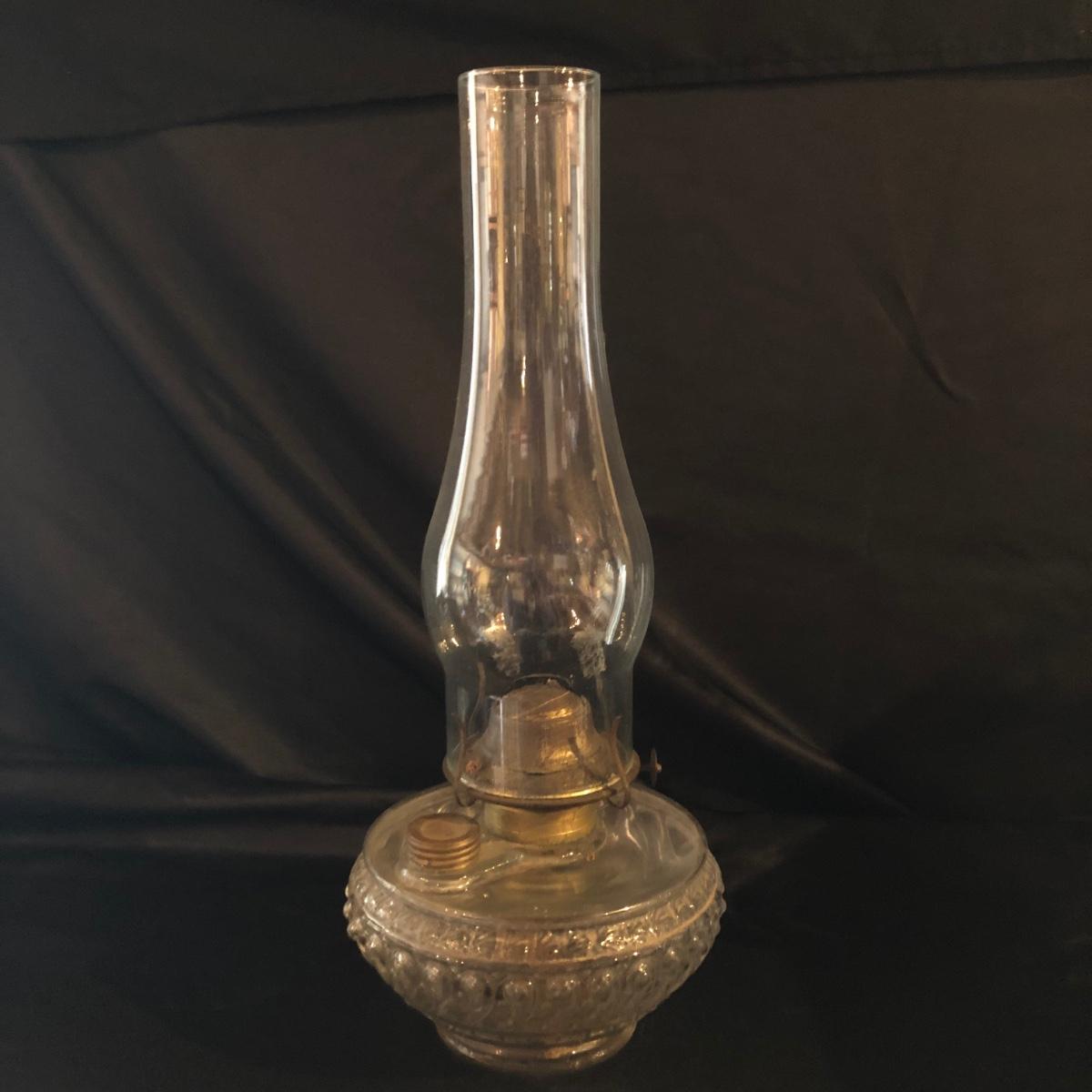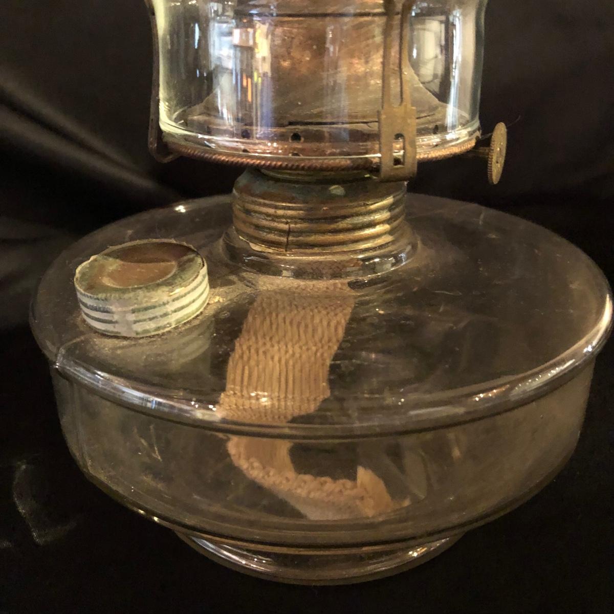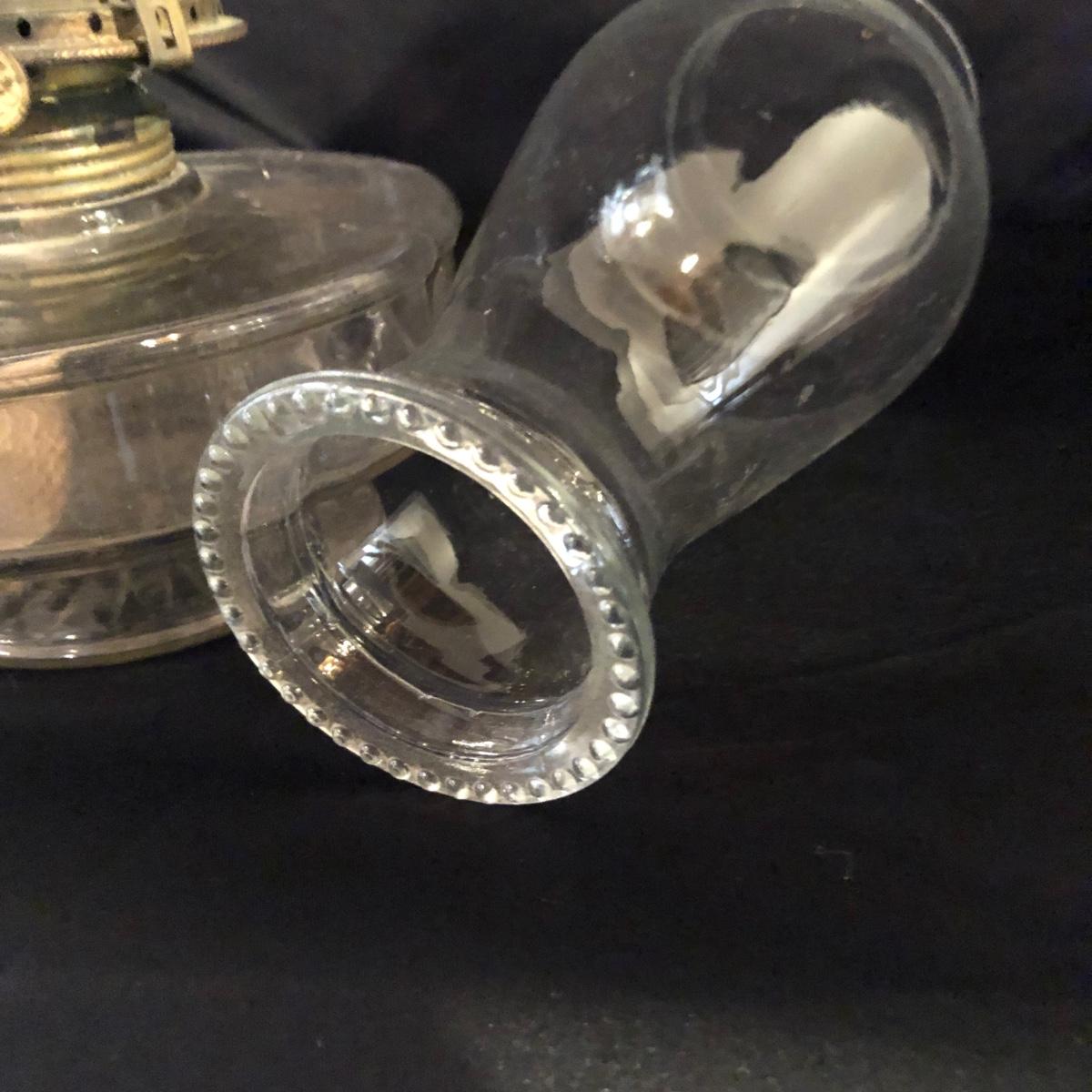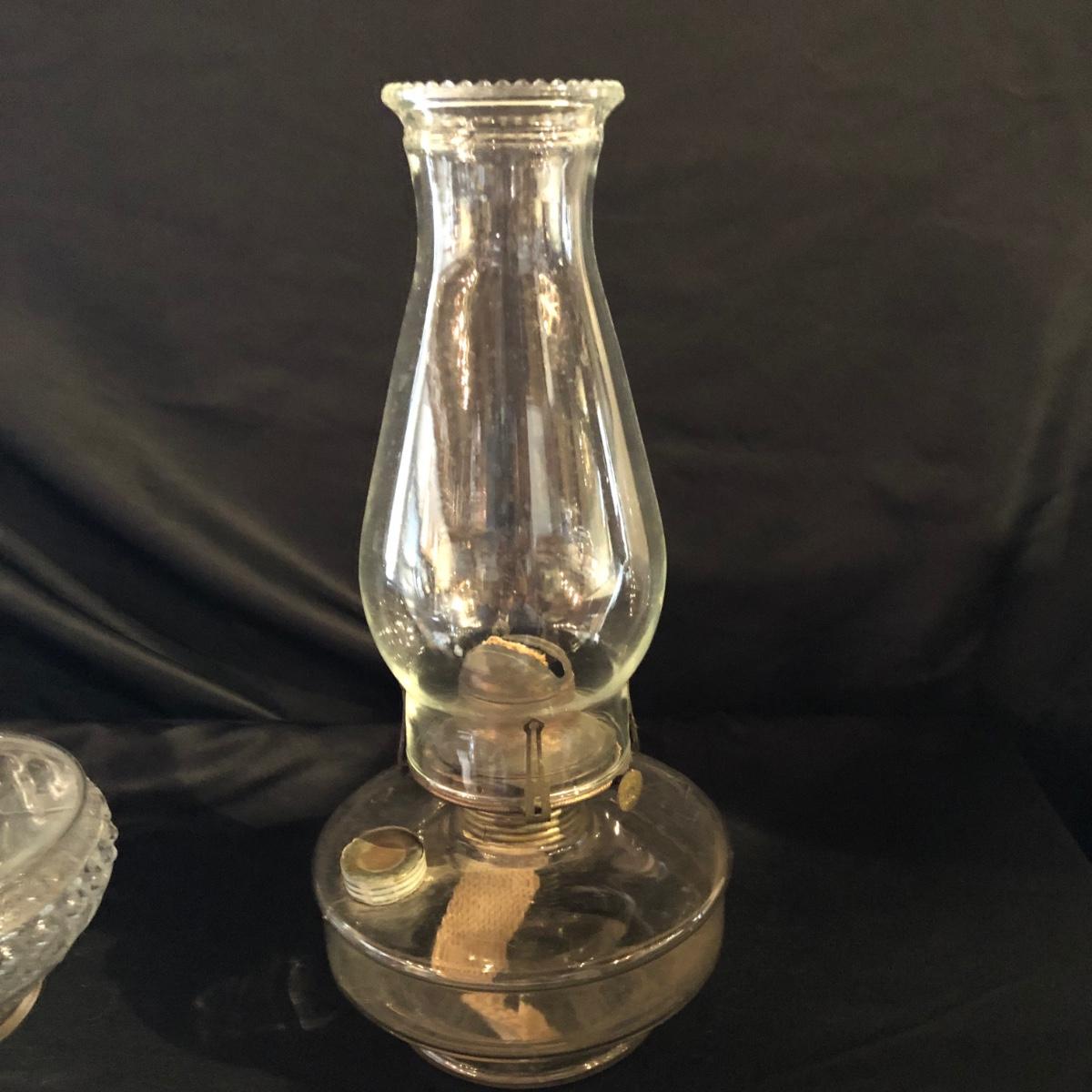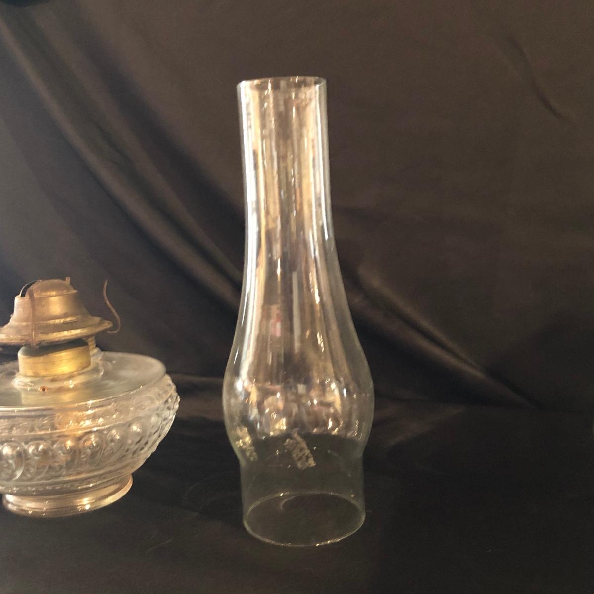 All 3 lamps have knobs to turn the wick and two of the three lamps have wicks. Each oil lamp has a chimney and intact bowls with no cracks or chips. The tallest measures 14.5” with a bowl of about 6”. The shortest chimney has a beaded top and stands 13” tall. Shipping Available.