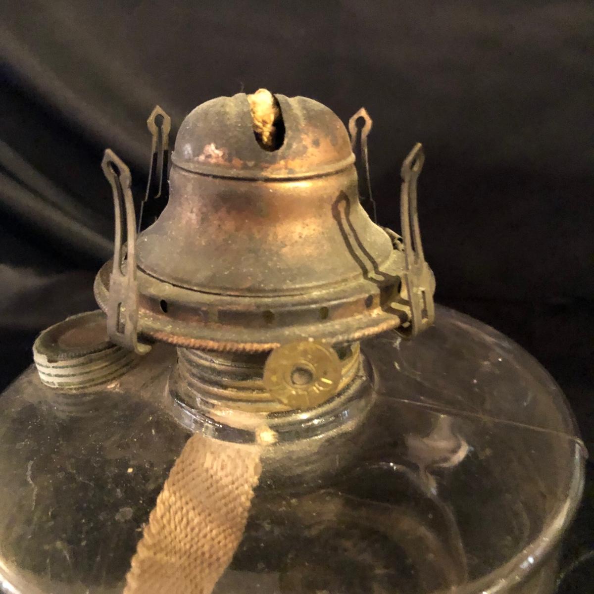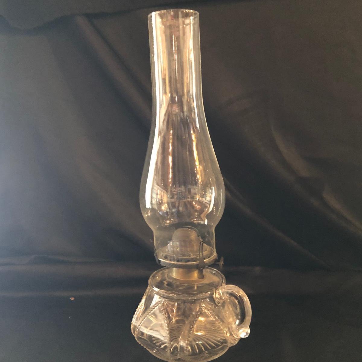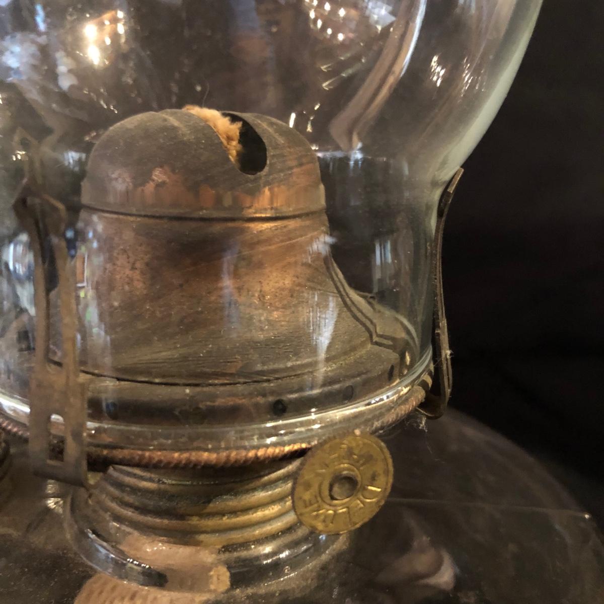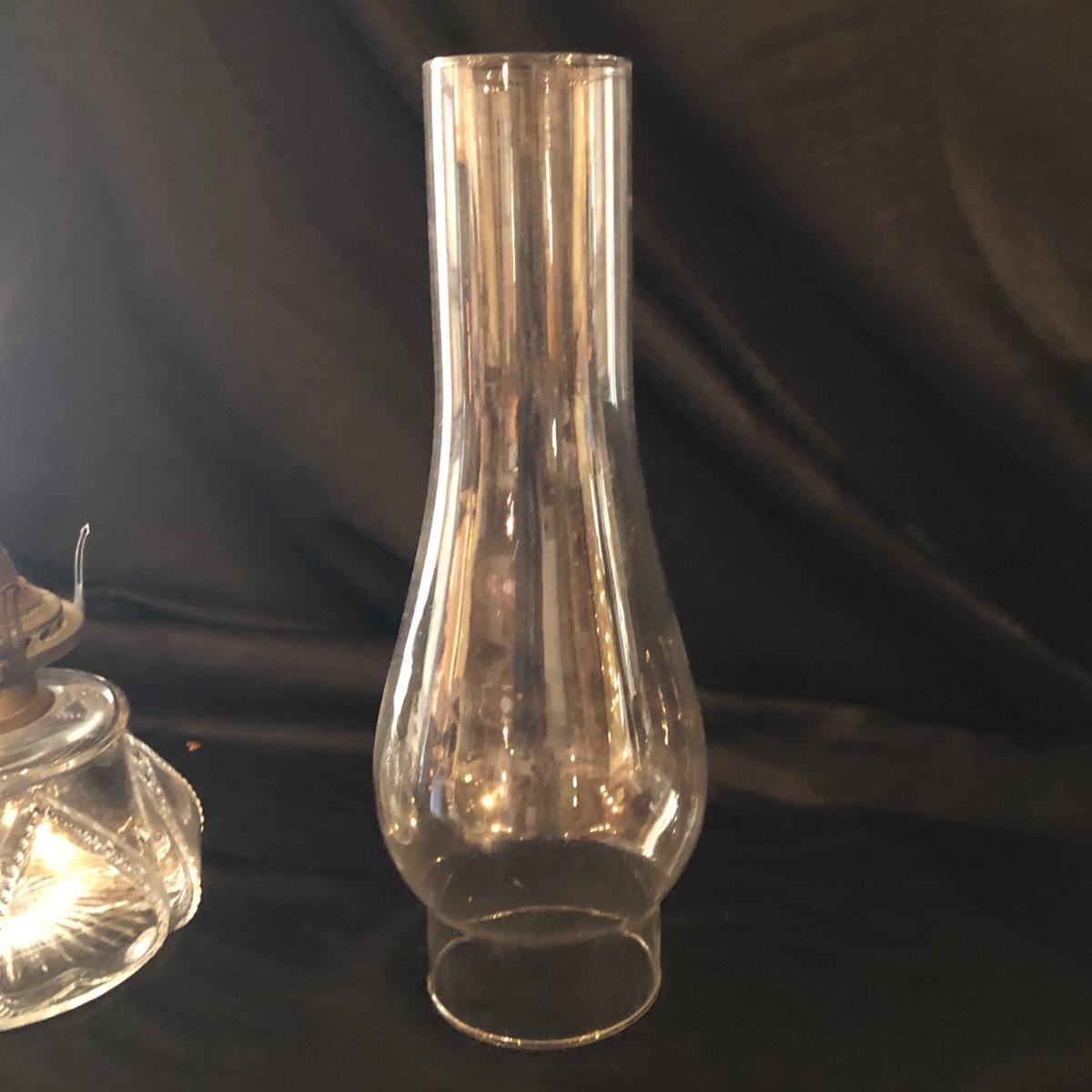 All 3 lamps have knobs to turn the wick and two of the three lamps have wicks. Each oil lamp has a chimney and intact bowls with no cracks or chips. The tallest measures 14.5” with a bowl of about 6”. The shortest chimney has a beaded top and stands 13” tall. Shipping Available.