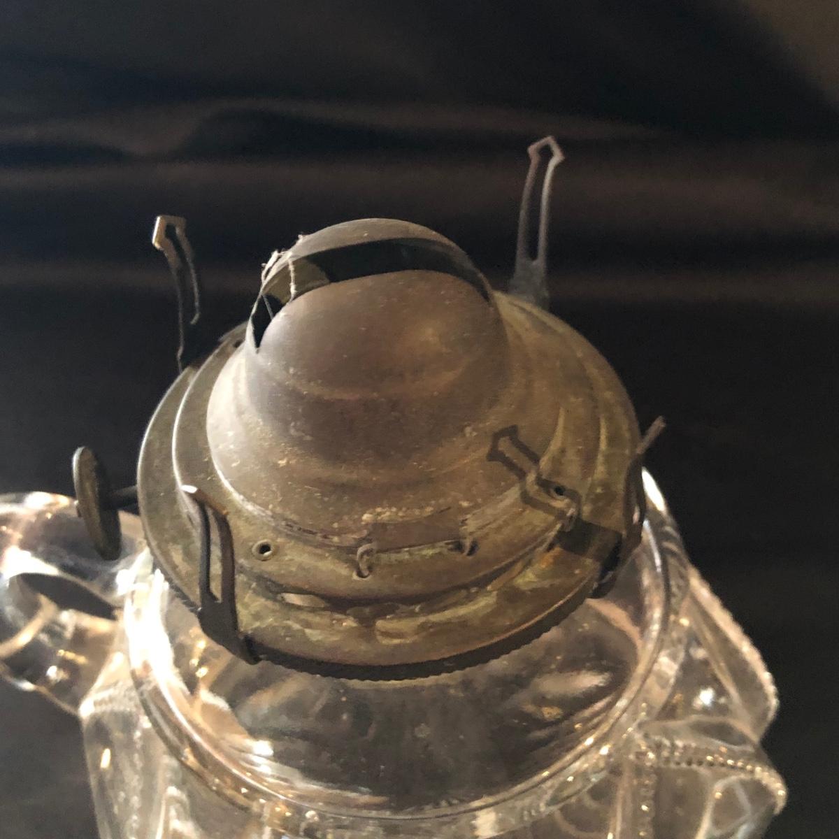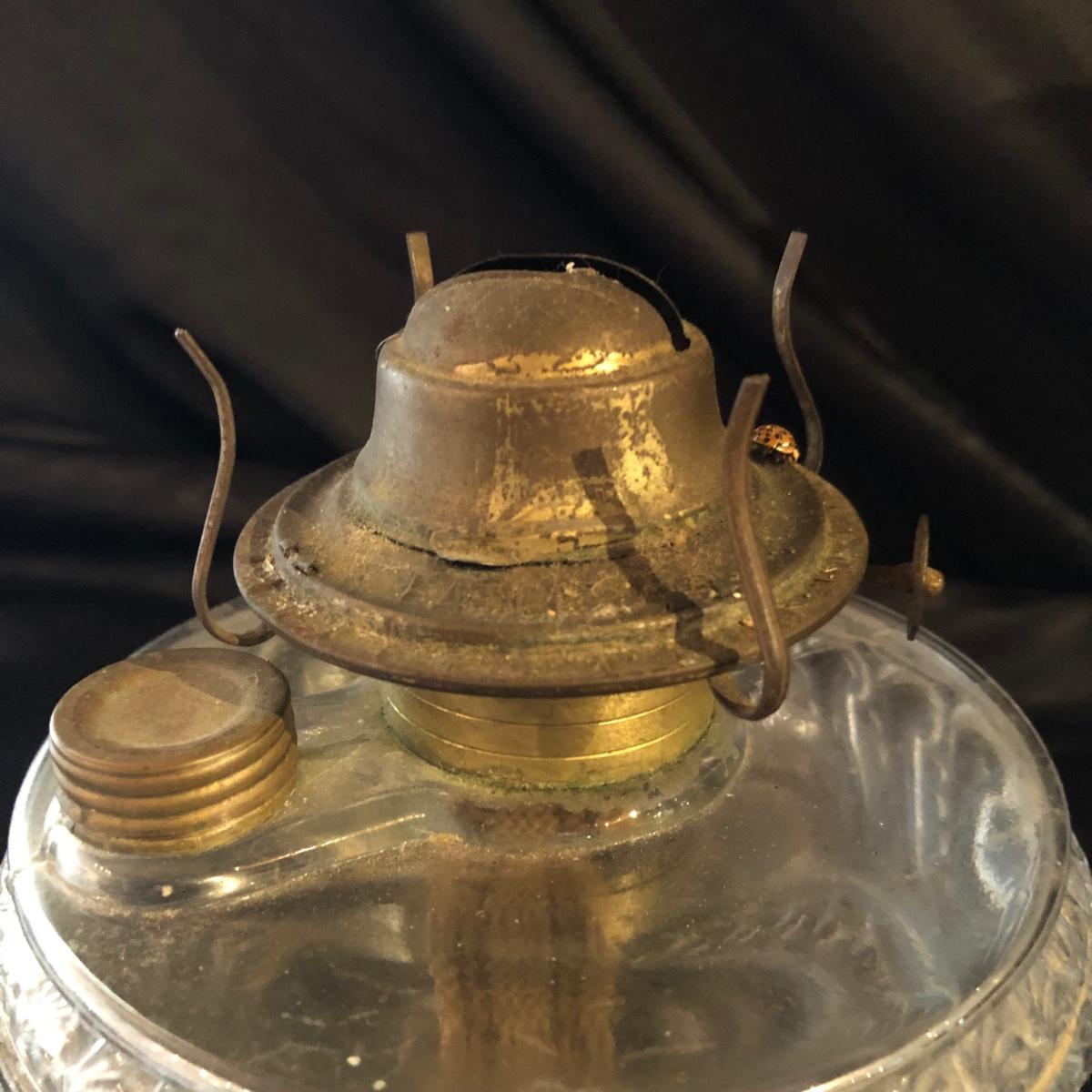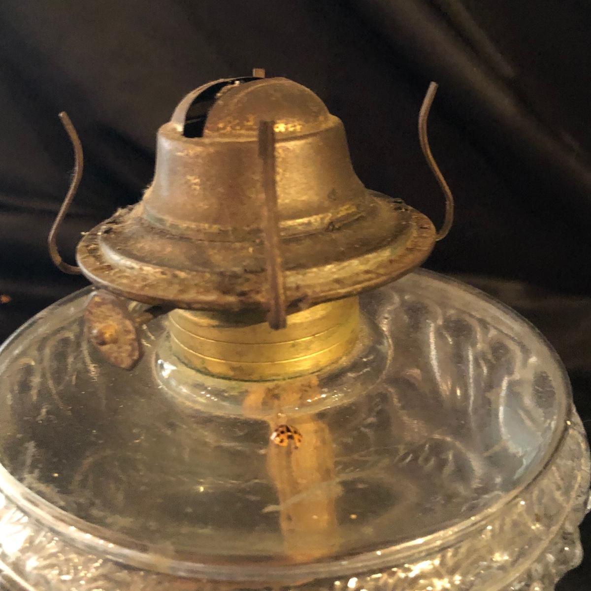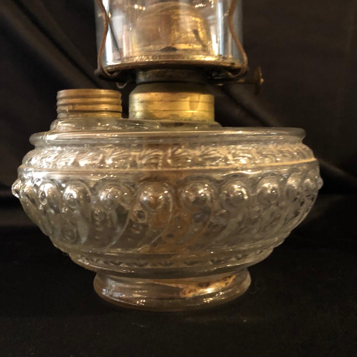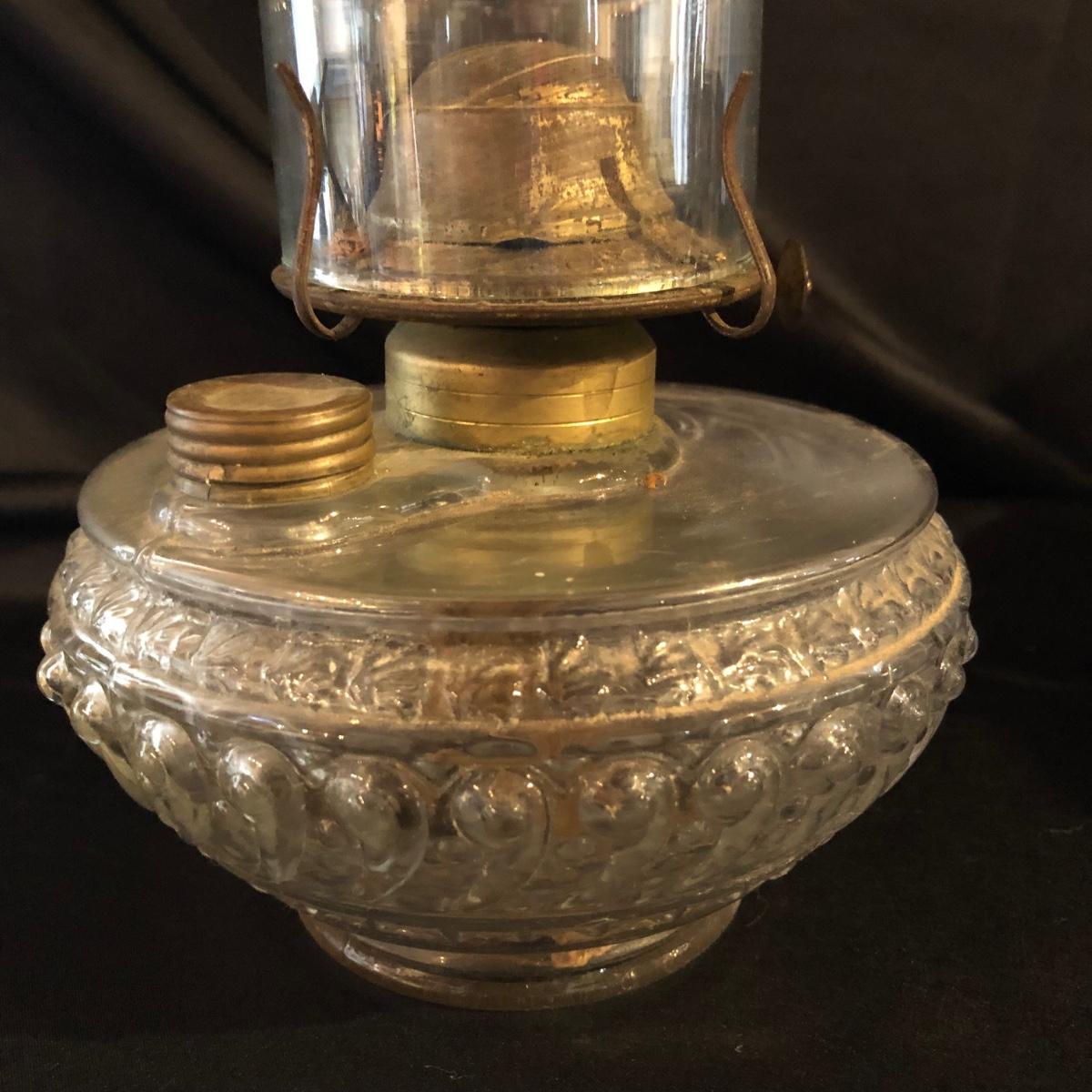 All 3 lamps have knobs to turn the wick and two of the three lamps have wicks. Each oil lamp has a chimney and intact bowls with no cracks or chips. The tallest measures 14.5” with a bowl of about 6”. The shortest chimney has a beaded top and stands 13” tall. Shipping Available.