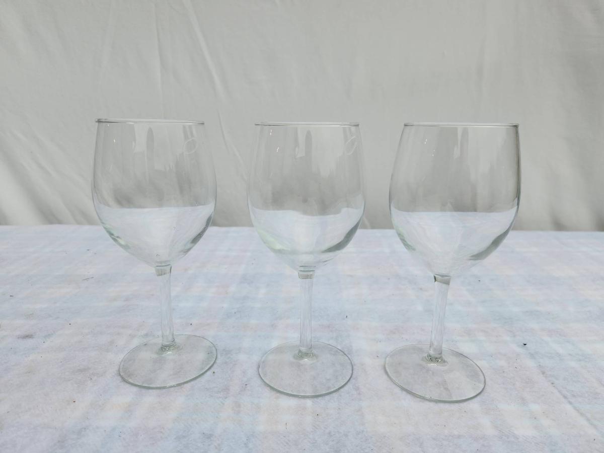 Three clear glass wine goblets featuring a classic design with smooth, rounded bowls and sturdy stems. All pieces are uniform in size and shape, crafted for wine service or display. Condition is good with no visible chips or cracks. Suitable for everyday use or as a simple addition to a glassware collection.