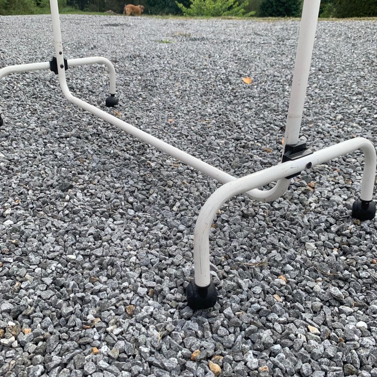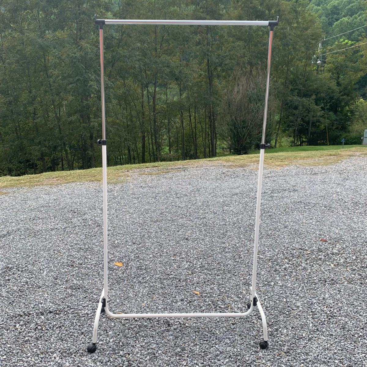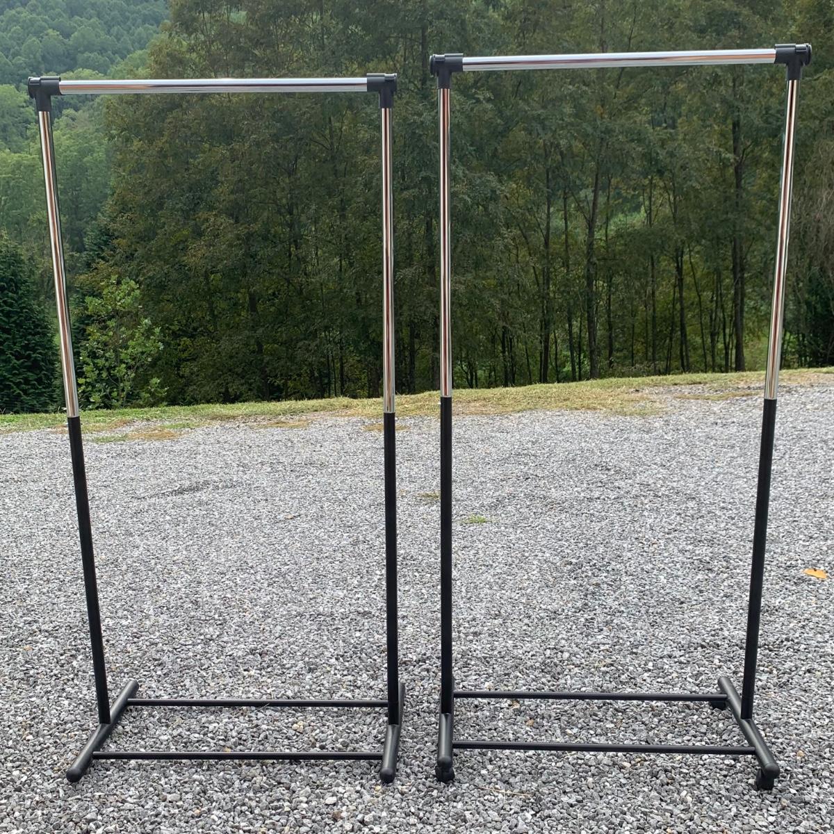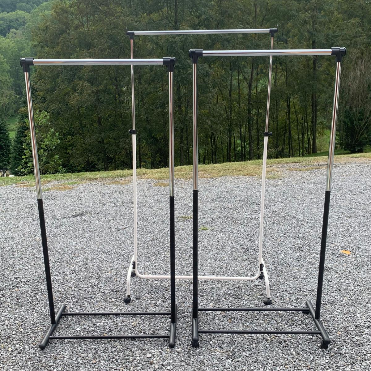 Three clothing racks. All are metal with plastic bindings. Two of the racks are identical except one does not have casters attached. These two are 33” x 18” x 65” without the casters, or 66.5”H with the casters. The white rack has casters and appears to be adjustable in height, but is stuck in its current position and will likely need some effort to adjust. The two black racks disassemble with ease.