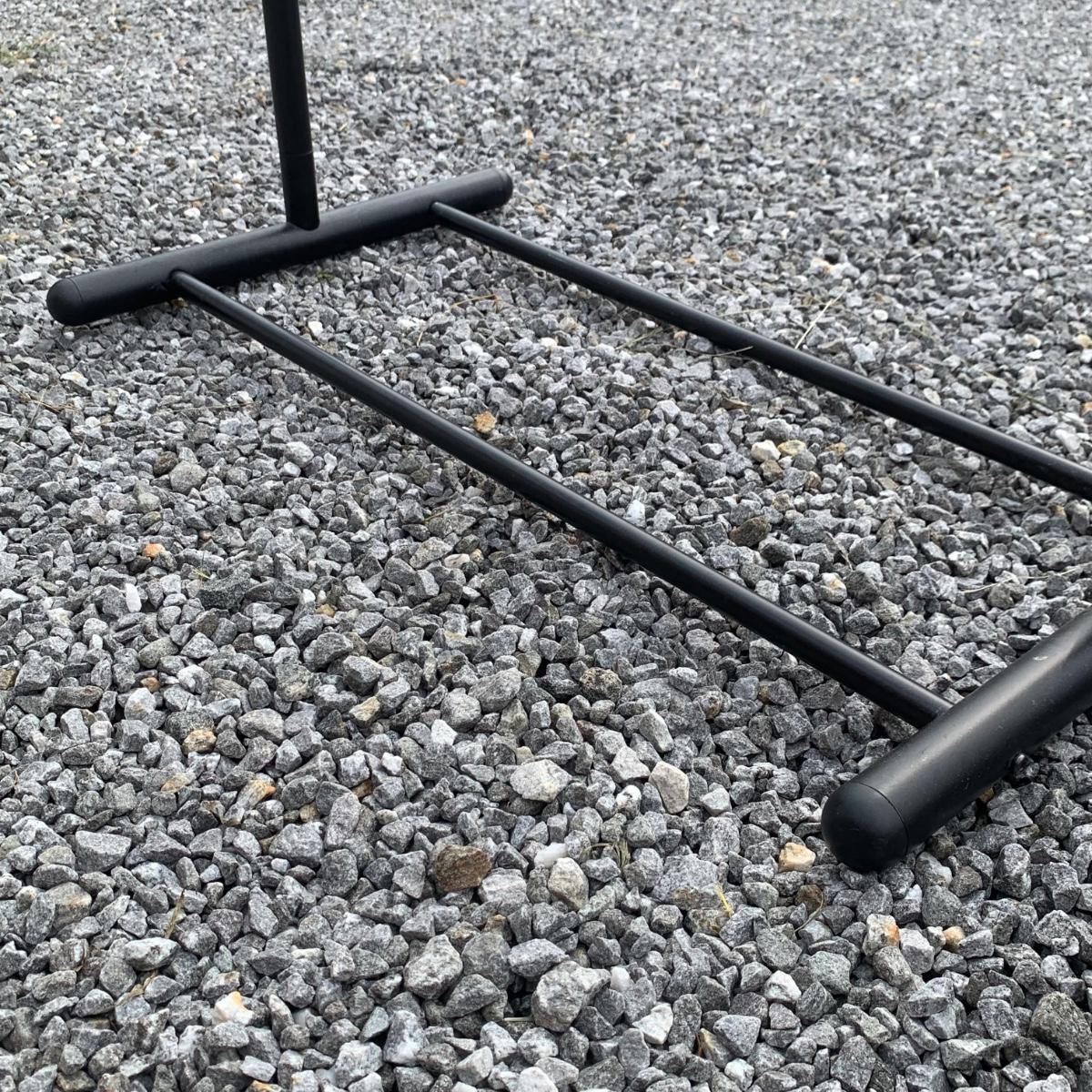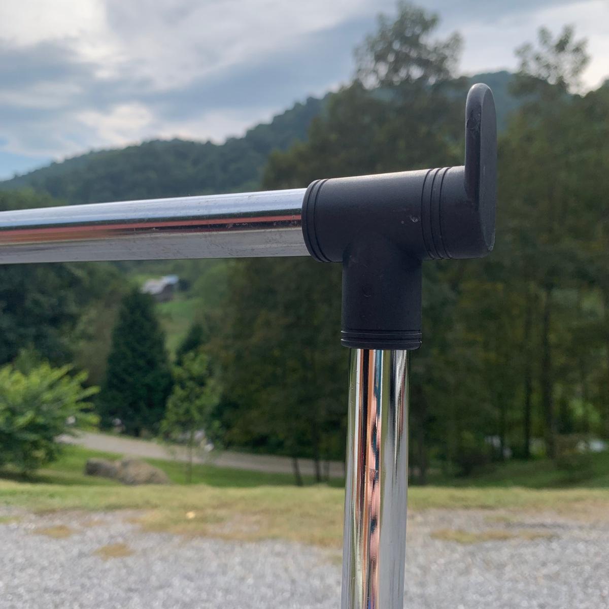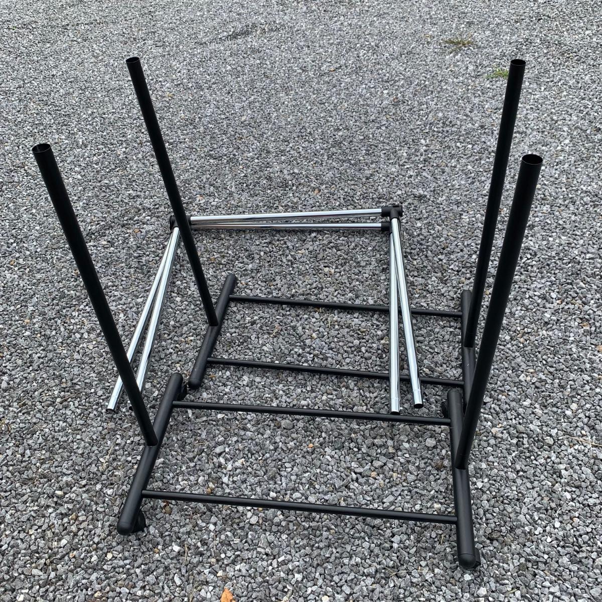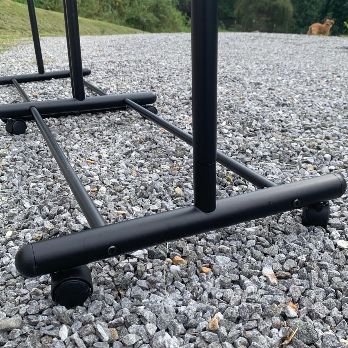 Three clothing racks. All are metal with plastic bindings. Two of the racks are identical except one does not have casters attached. These two are 33” x 18” x 65” without the casters, or 66.5”H with the casters. The white rack has casters and appears to be adjustable in height, but is stuck in its current position and will likely need some effort to adjust. The two black racks disassemble with ease.
