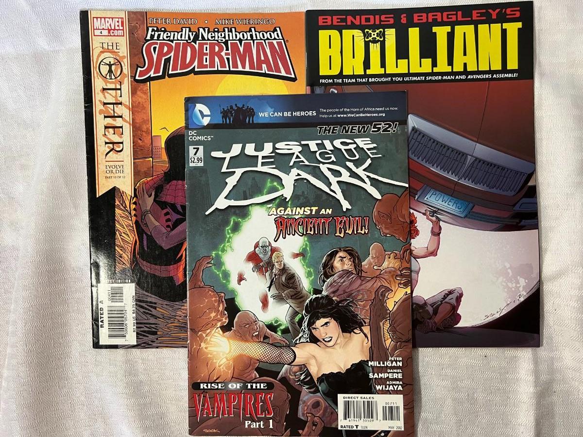 FRIENDLY NEIGHBORHOOD SPIDER-MAN, JUSTICE LEAGUE DARK AGAINST AN ACIENT EVIL! , BENDIS AND BAGLEY'S BRILLANT.