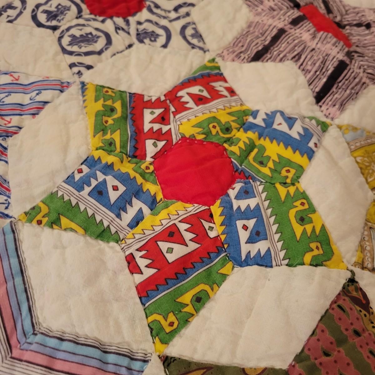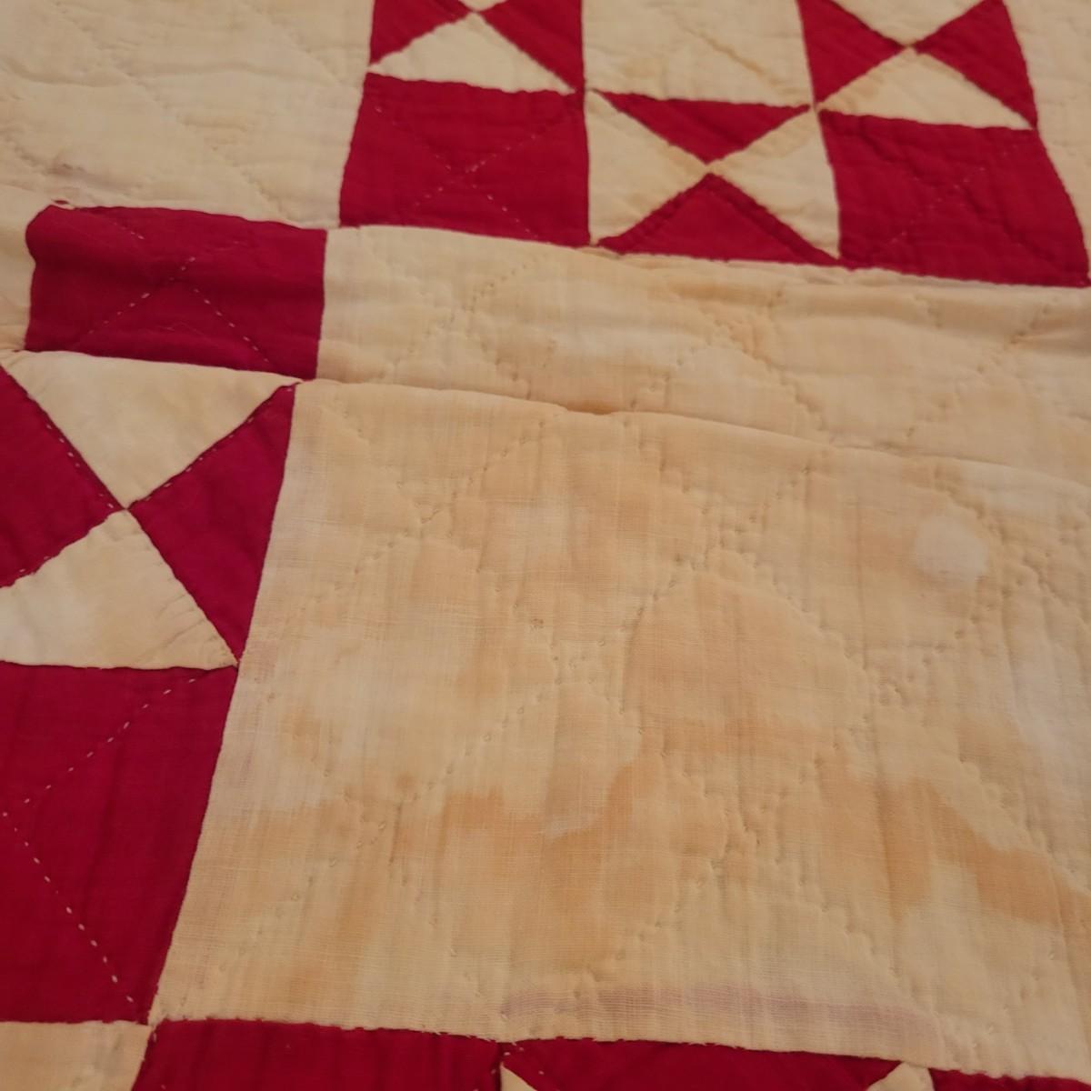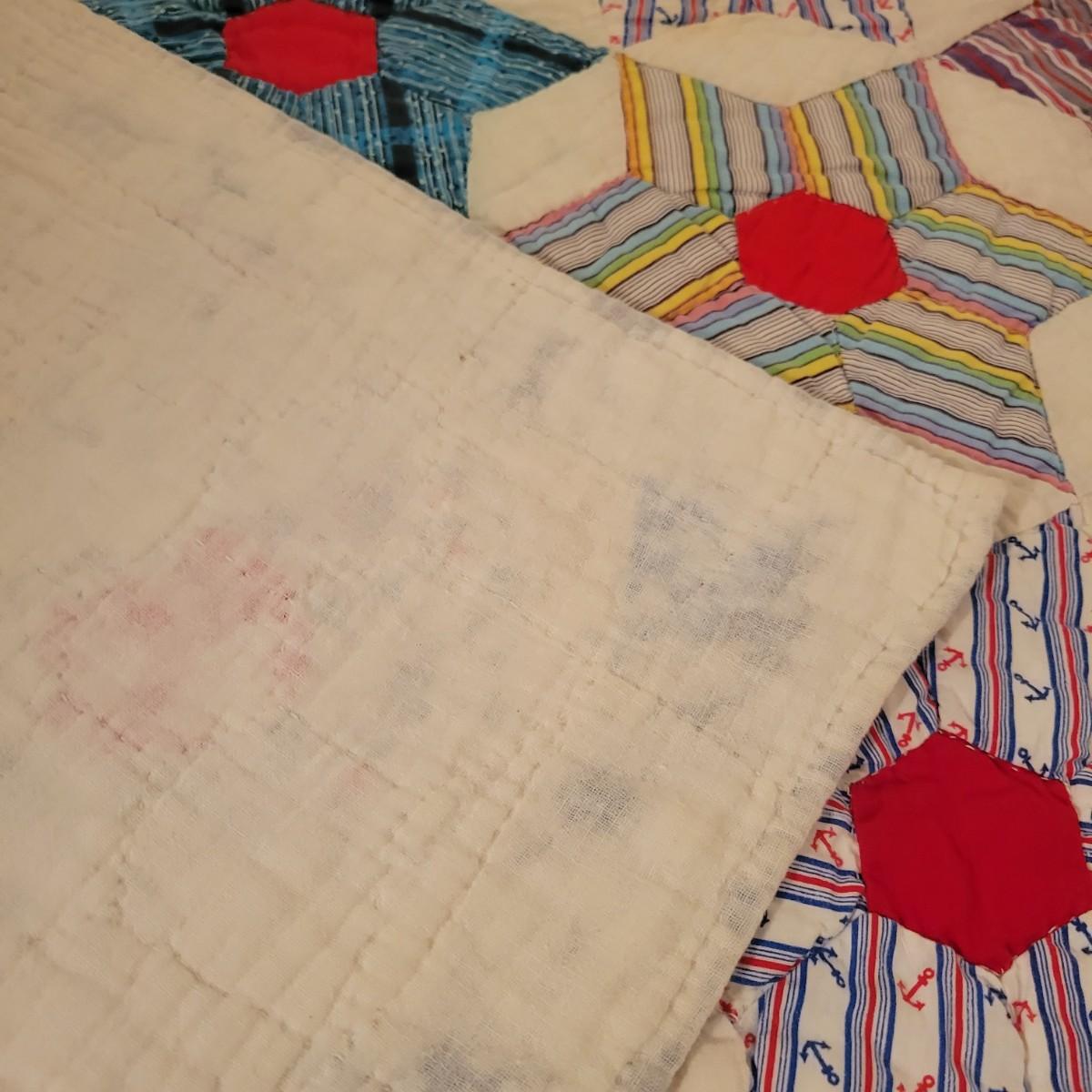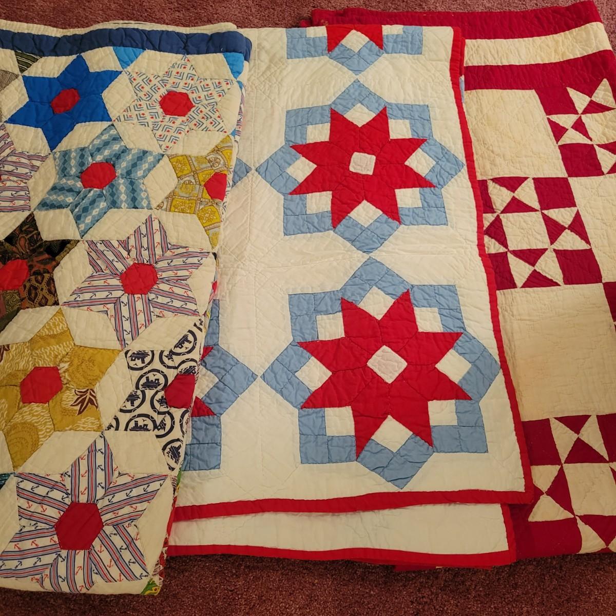 Three colorful quilts in good condition, but two do have varying amounts of stains. See attached pictures for more detail. The quilts range in size from. 72" x 78" to 90" x 65". Shipping available