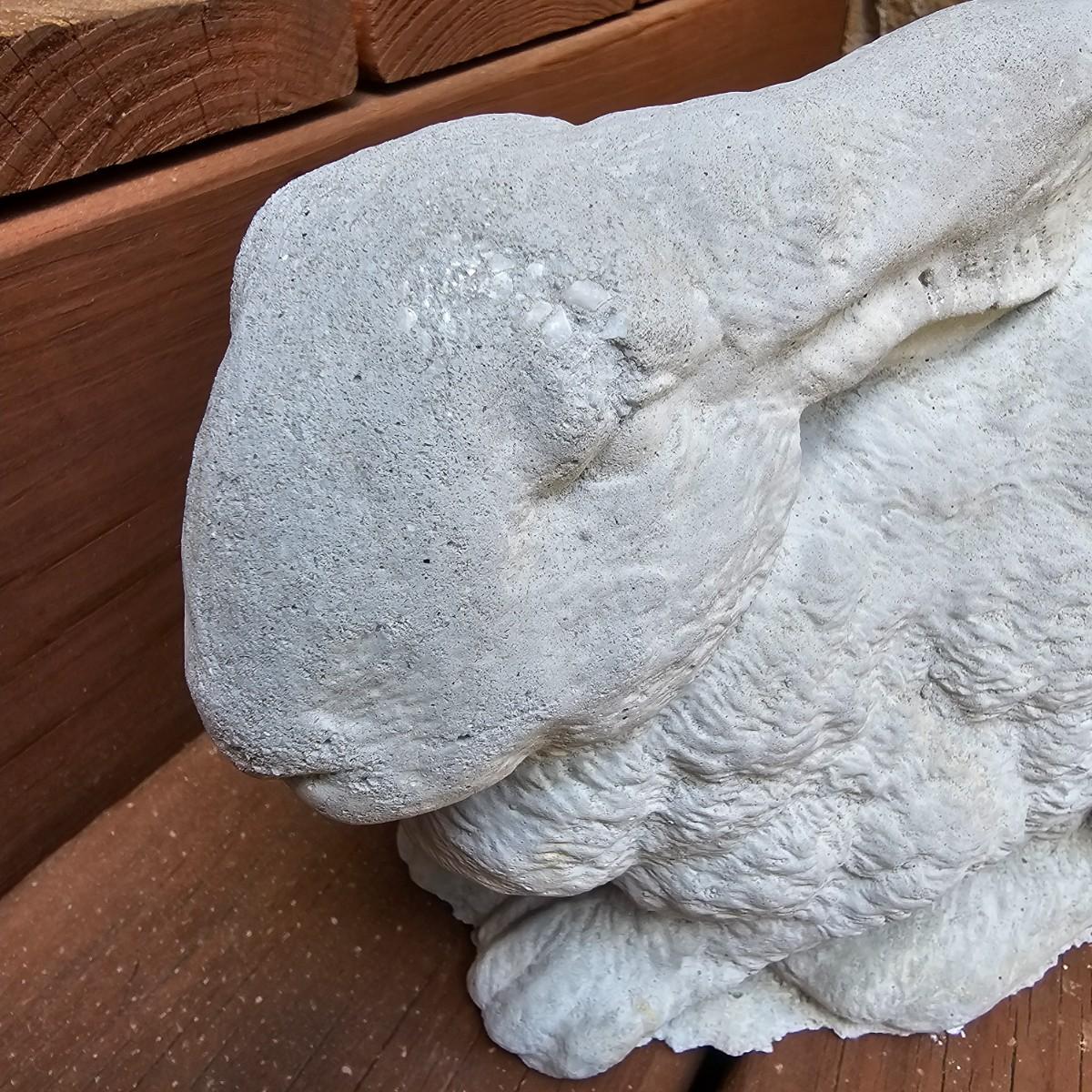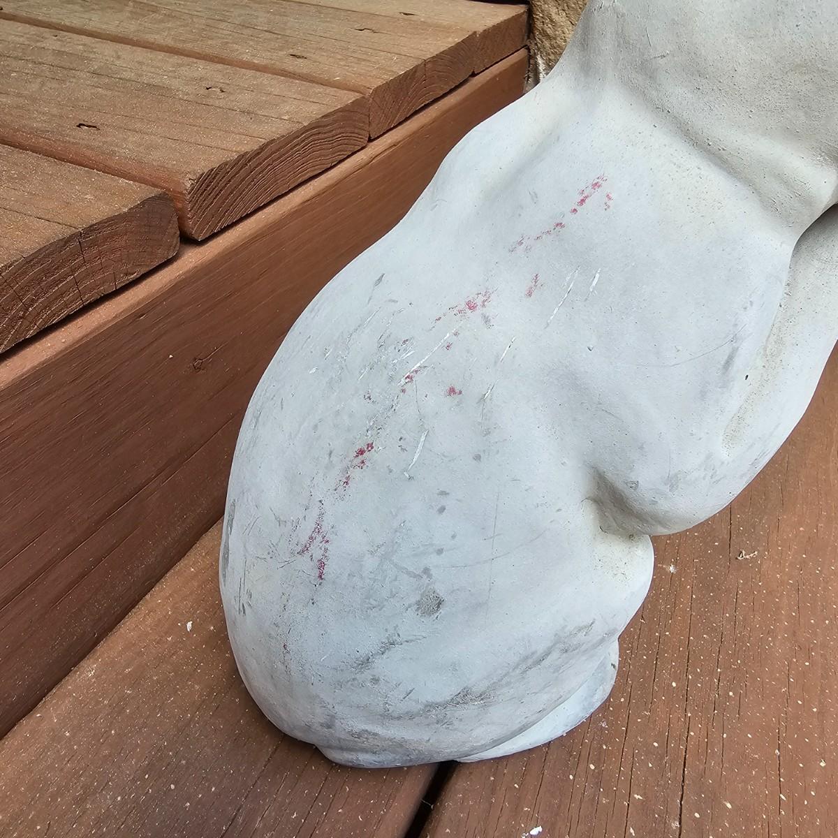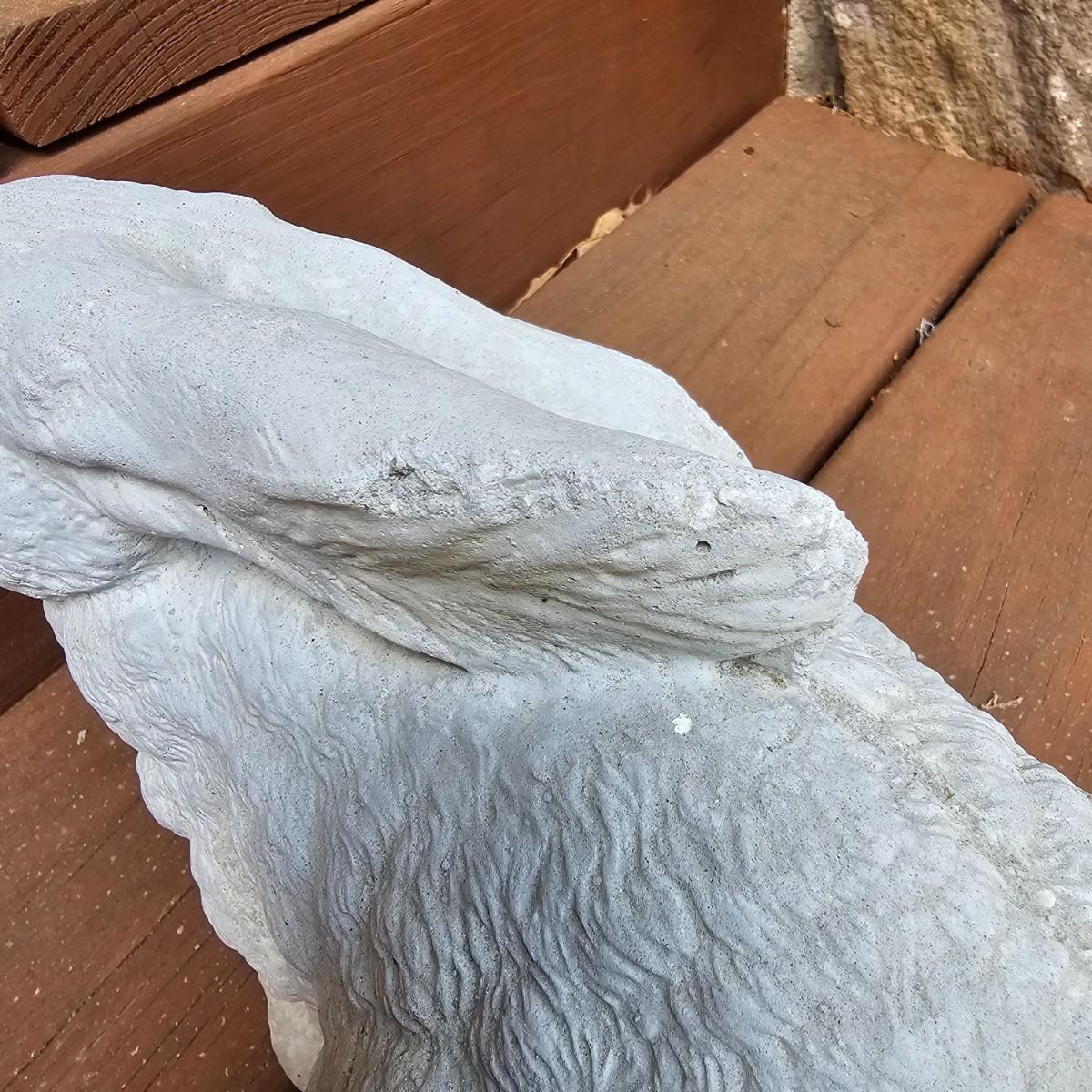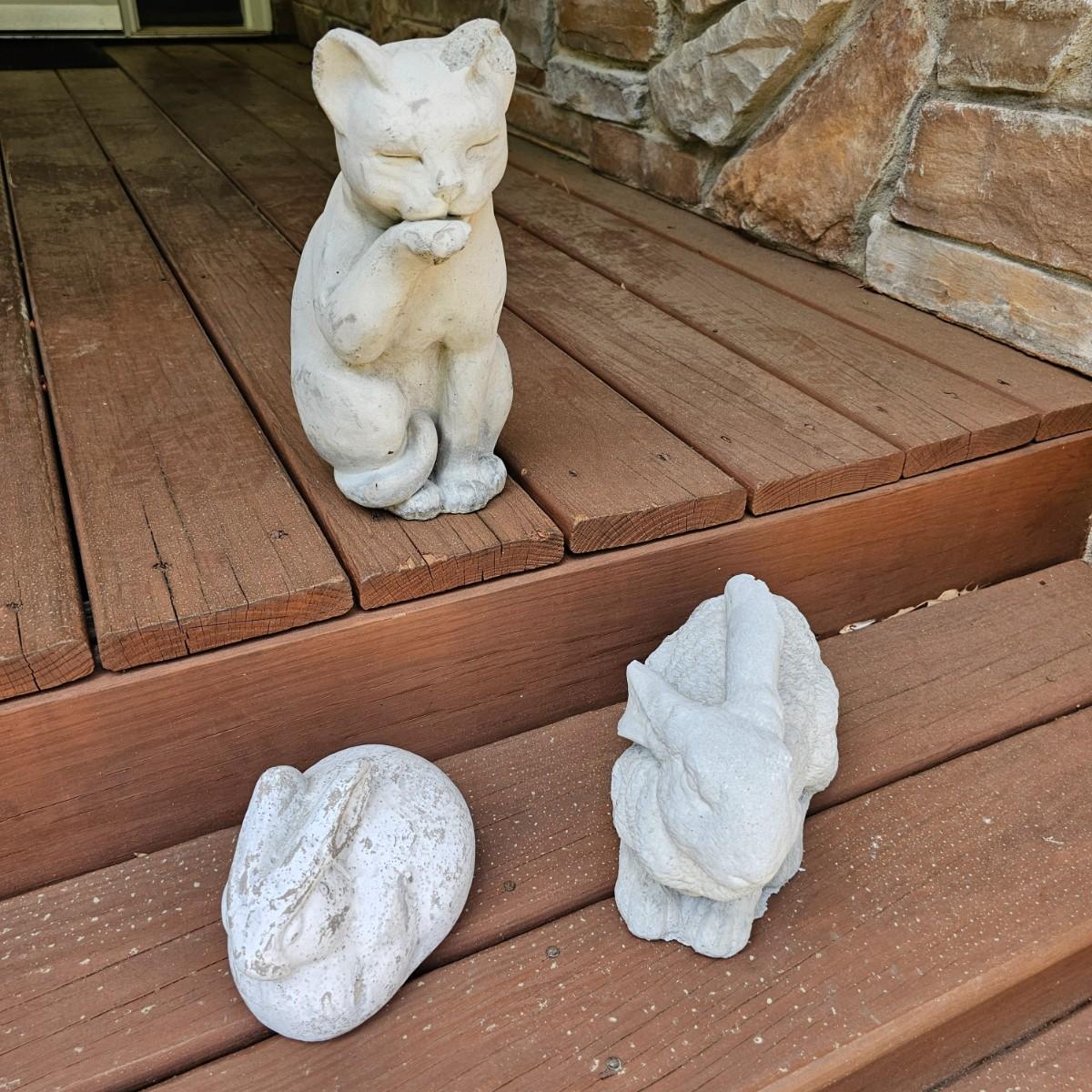 Two cute bunnies and a kitty make up this concrete trio. All three natural concrete grey, small bunny has a white speckled effect. Cat measures 5" x 8" x 1"H, has chips on both ears and one paw. Bunny with long ears is 5" x 10.5" x 6"H, has authentic looking fur body. Small bunny is 5" x 6.5" x 5"H. See photos for details. Local pickup only.