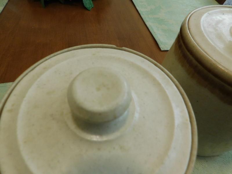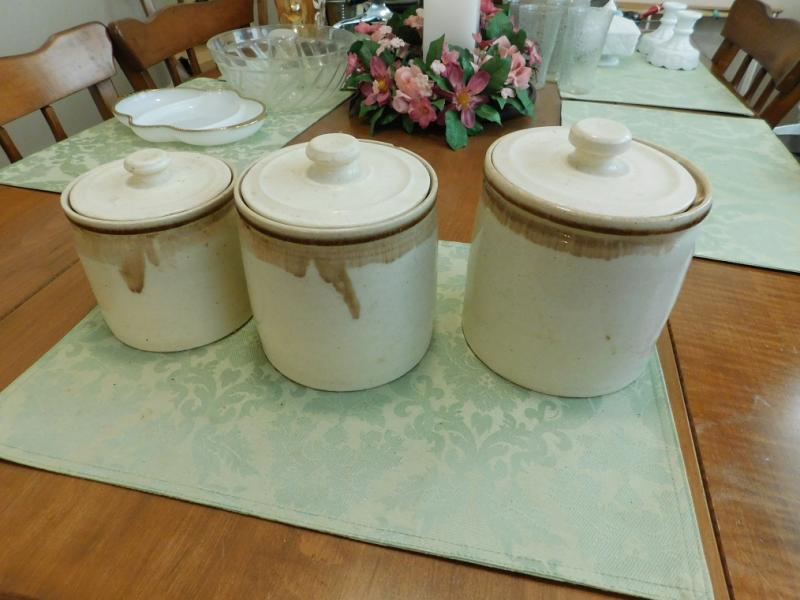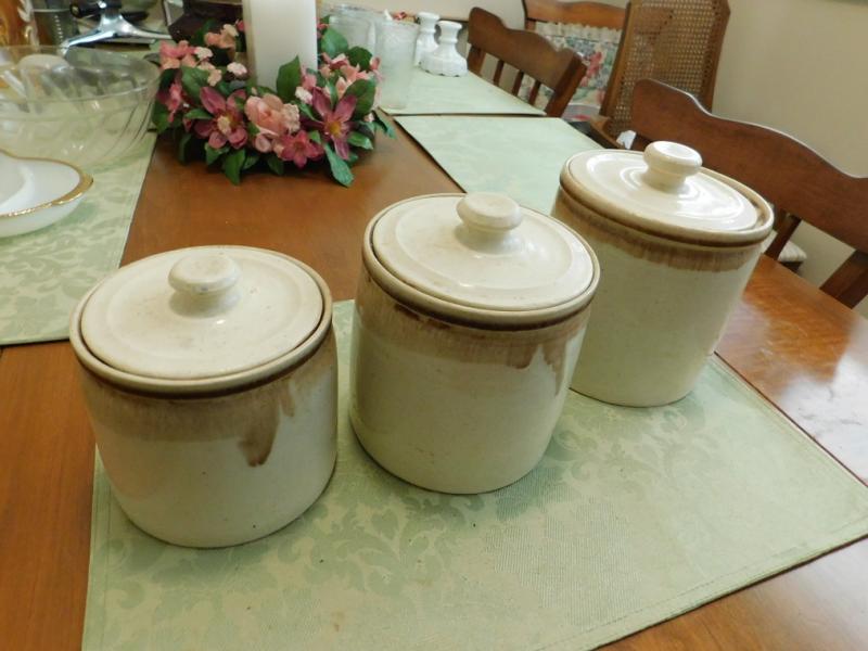 Three Crock Pottery Cannister Set by John Garrou, 1989 Old Fort, NC....tiny chip on lip of one canister.