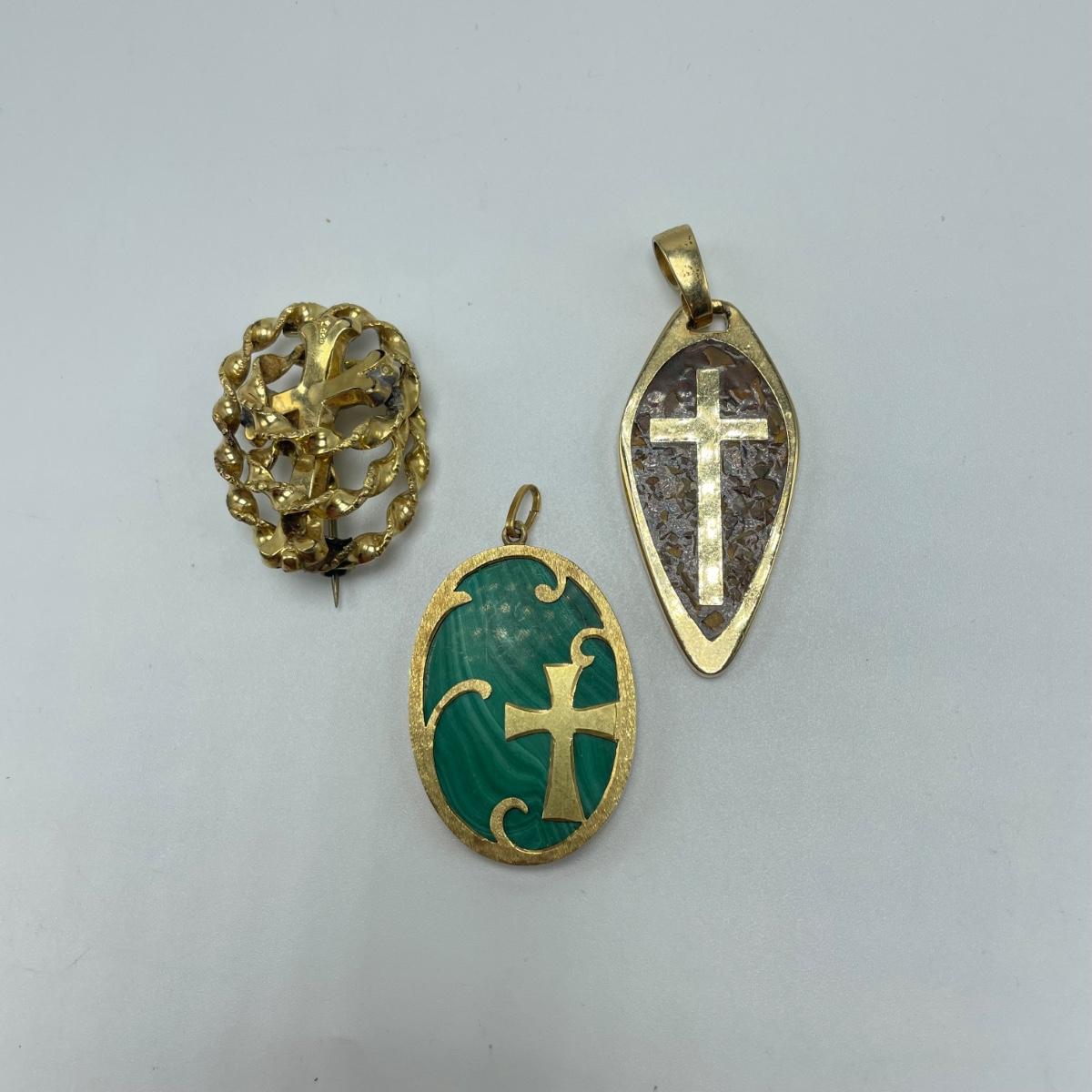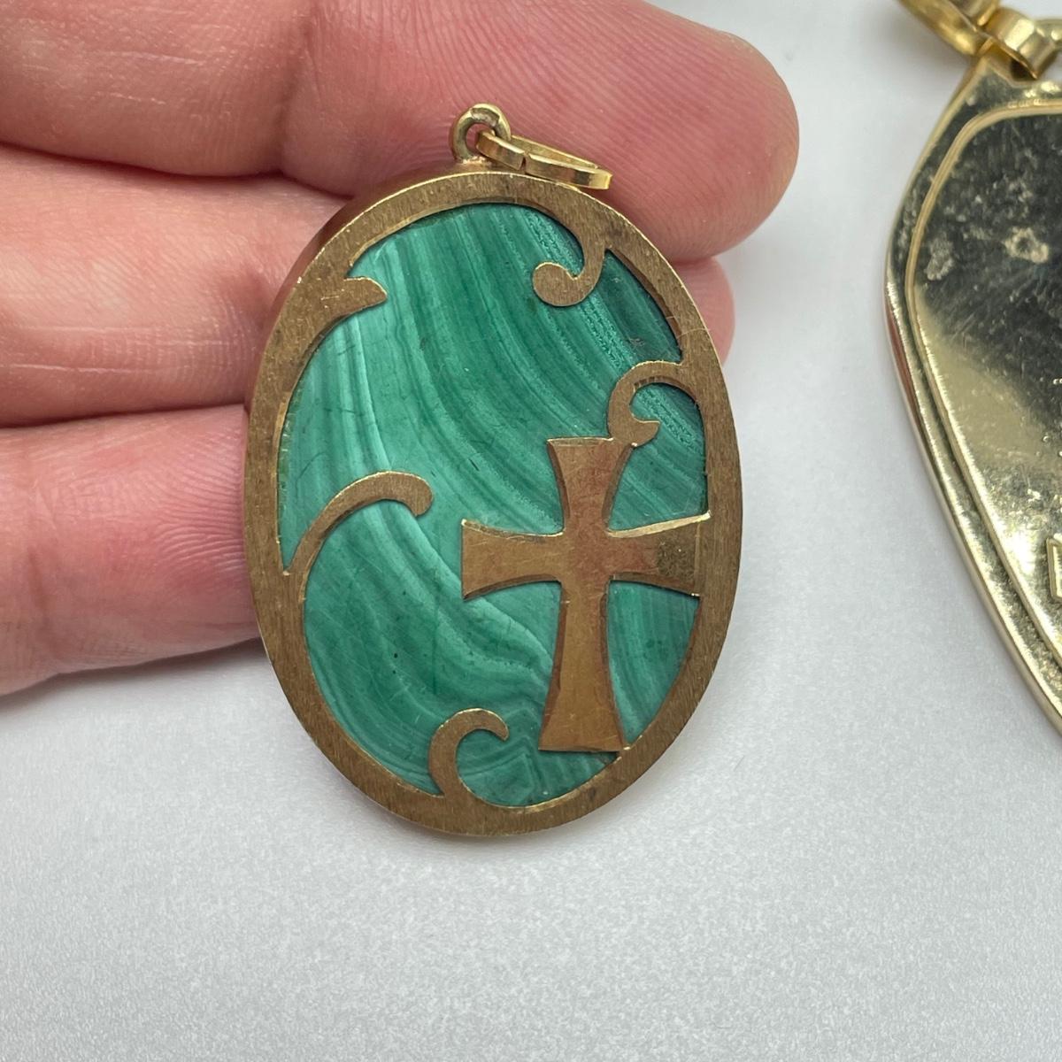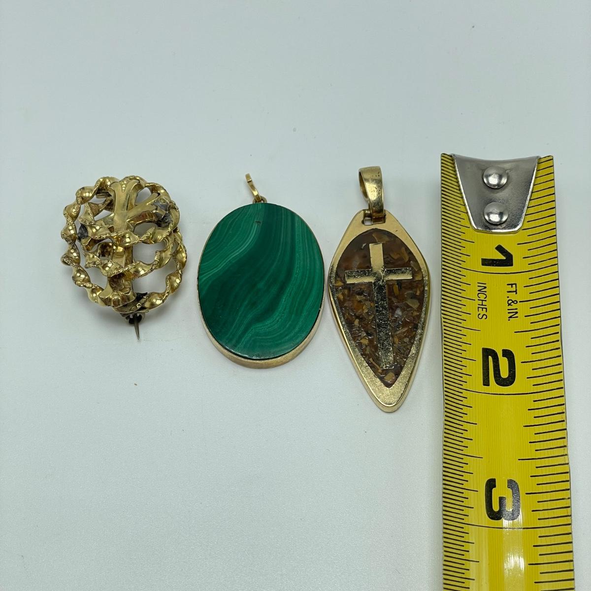 Three bold jewelry pieces with crosses includes two pendants and a brooch. The brooch can also be a pendant if it’s turned sideways. The only marking found is shown in photos. This pendant has a resin-like filling, possibly with herbs or another plant/wood-like material in its golden metal setting. The pendant with the malachite-like stone is essentially two-sided and stunning on both sides. See images. All sales are final. No returns or refunds. Please bid accordingly. Shipping available.