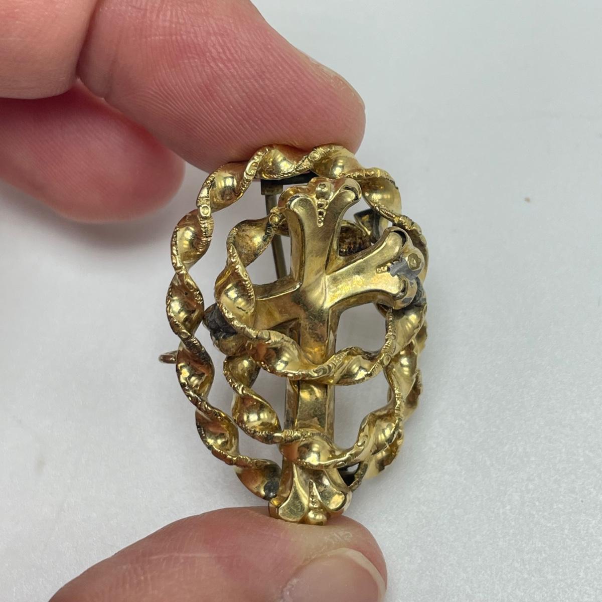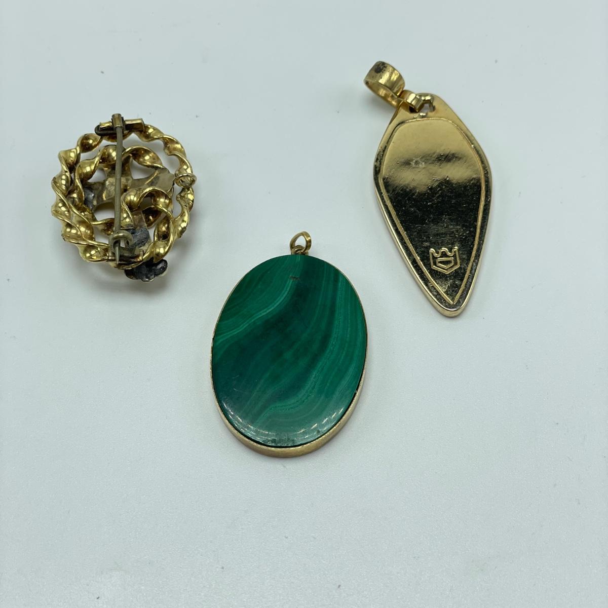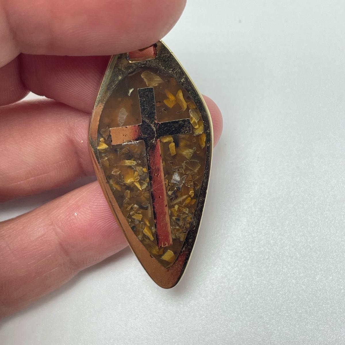 Three bold jewelry pieces with crosses includes two pendants and a brooch. The brooch can also be a pendant if it’s turned sideways. The only marking found is shown in photos. This pendant has a resin-like filling, possibly with herbs or another plant/wood-like material in its golden metal setting. The pendant with the malachite-like stone is essentially two-sided and stunning on both sides. See images. All sales are final. No returns or refunds. Please bid accordingly. Shipping available.