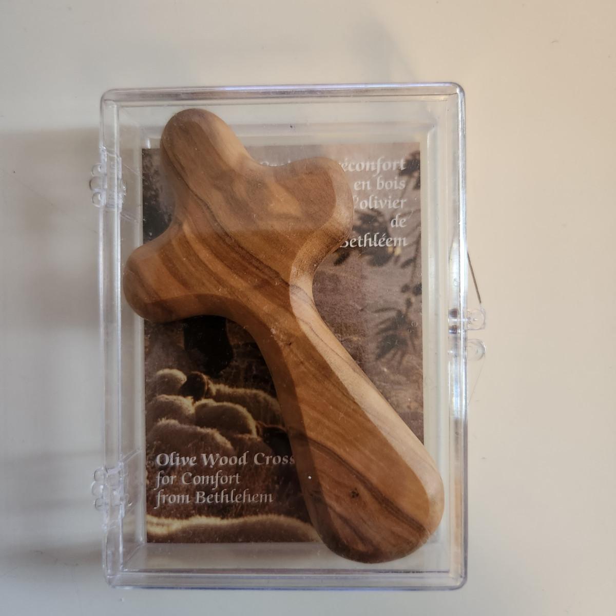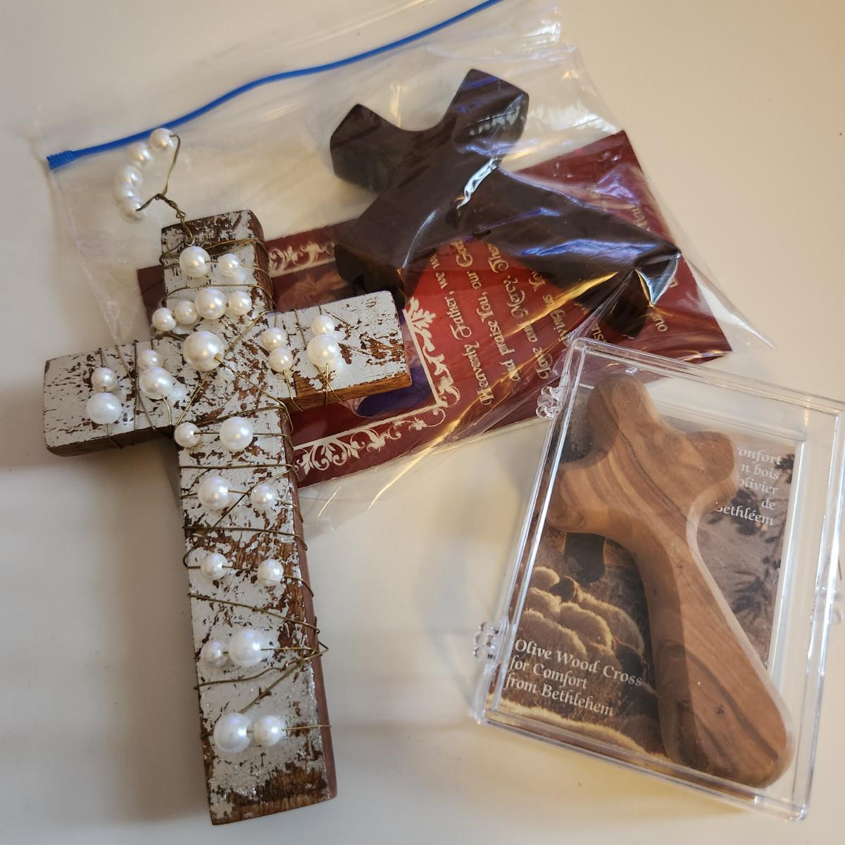 This auction lot is for Three Crucifix. These handsome renditions speak volumes to those who seek. One is a quite artistic and pearlized cross, another is of Holy Land Olive Wood and the other is a nice polished wood cross.