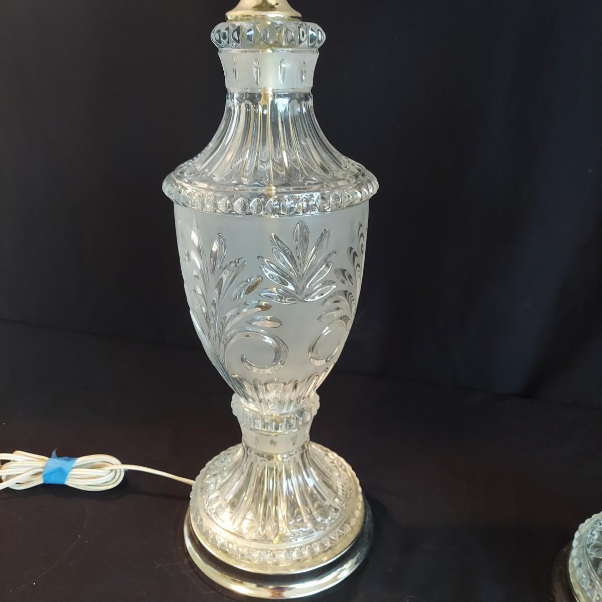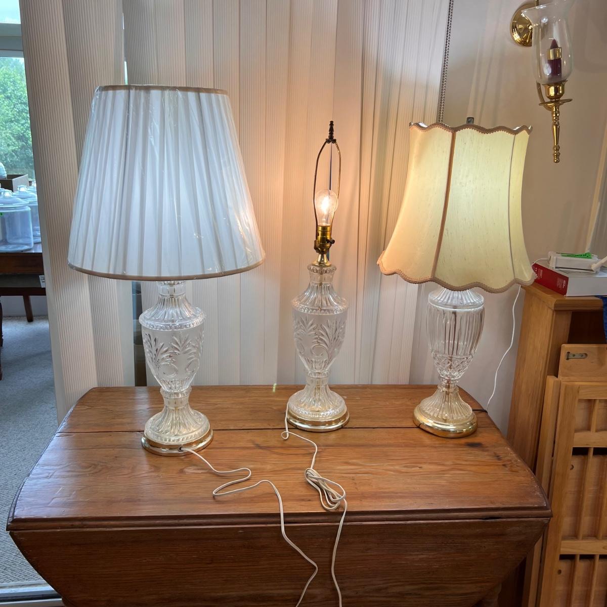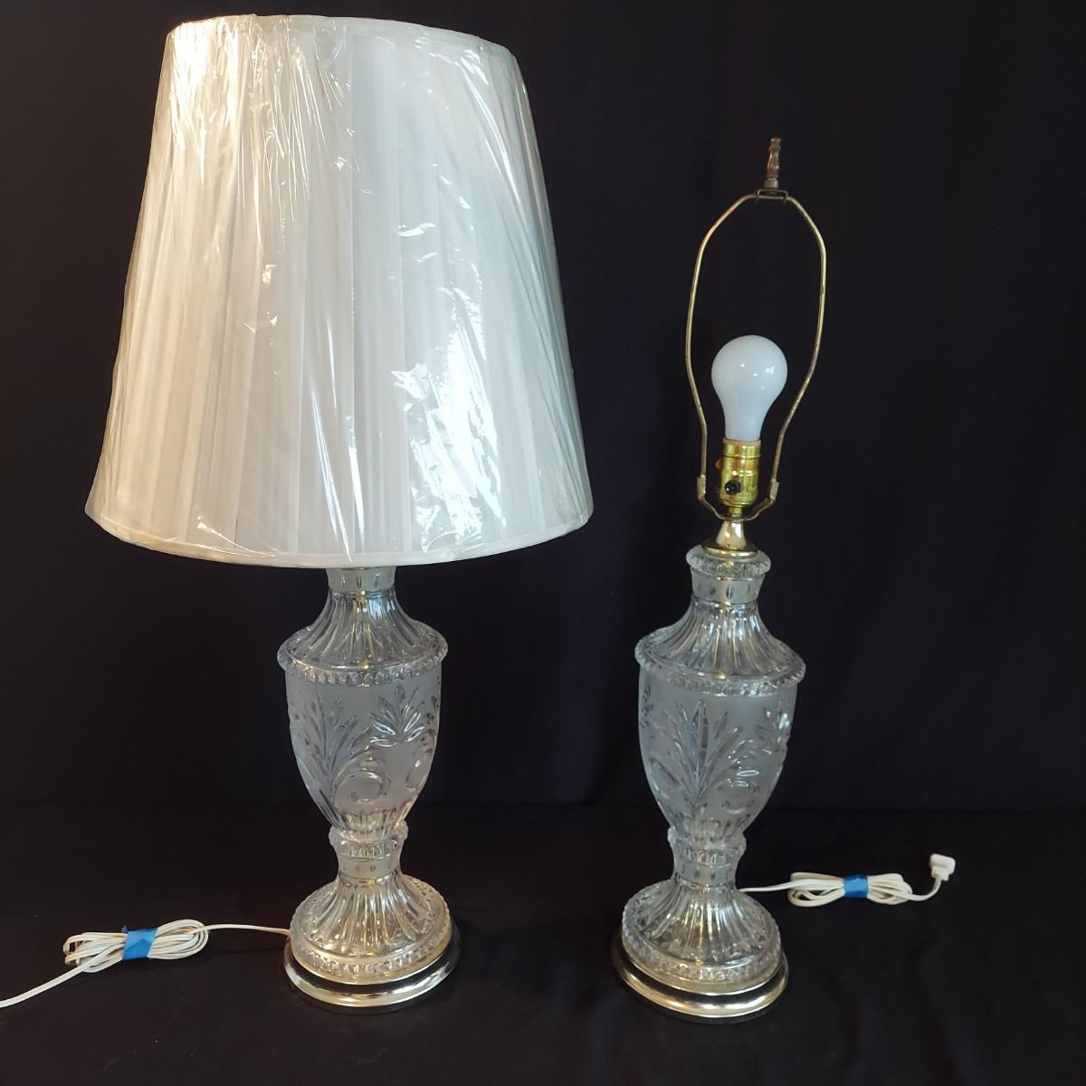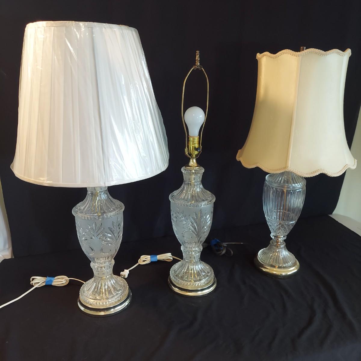 Lot includes two matching lamps marked Crystal Clear Industries brand measure 6"D x 29"H and they appear to be made in Yugoslavia. One of these lamps has a cloth shade that's wrapped in plastic, the other has no shade. Plus a third lamp that is unmarked. Please see photos for details. Lamps powered on when plugged in and al have 3 way switches.