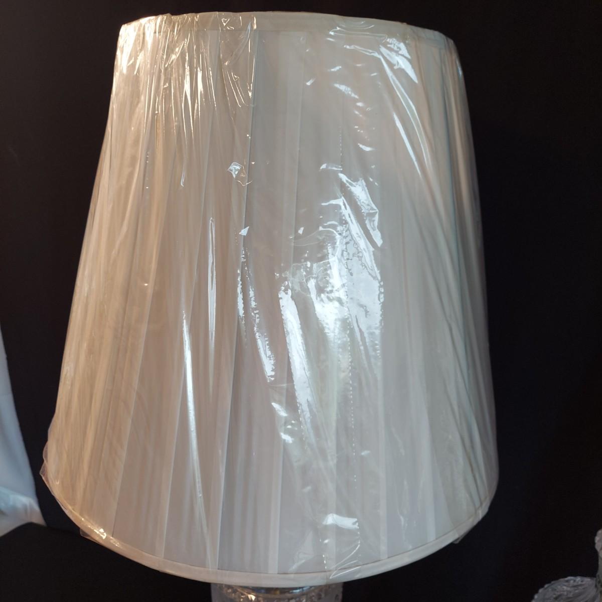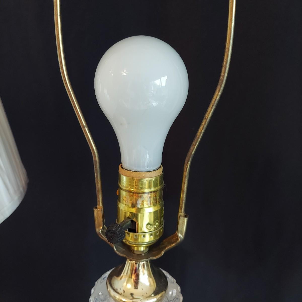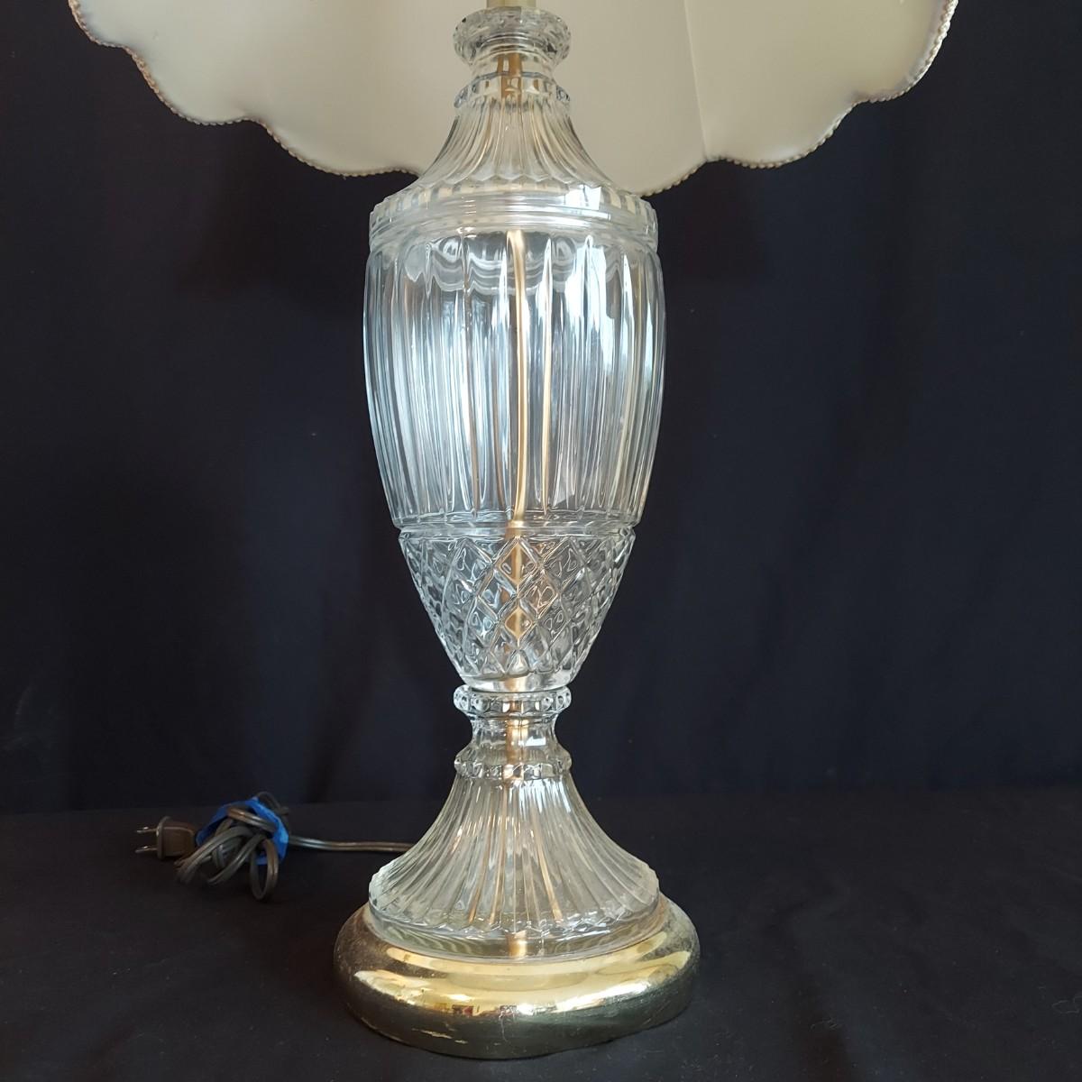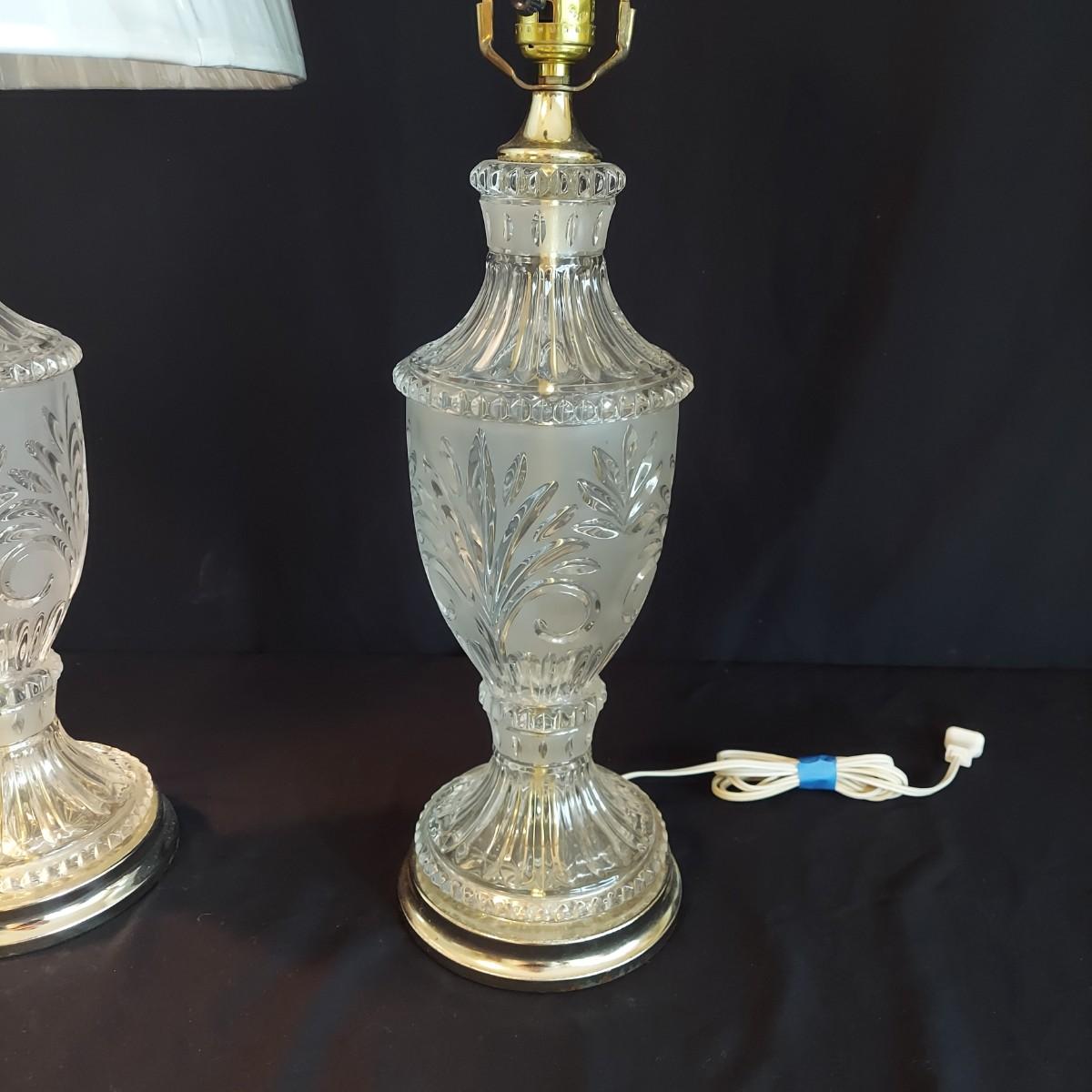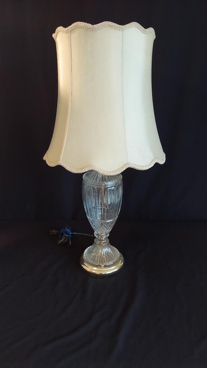Lot includes two matching lamps marked Crystal Clear Industries brand measure 6"D x 29"H and they appear to be made in Yugoslavia. One of these lamps has a cloth shade that's wrapped in plastic, the other has no shade. Plus a third lamp that is unmarked. Please see photos for details. Lamps powered on when plugged in and al have 3 way switches.