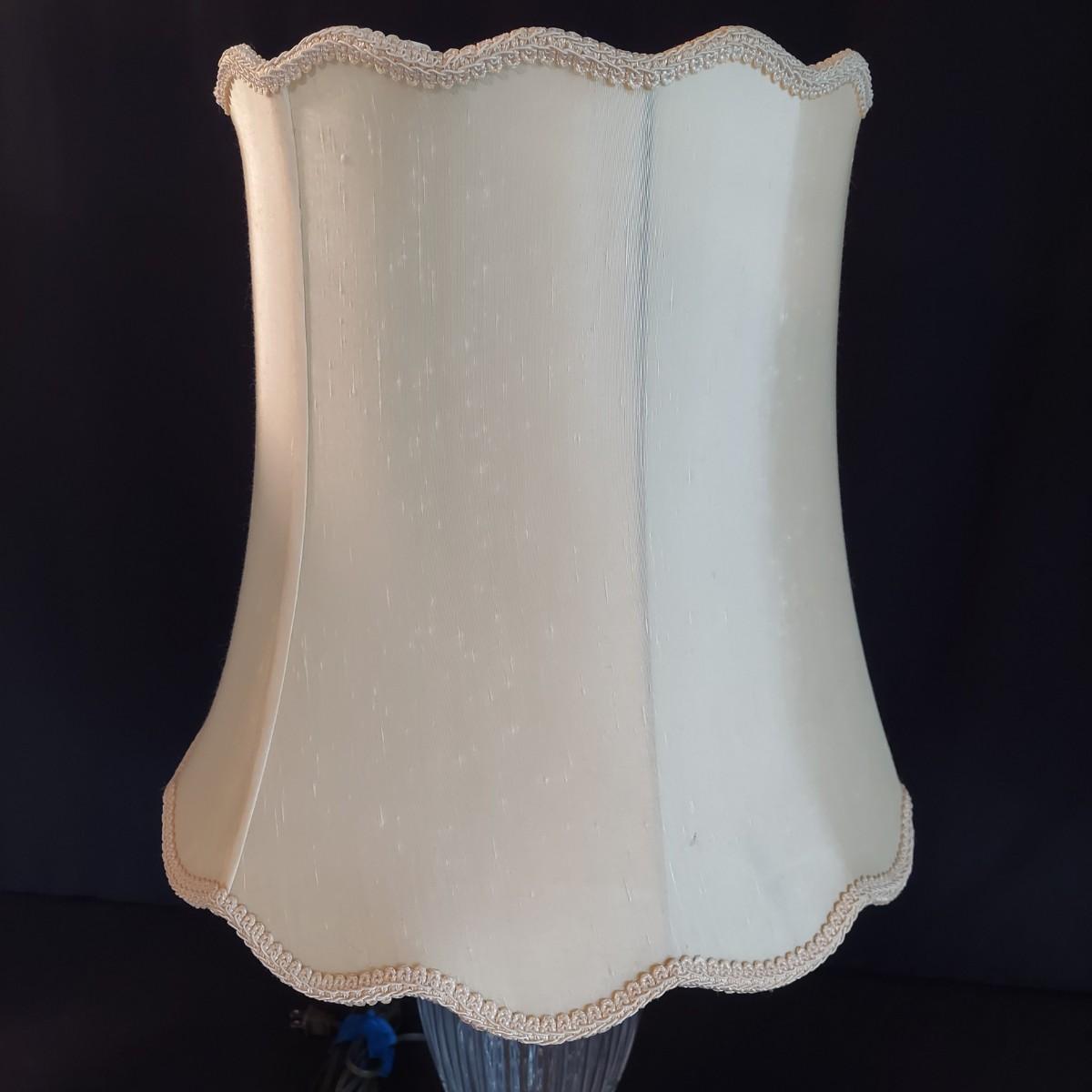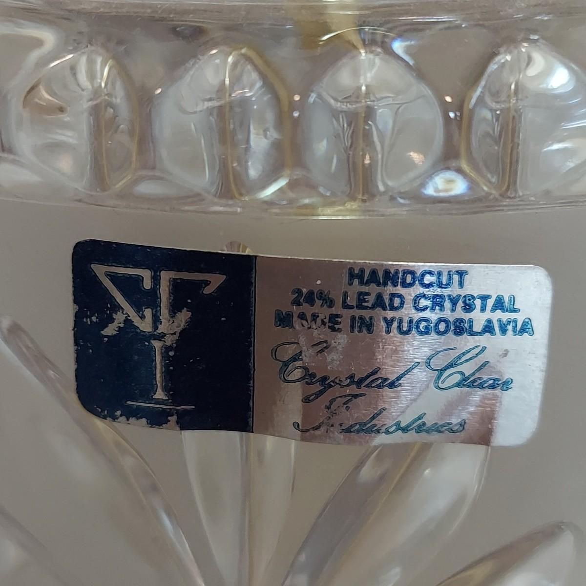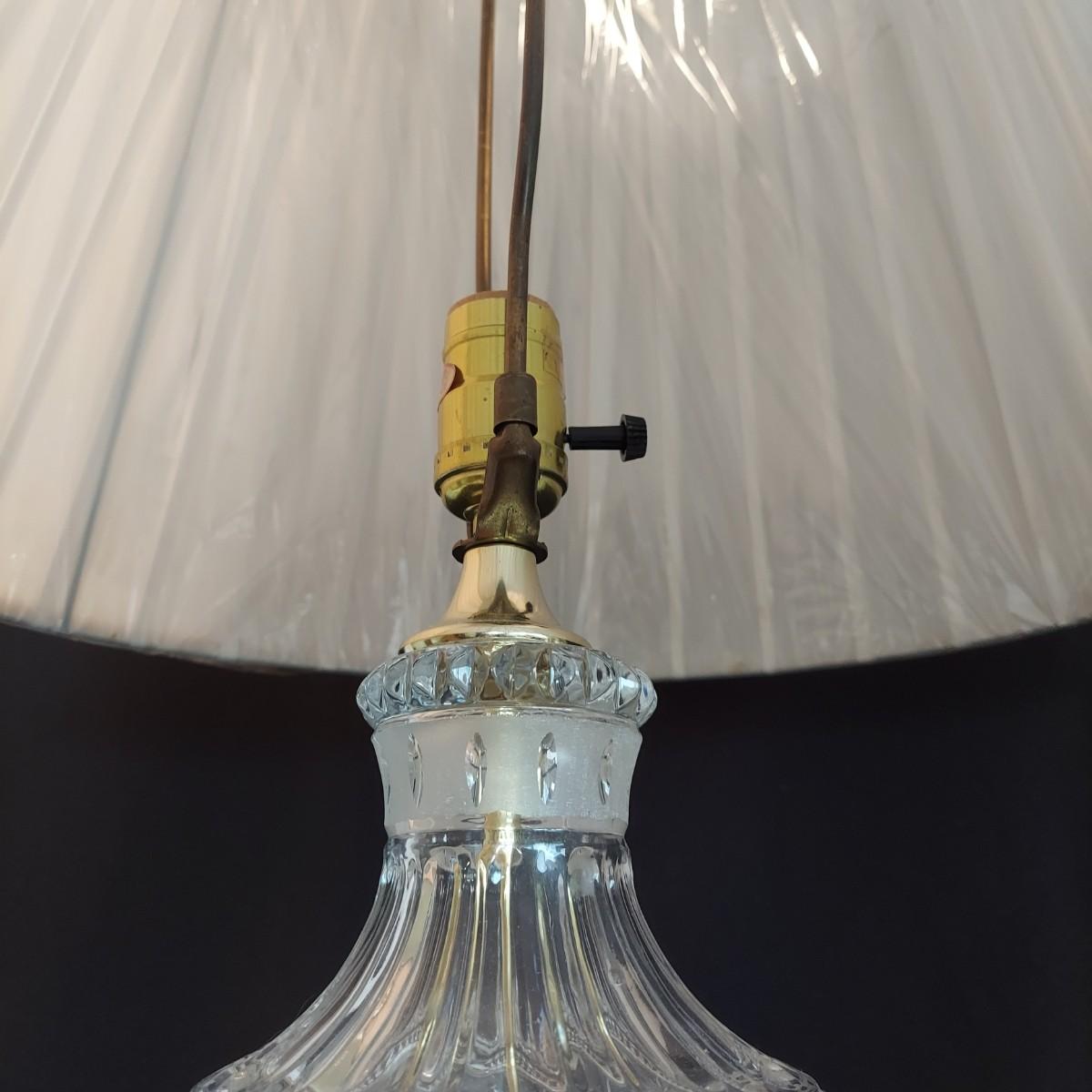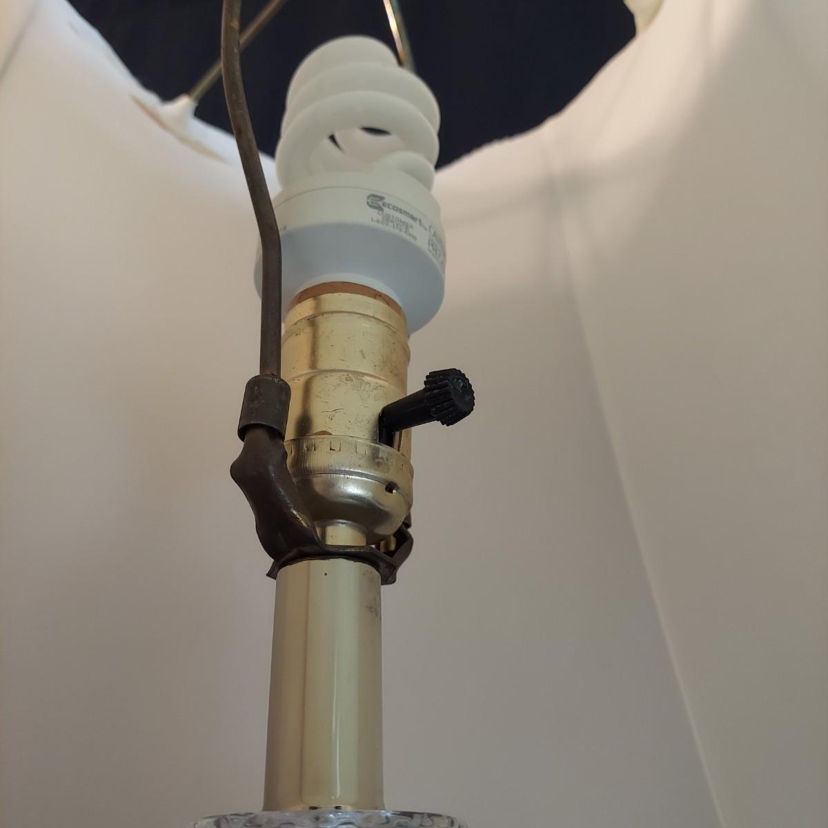 Lot includes two matching lamps marked Crystal Clear Industries brand measure 6"D x 29"H and they appear to be made in Yugoslavia. One of these lamps has a cloth shade that's wrapped in plastic, the other has no shade. Plus a third lamp that is unmarked. Please see photos for details. Lamps powered on when plugged in and al have 3 way switches.
