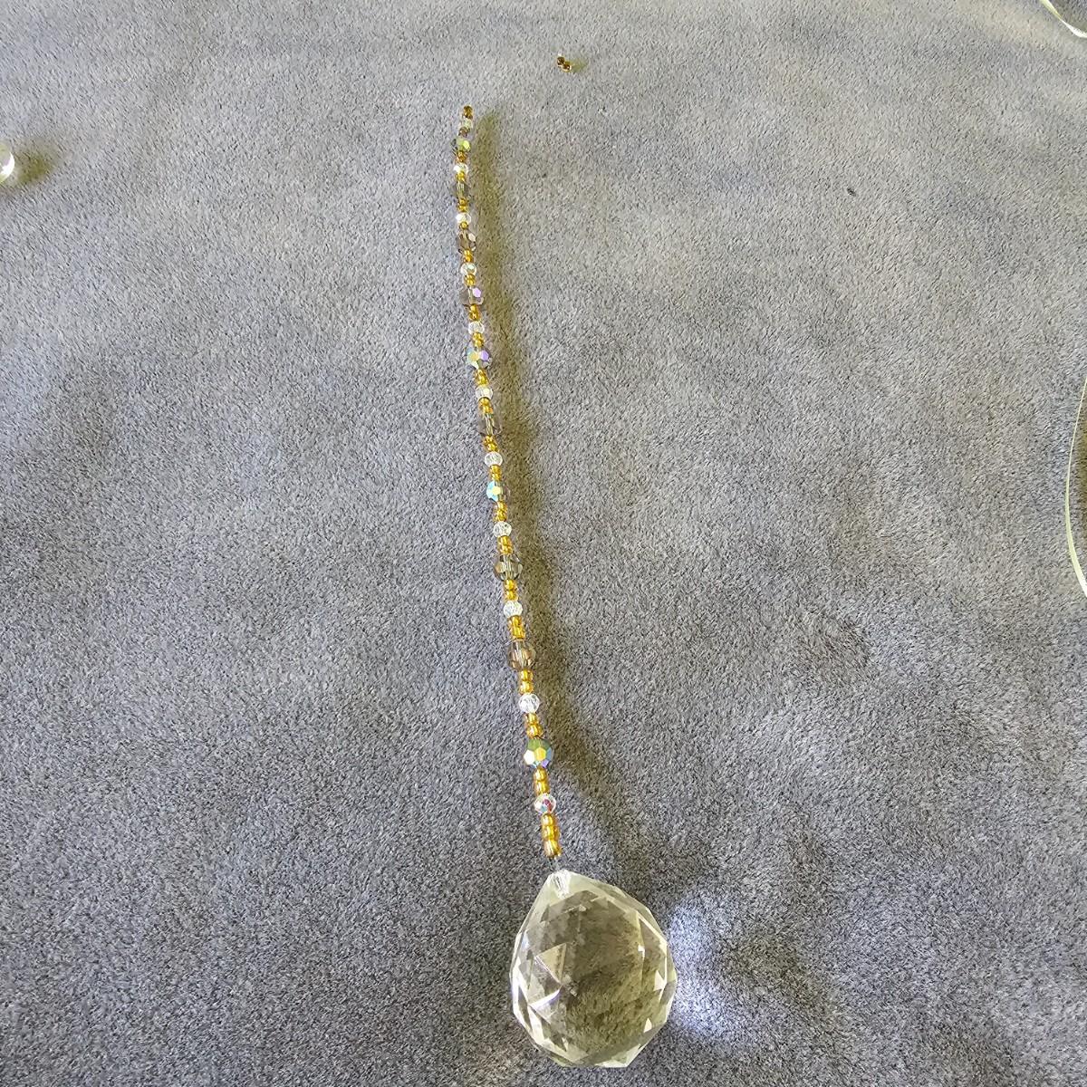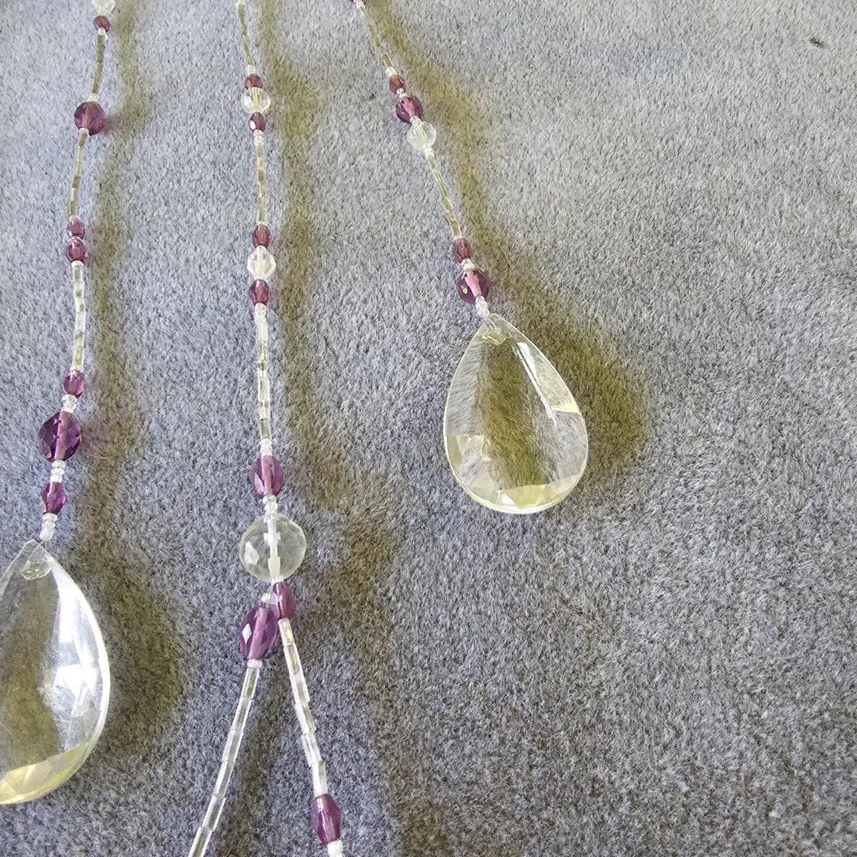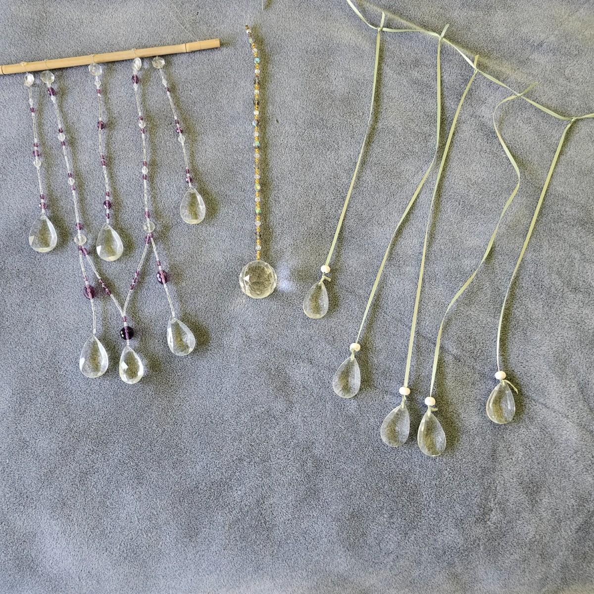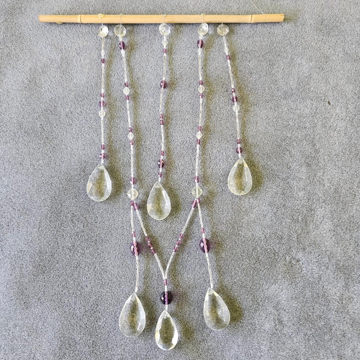Three pieces of beads and crystal art to grace your windows. Purple piece is on bamboo rod, is 12" x 15". Single round prism is 15" long with faceted crystals and beads. Green ribbon and prisms is 12" x 18". See photos for details. Shipping available.