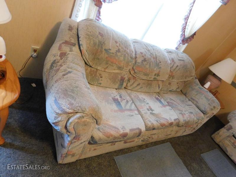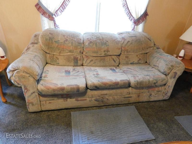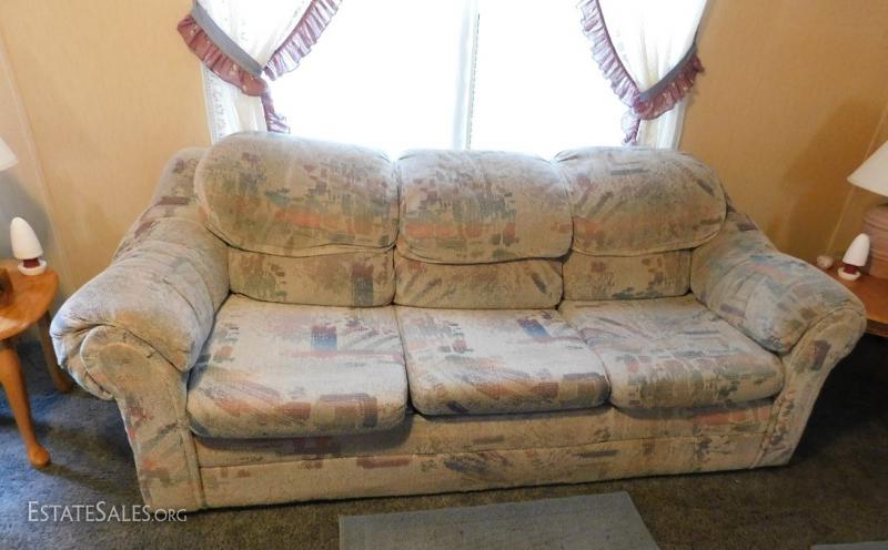 Three Cushion Couch needs cleaning. Well used but still has good colors. Note: House has been shut up for several months and some smoking in house.