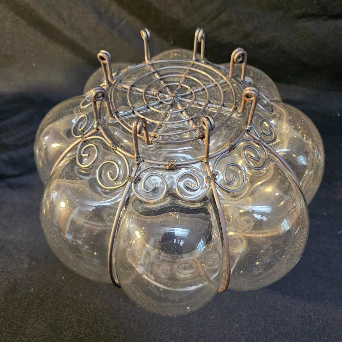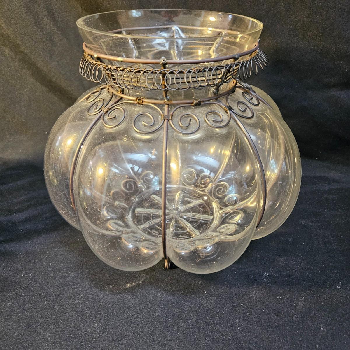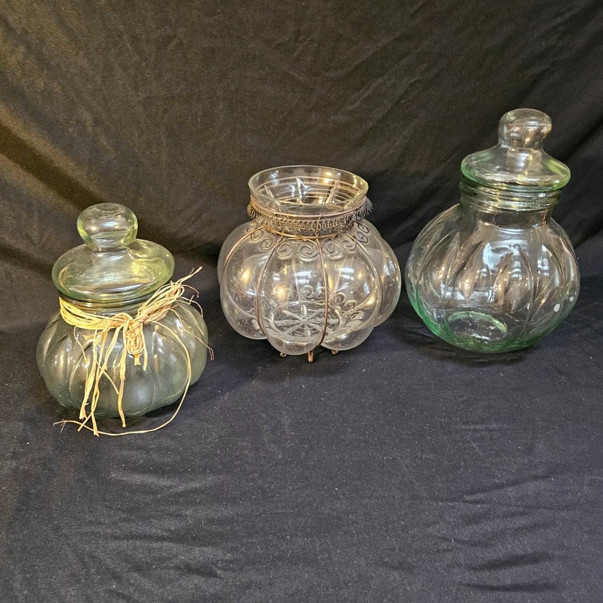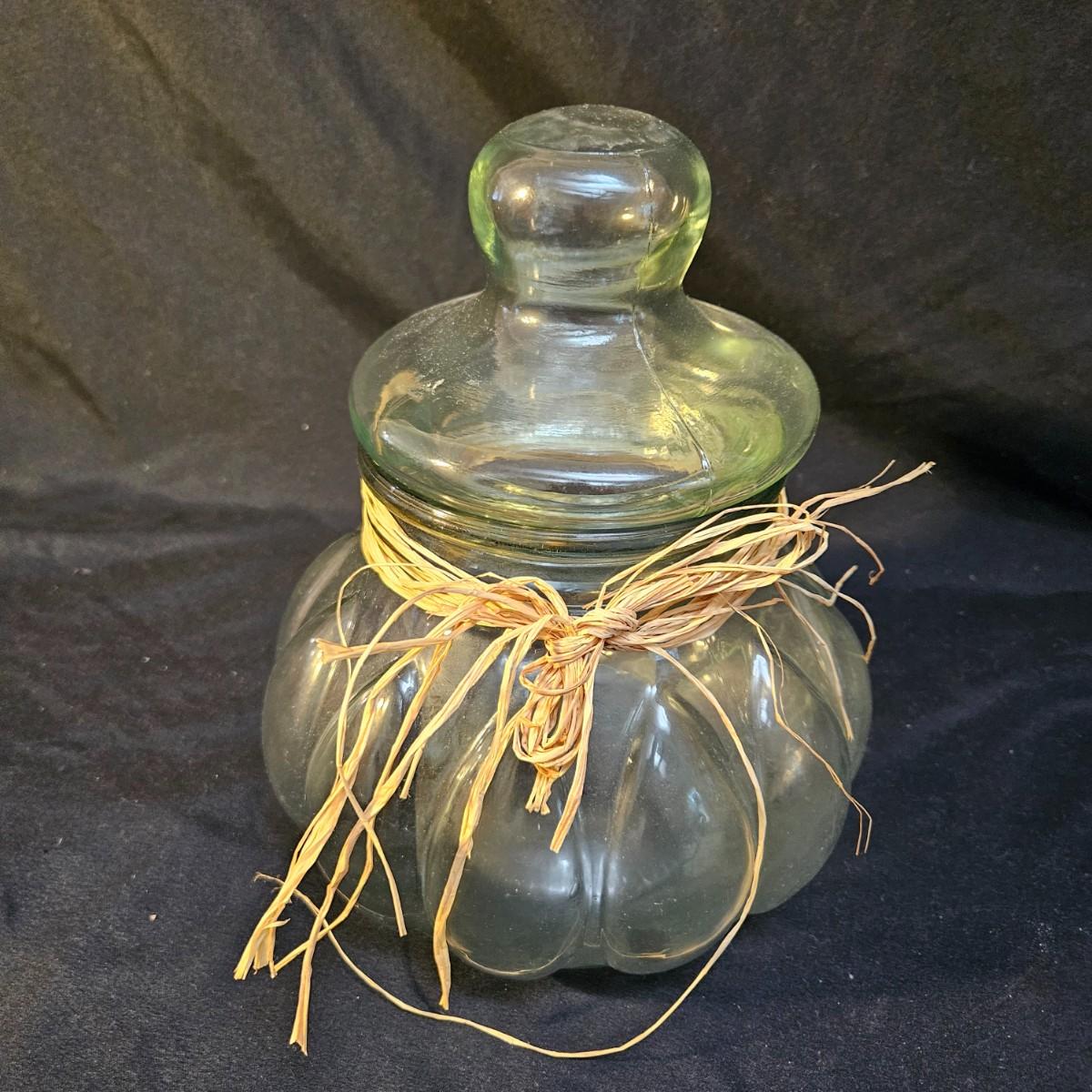 An assortment of decorative glass jars in various sizes. One has a decorative straw bow and another has metal accent. The largest lidded jar measures approximately 9"D x 15"H. Shipping available