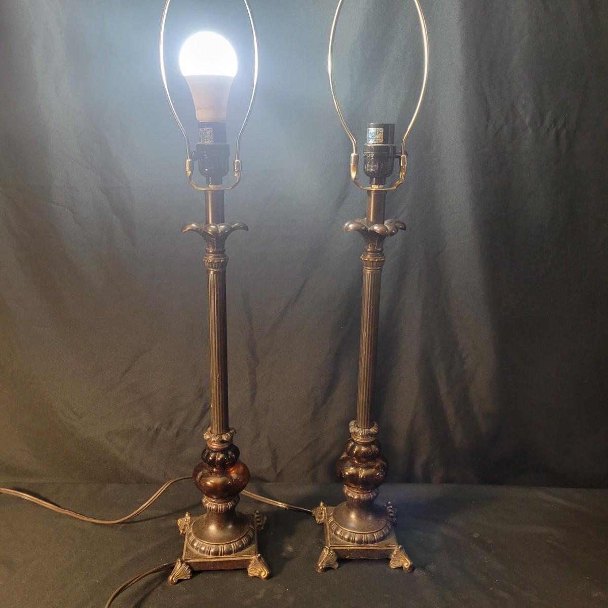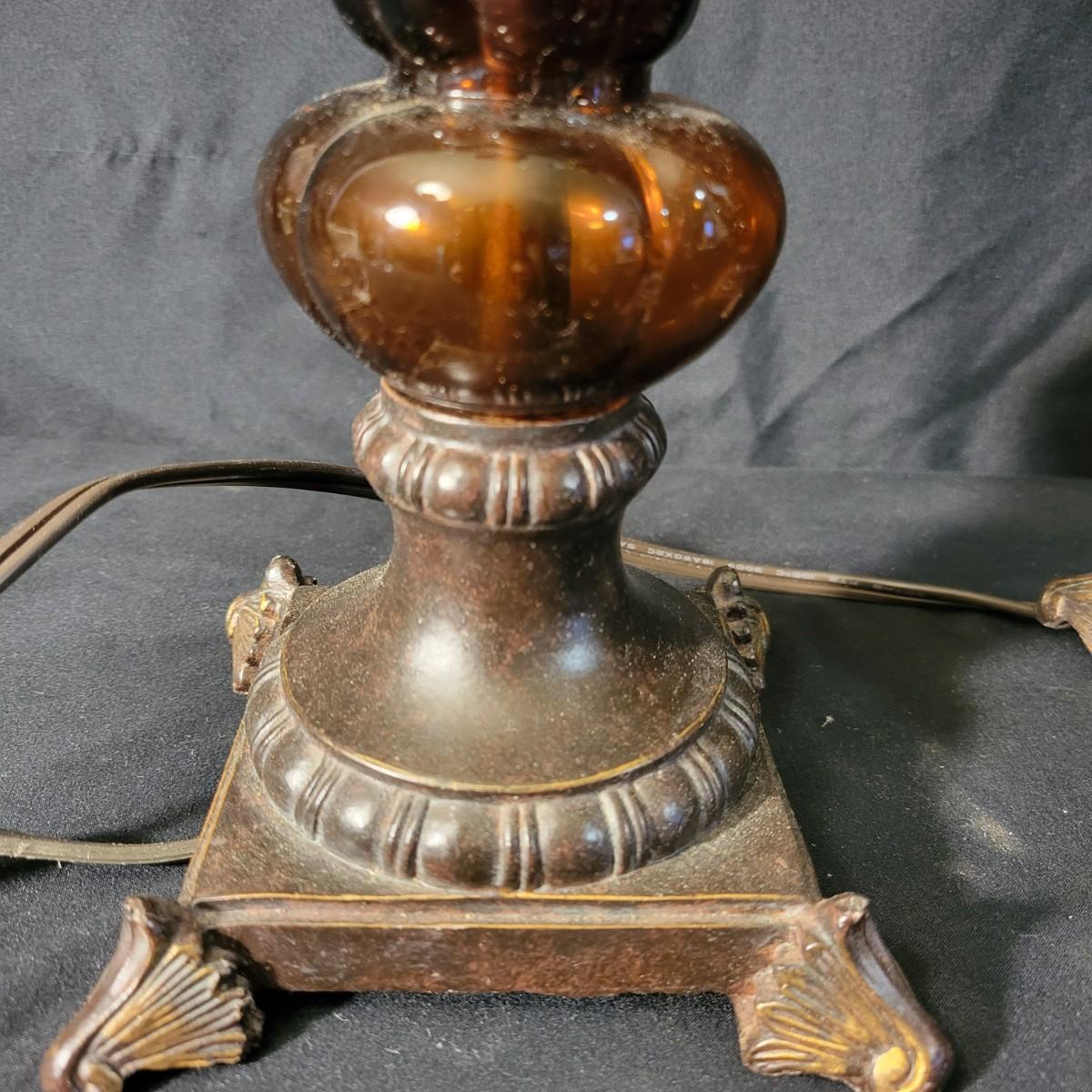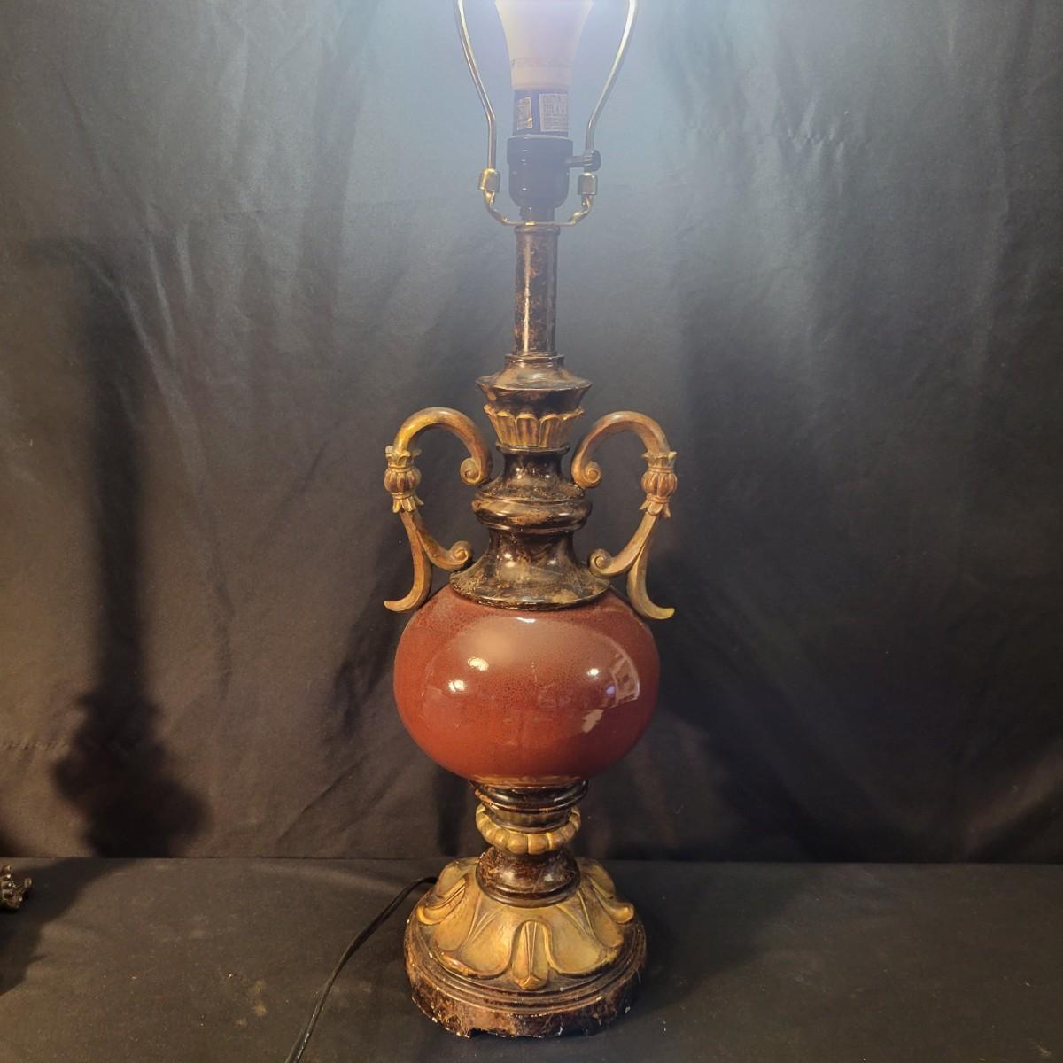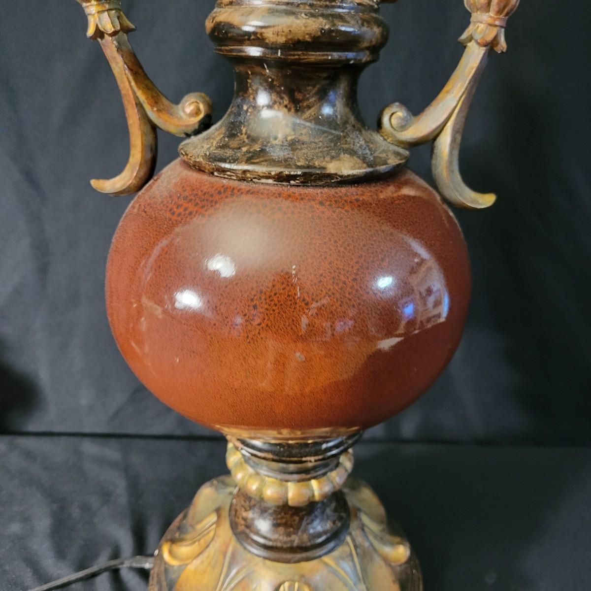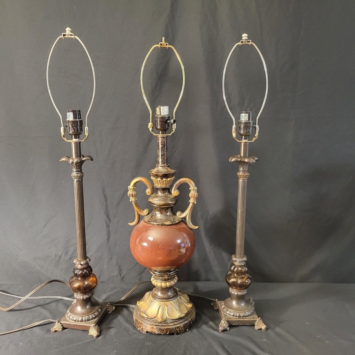 Three decorative lamps in good condition. Largest lamp does have some minor blemishes on its base, see attached pictures for more detail. All three lamps were tested and work. The matching pair have metal bases with a decorative glass ball and a palm leaf design. These lamps measure approximately 5" x 29.5". The larger lamp appears to be a plaster mold base with a decorative orange ceramic accent ball in its middle. Lamp measures approximately 6.5" x 29" Local pickup only
