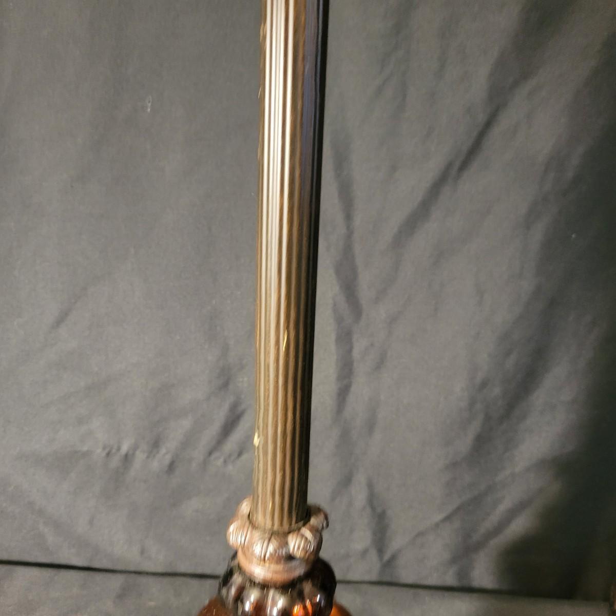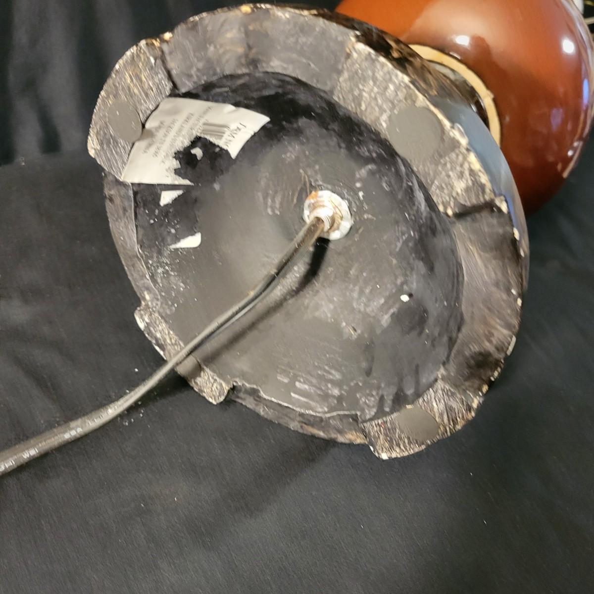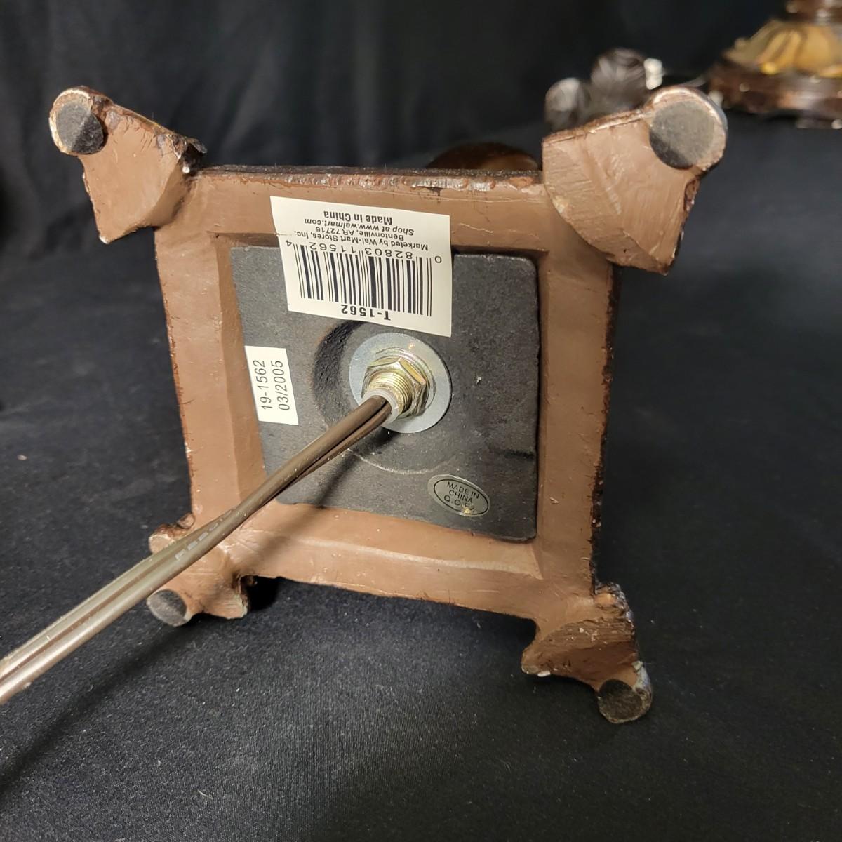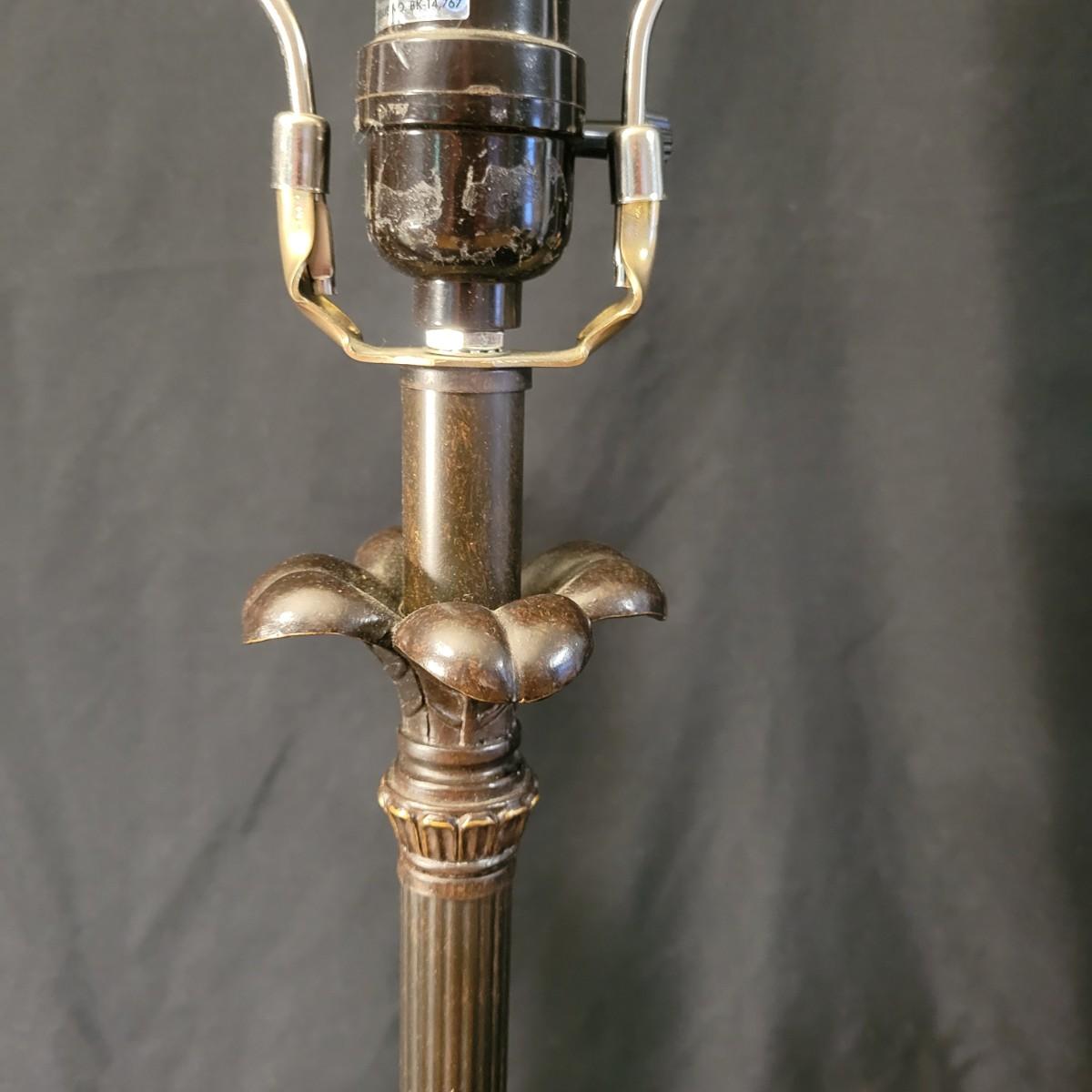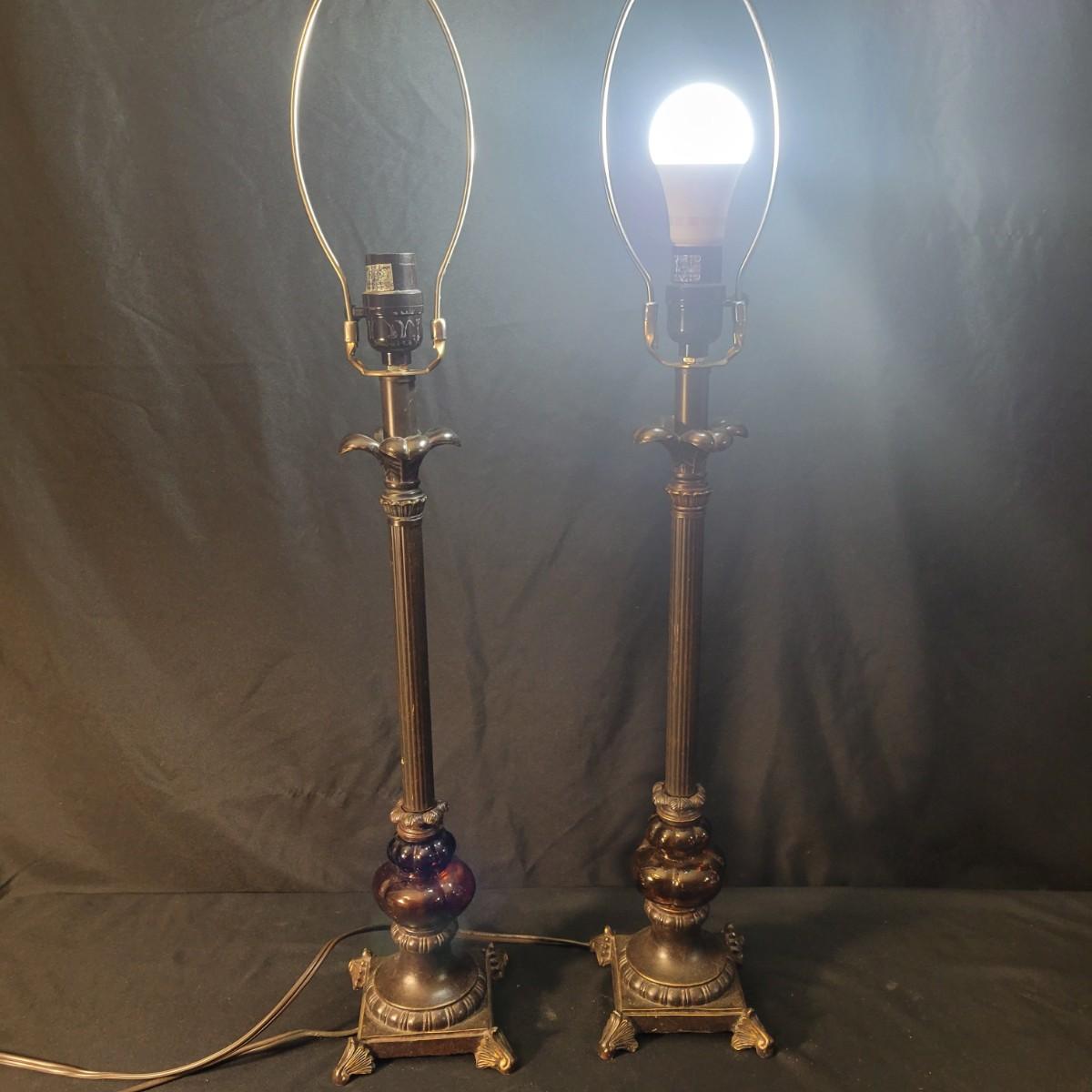 Three decorative lamps in good condition. Largest lamp does have some minor blemishes on its base, see attached pictures for more detail. All three lamps were tested and work. The matching pair have metal bases with a decorative glass ball and a palm leaf design. These lamps measure approximately 5" x 29.5". The larger lamp appears to be a plaster mold base with a decorative orange ceramic accent ball in its middle. Lamp measures approximately 6.5" x 29" Local pickup only