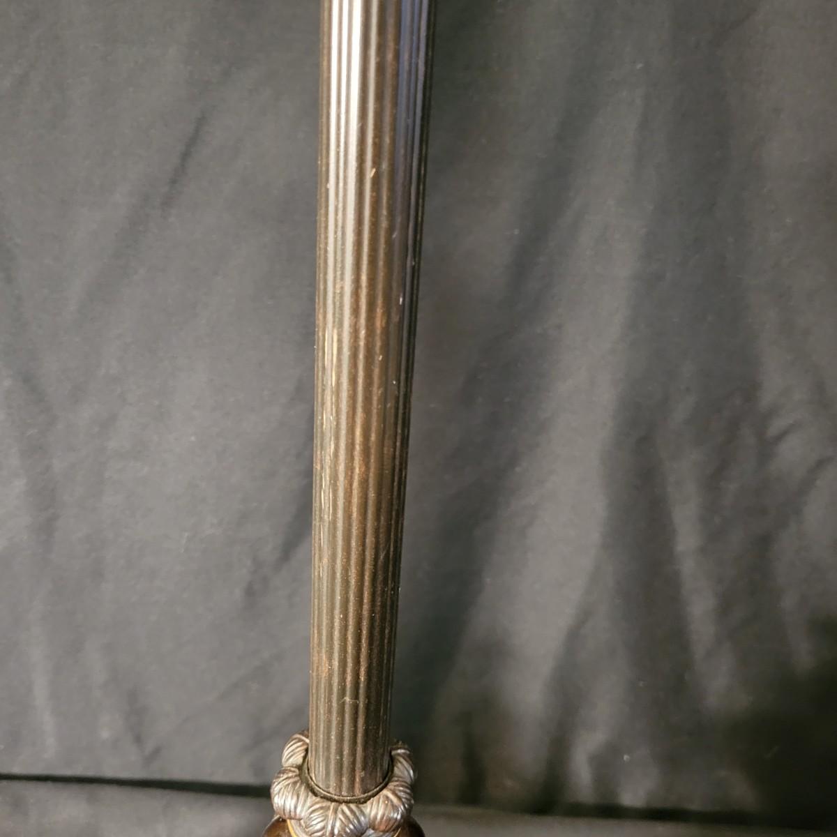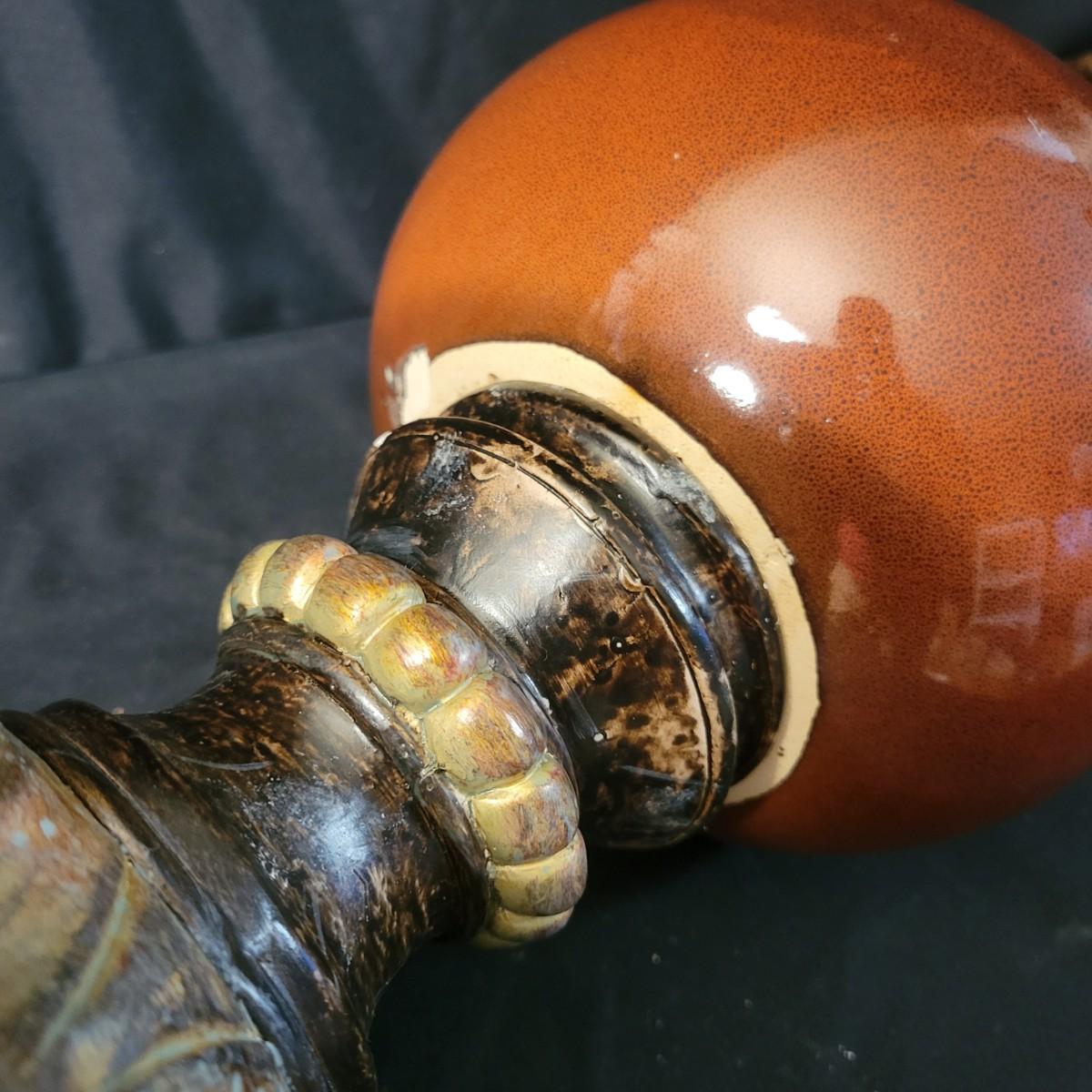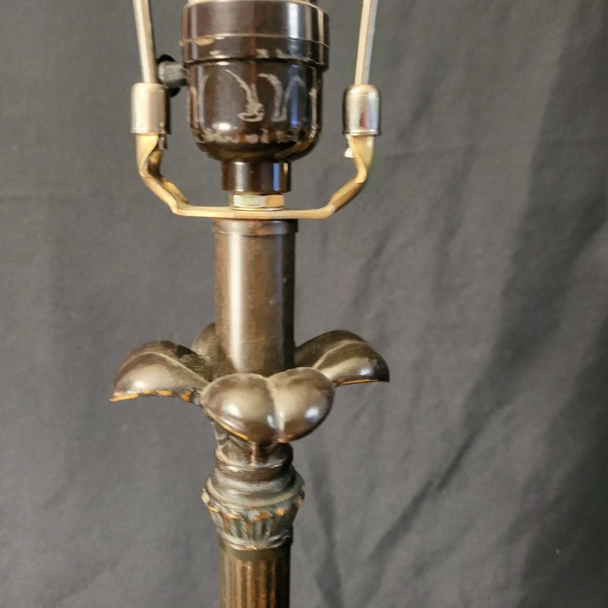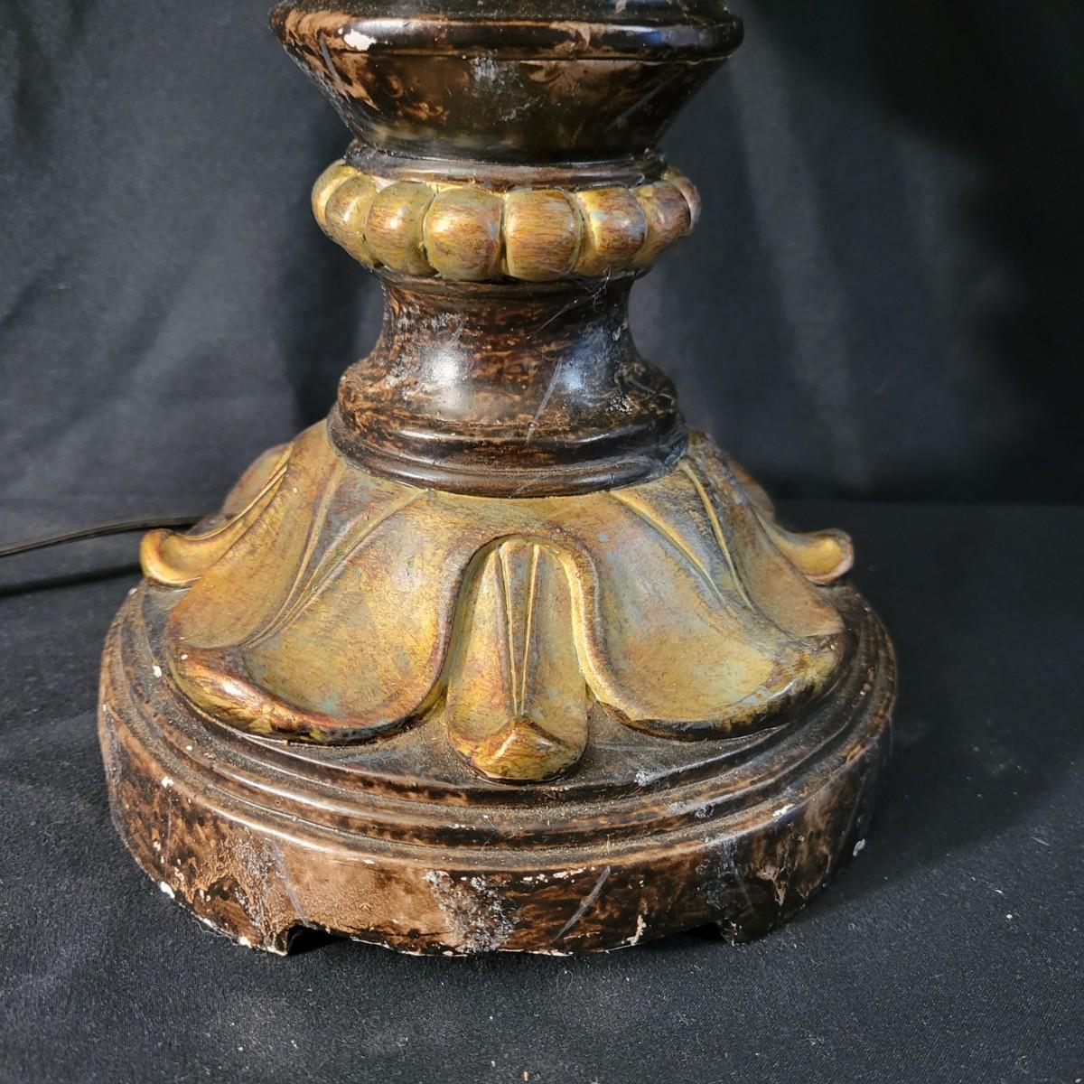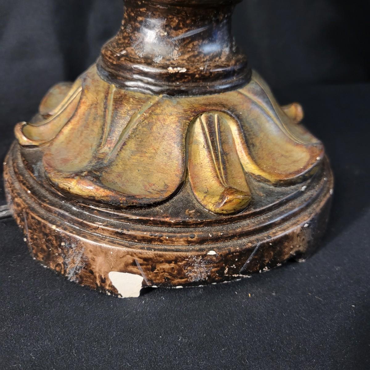 Three decorative lamps in good condition. Largest lamp does have some minor blemishes on its base, see attached pictures for more detail. All three lamps were tested and work. The matching pair have metal bases with a decorative glass ball and a palm leaf design. These lamps measure approximately 5" x 29.5". The larger lamp appears to be a plaster mold base with a decorative orange ceramic accent ball in its middle. Lamp measures approximately 6.5" x 29" Local pickup only