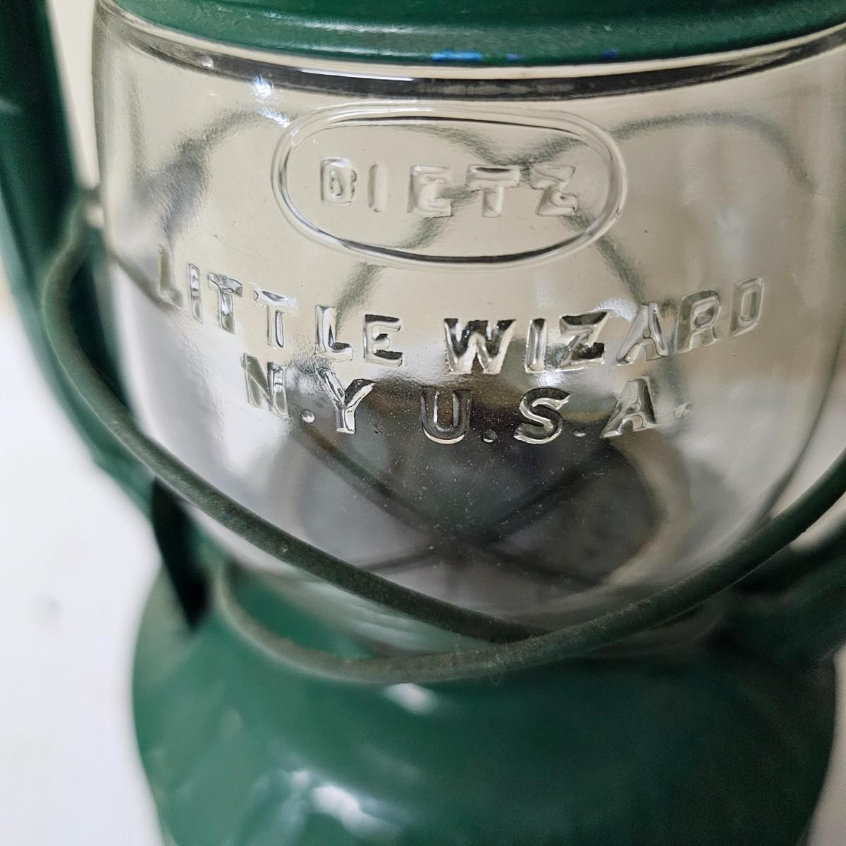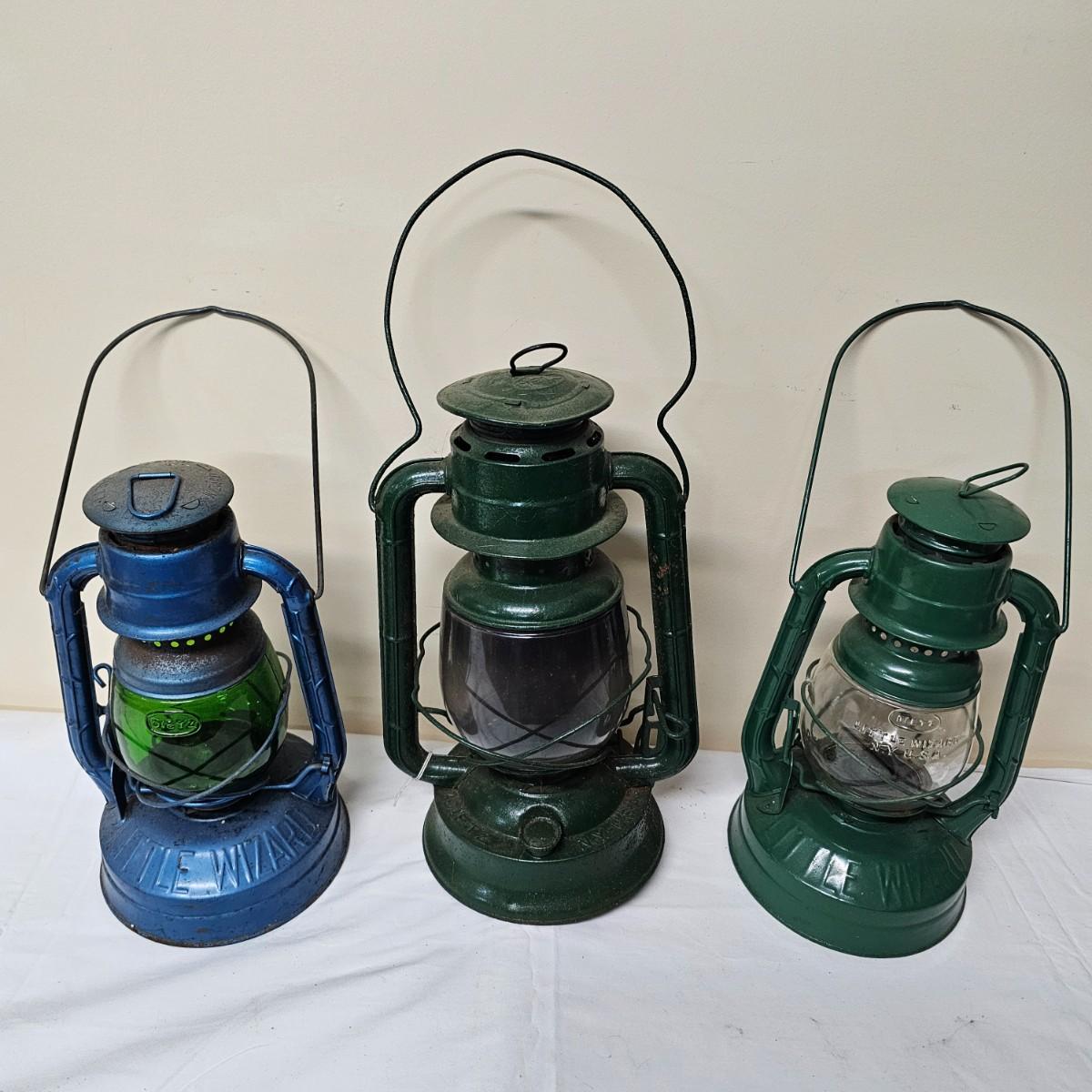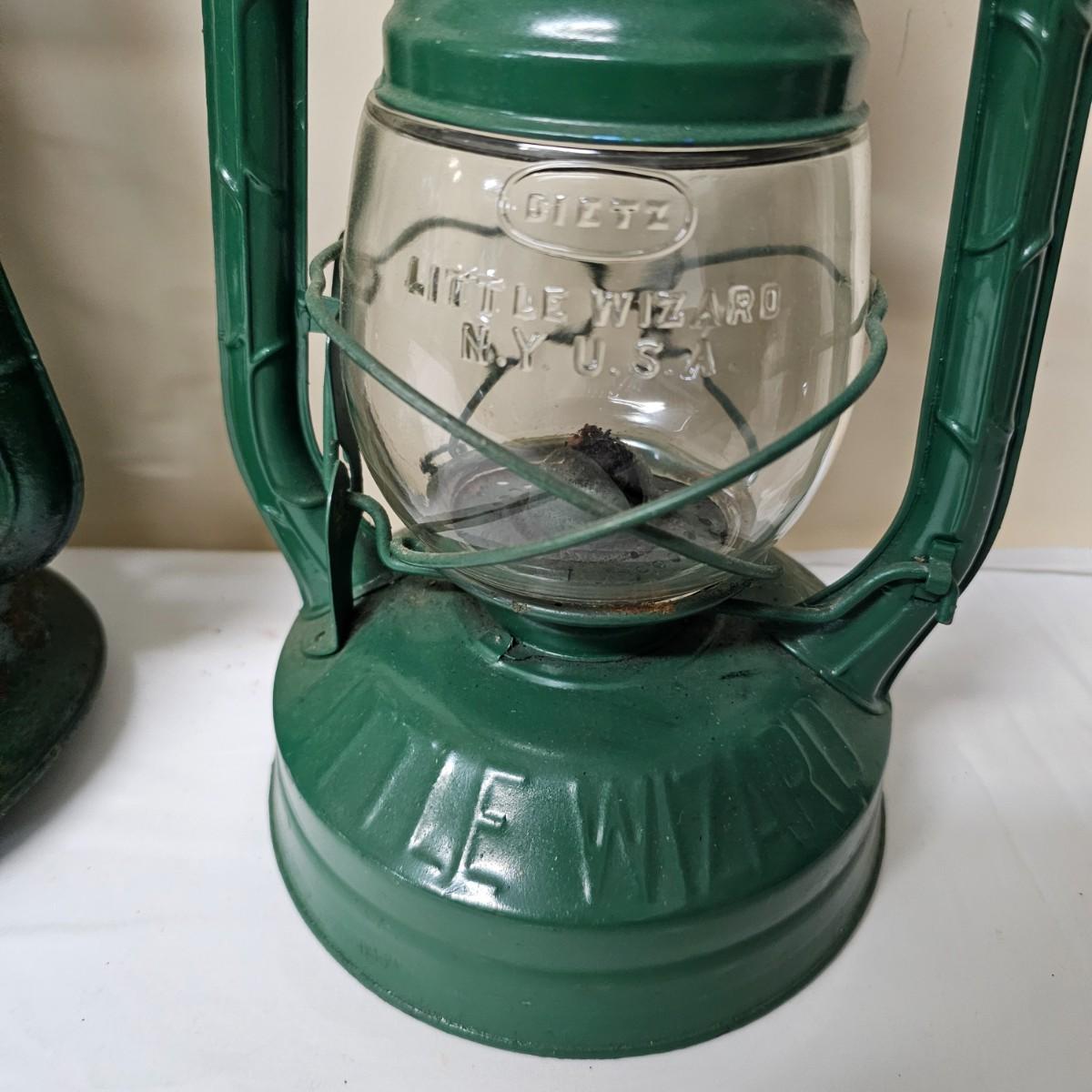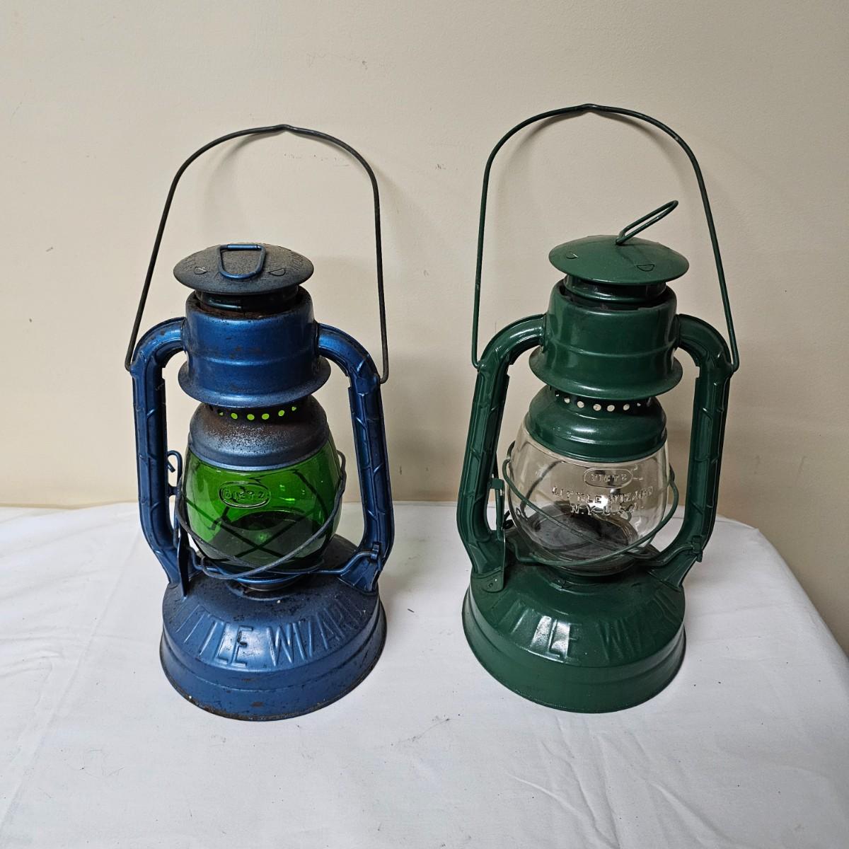 Two 'Little Wizard' and one No 2 De-Lite kerosene lanterns by Dietz of New York. Lanterns are likely 1940's to 1960's vintage. Little Wizards are one green with clear chimney and one blue with green chimney. Each measures6.5" x 6.25" x 15.5"H. Dark green No 2 Lanterns has smoke occluded clear globe, is 8.5" x 7" x 18.5"H. Some rust and wear on all items. See photos for details. Shipping available.