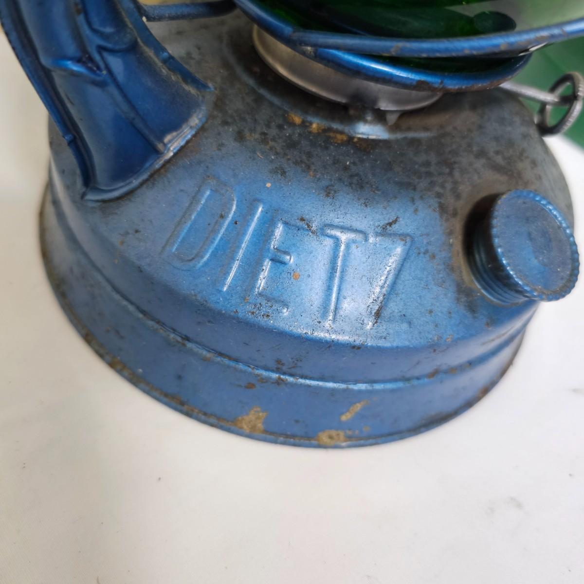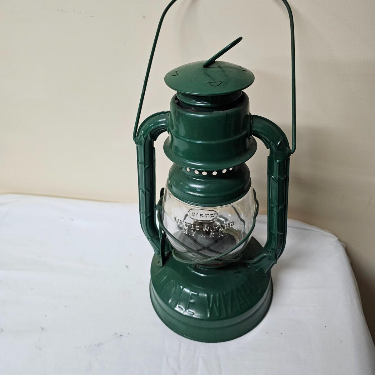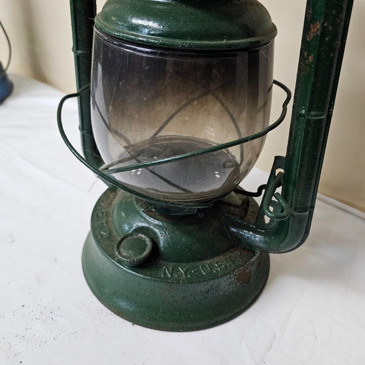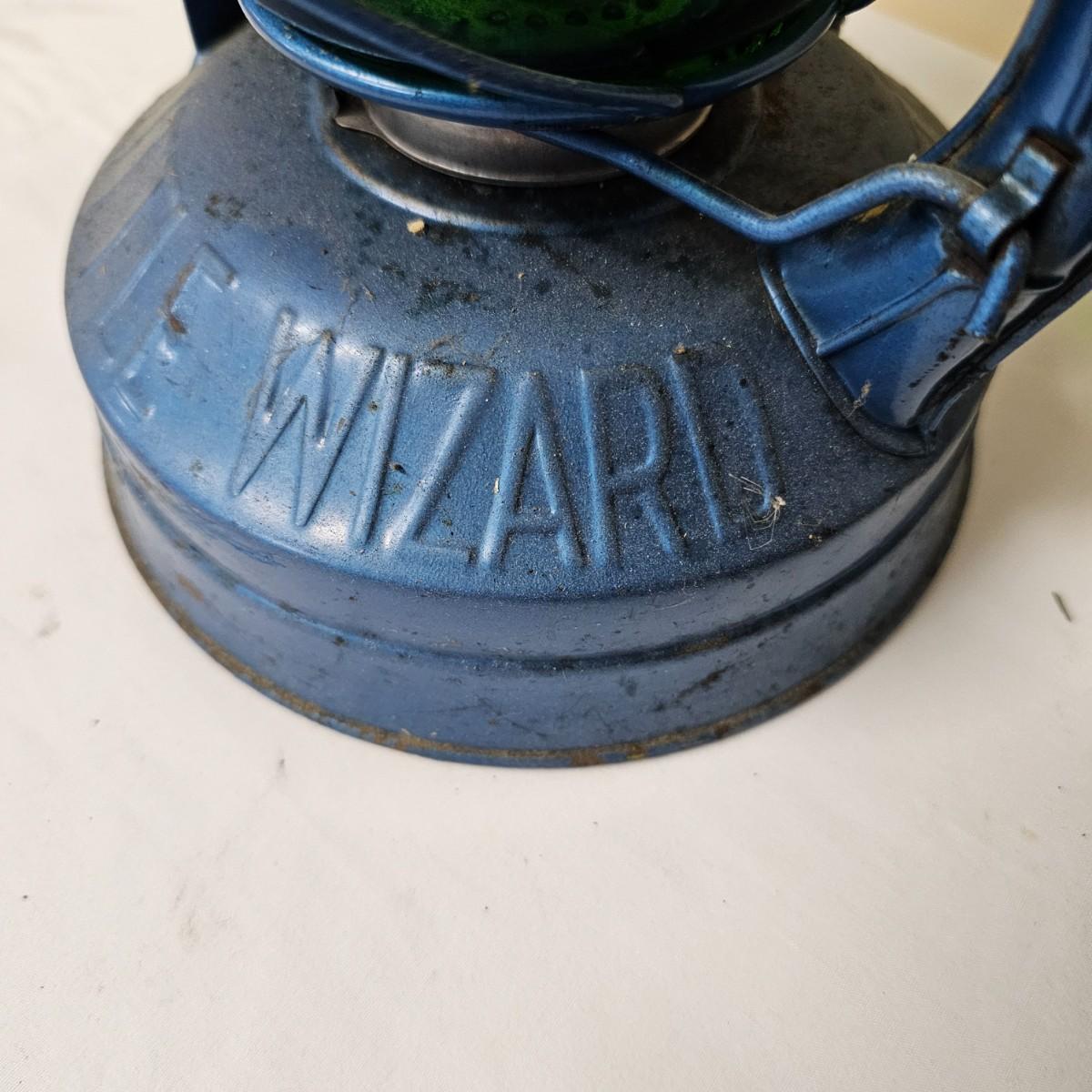 Two 'Little Wizard' and one No 2 De-Lite kerosene lanterns by Dietz of New York. Lanterns are likely 1940's to 1960's vintage. Little Wizards are one green with clear chimney and one blue with green chimney. Each measures6.5" x 6.25" x 15.5"H. Dark green No 2 Lanterns has smoke occluded clear globe, is 8.5" x 7" x 18.5"H. Some rust and wear on all items. See photos for details. Shipping available.