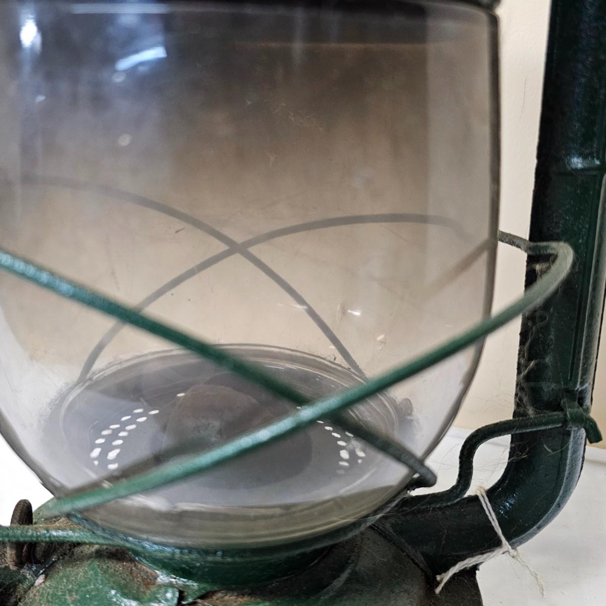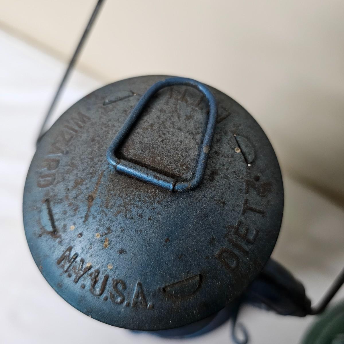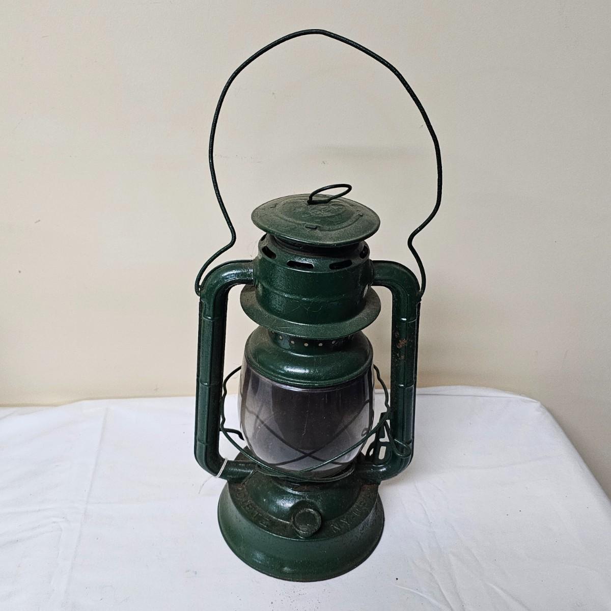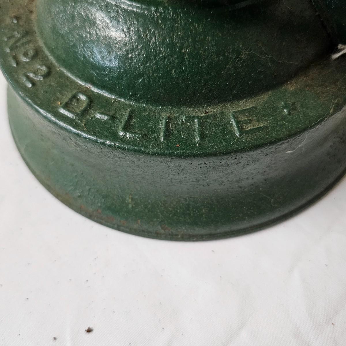 Two 'Little Wizard' and one No 2 De-Lite kerosene lanterns by Dietz of New York. Lanterns are likely 1940's to 1960's vintage. Little Wizards are one green with clear chimney and one blue with green chimney. Each measures6.5" x 6.25" x 15.5"H. Dark green No 2 Lanterns has smoke occluded clear globe, is 8.5" x 7" x 18.5"H. Some rust and wear on all items. See photos for details. Shipping available.