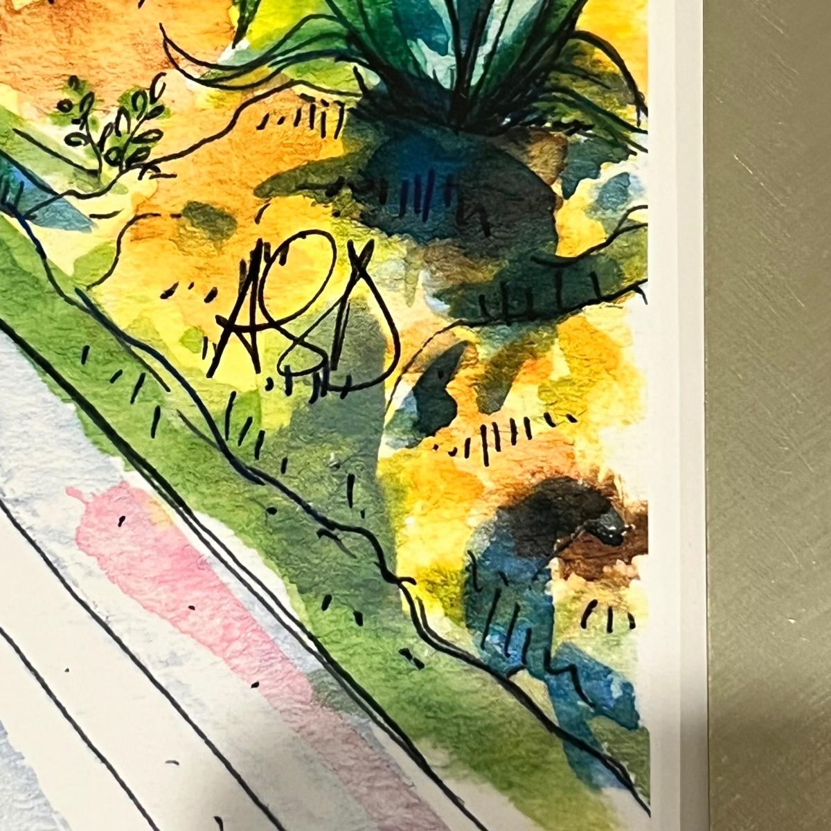 These three prints appear to watercolor & pen, and all have artists initials. They are in matching pale gold metallic frames and under glass.