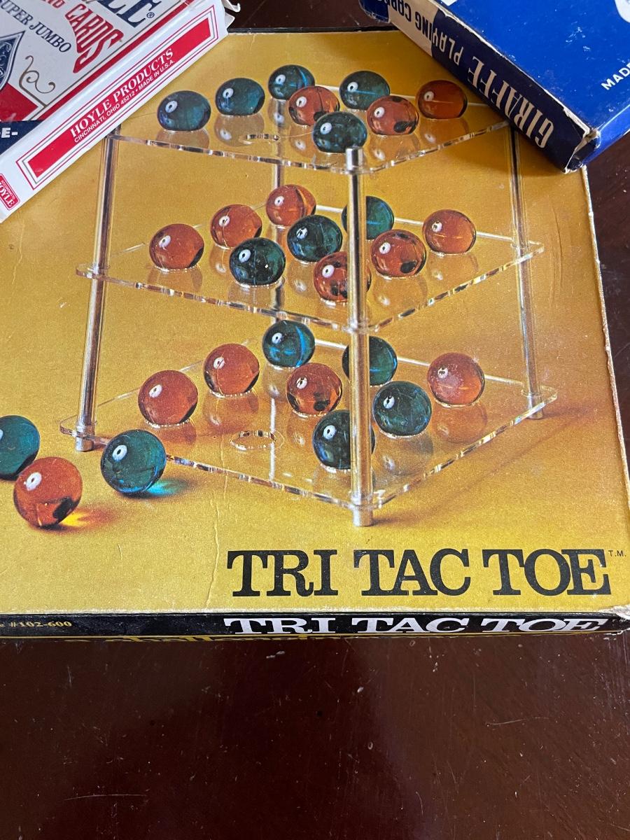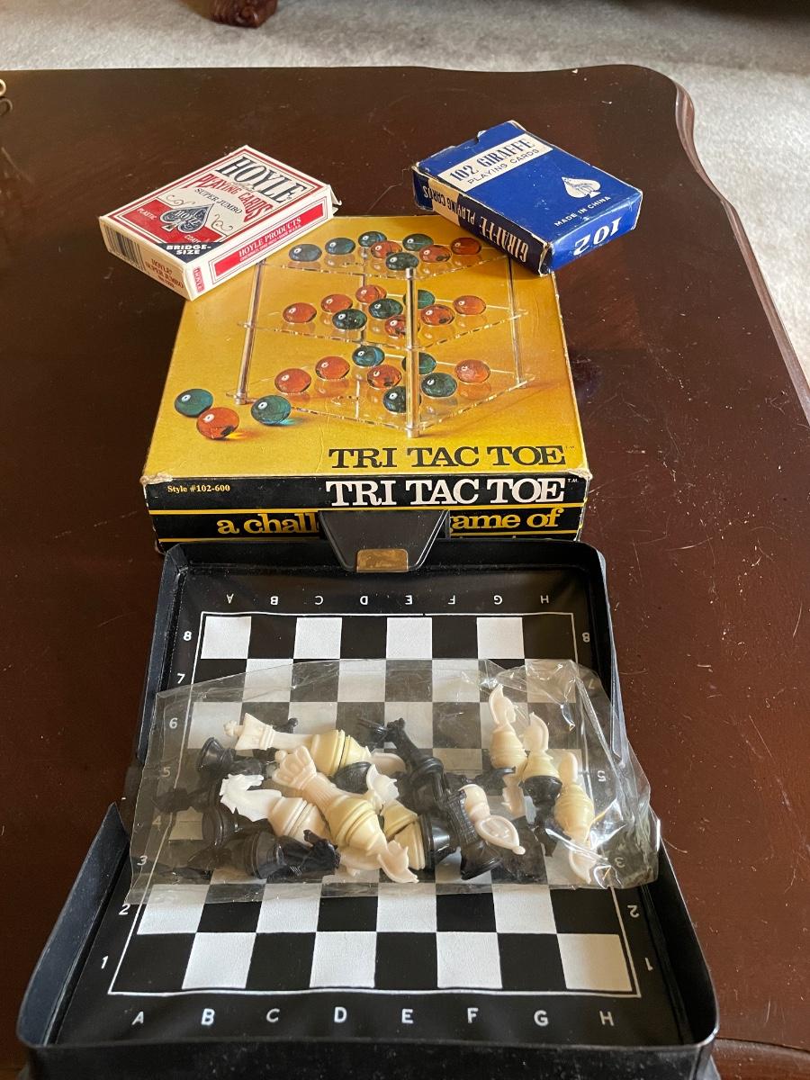 THREE DIMENSIONAL TIC TAC TOE, MAGNETIC CHESS SET & DECKS OF CARDS