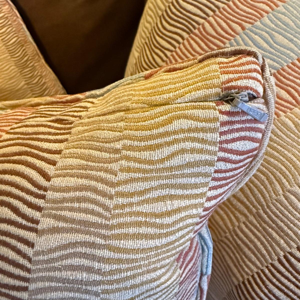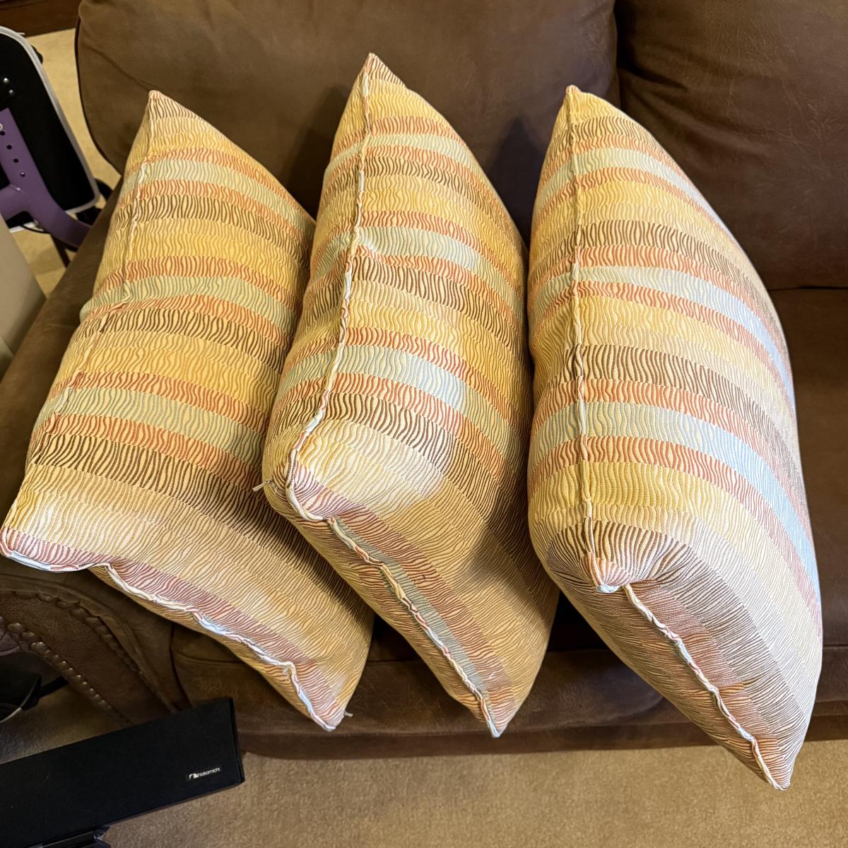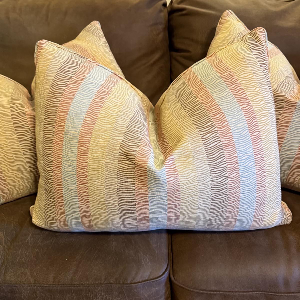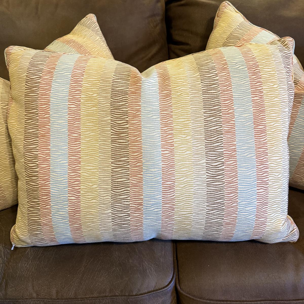 This lot contains three gorgeous rectangular goose down throw pillows with Hickory Springs tags. Each one features a wavy multicolored pattern with beige, brown, blue and clay-red. They all measure 24.5” x 19” x 9”.