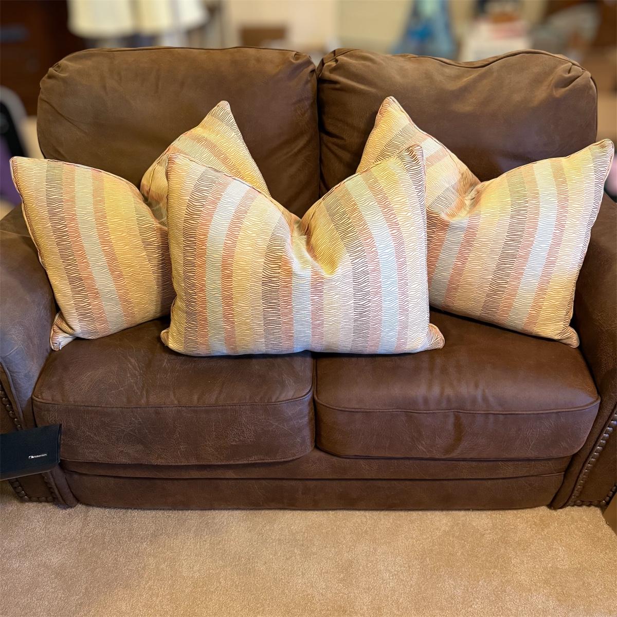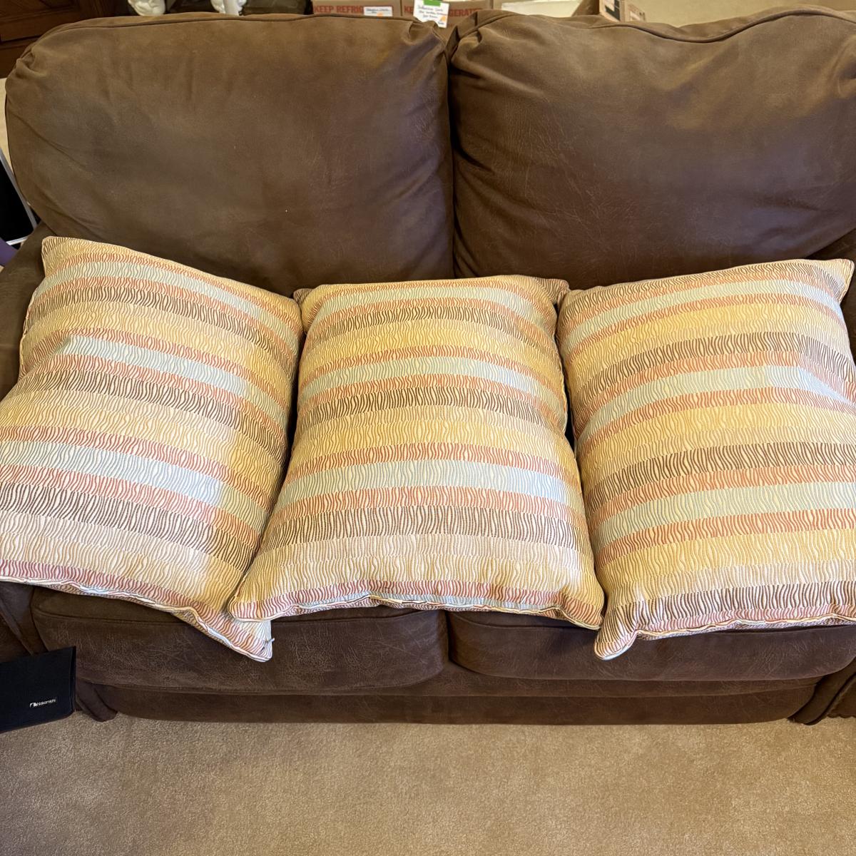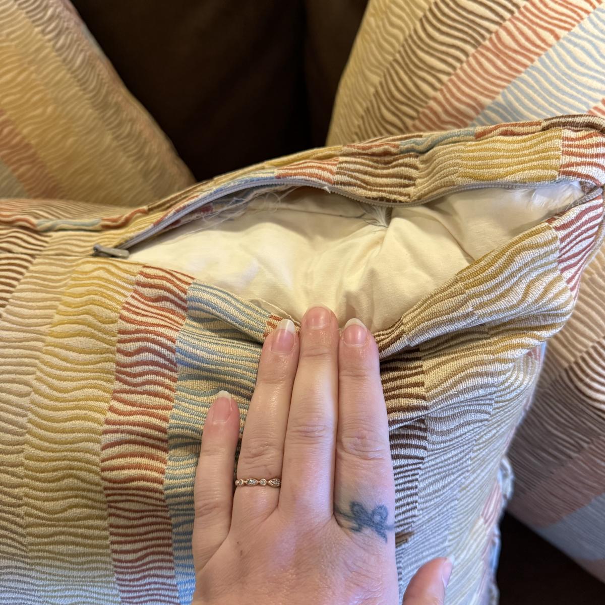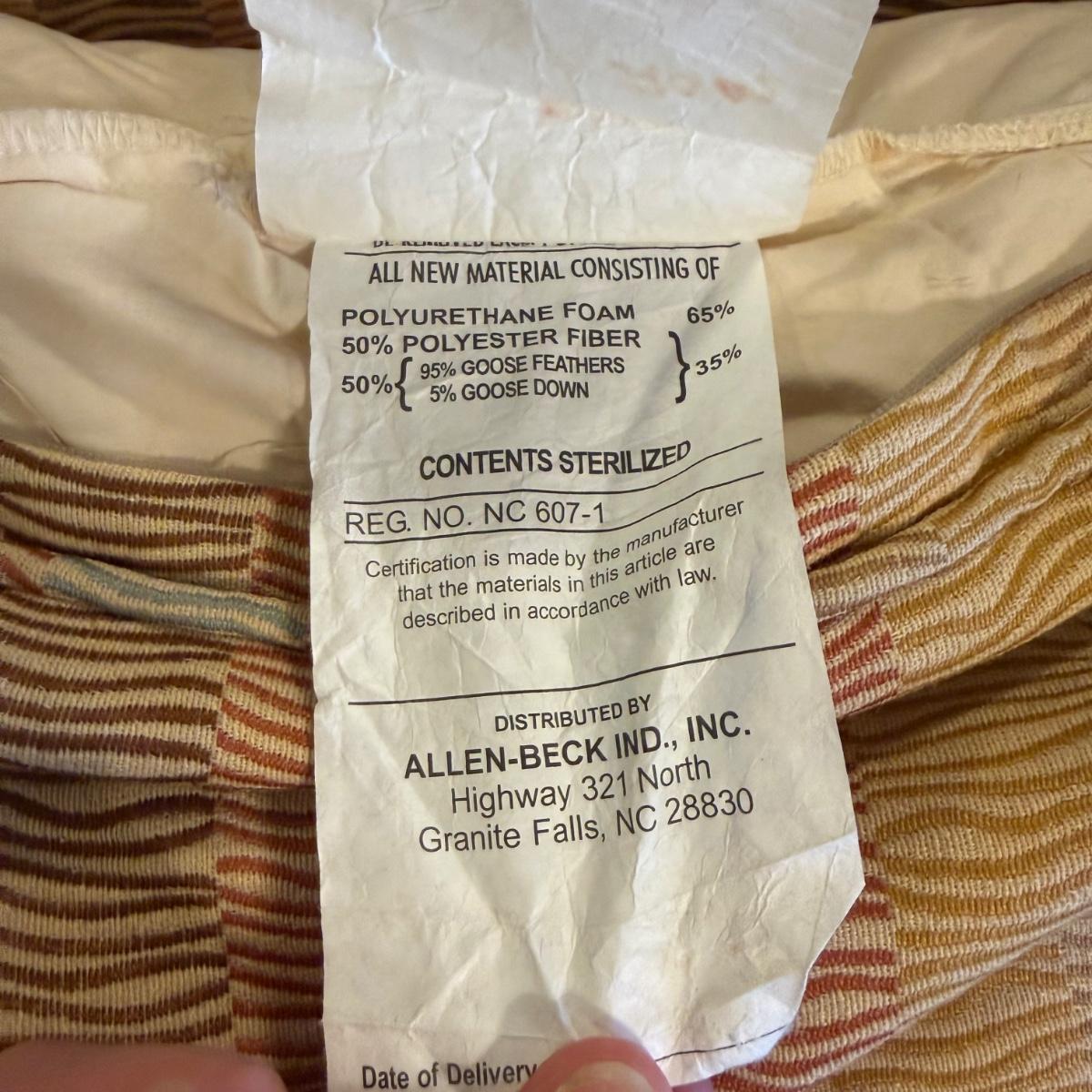 This lot contains three gorgeous rectangular goose down throw pillows with Hickory Springs tags. Each one features a wavy multicolored pattern with beige, brown, blue and clay-red. They all measure 24.5” x 19” x 9”.