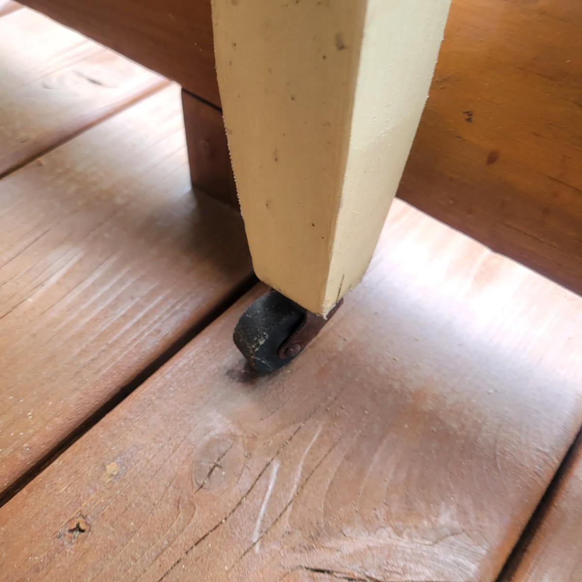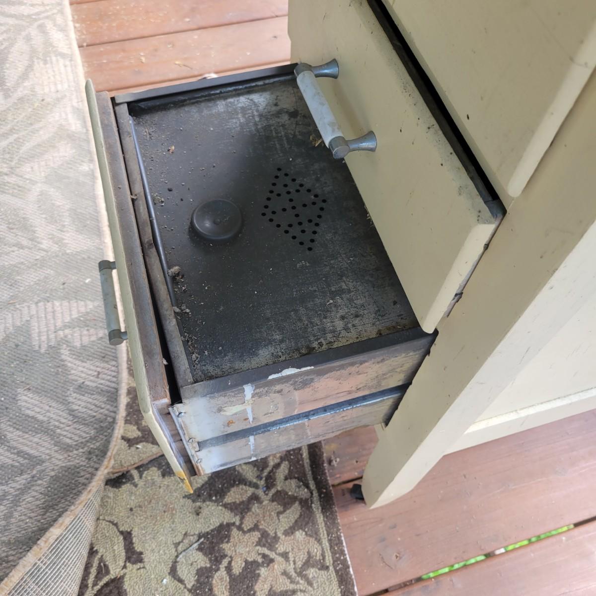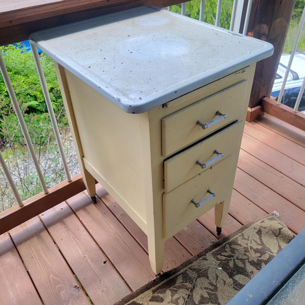 A small three drawer cabinet with a work surface pullout. This cabinet has small casters with a lidded bread drawer on the bottom.. The top is an enameled metal surface. It measures approximately 20" x 24" x 32.5". Local pickup only