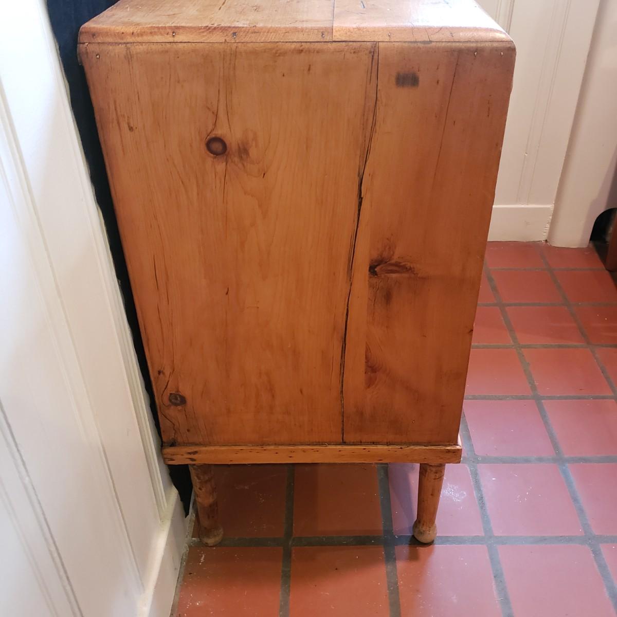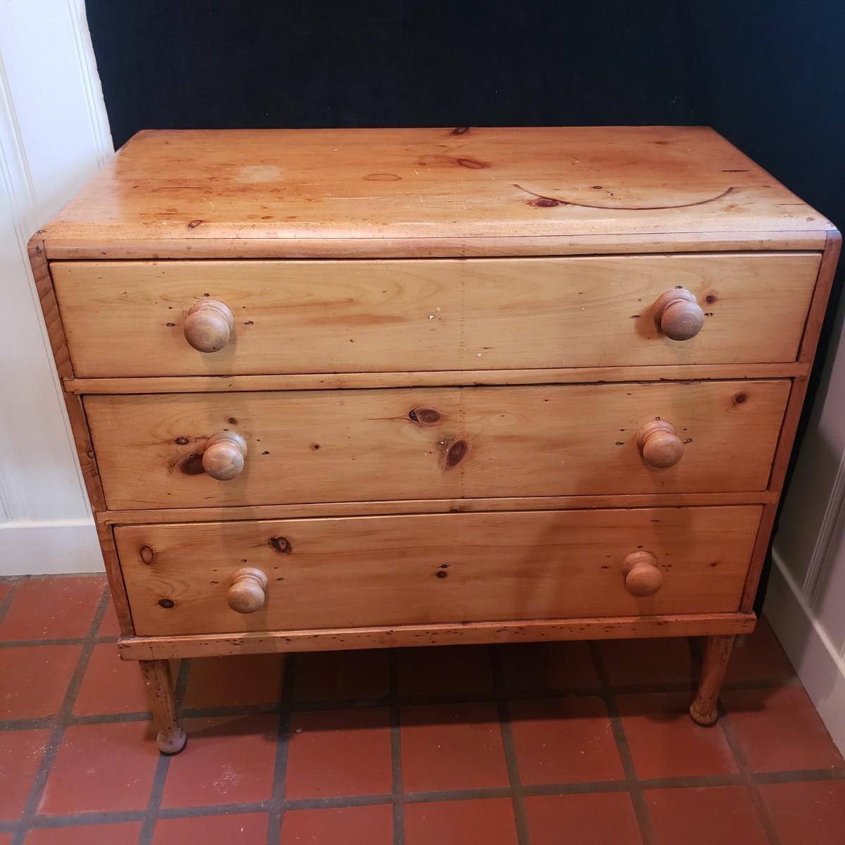 This is a wooden three drawer dresser with dovetailed drawers. The dresser has a light stain finish. The top has some water marks and a cresent burn like mark, see pictures. The dresser is light to the touch. Measures 33" x 18" x 32"H.