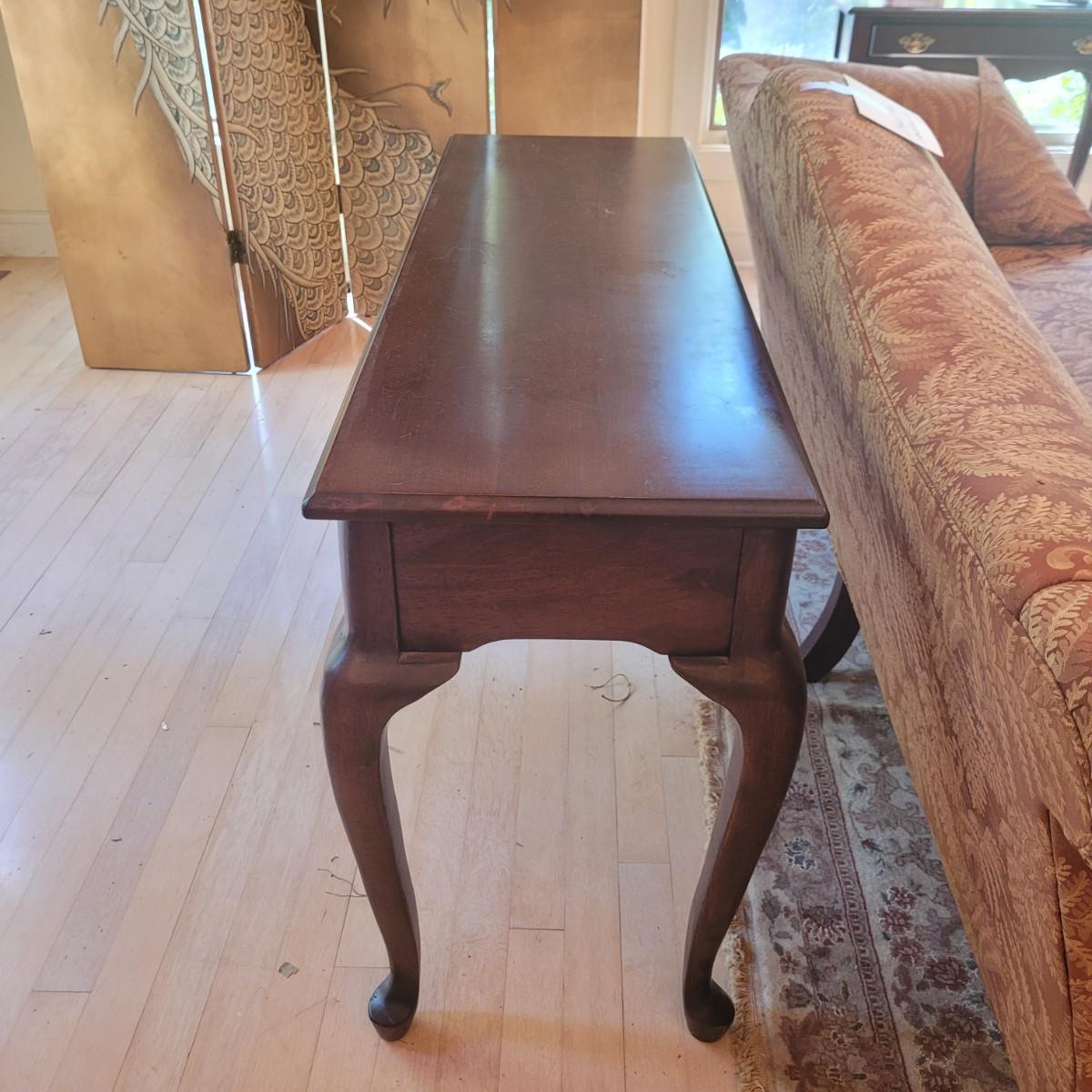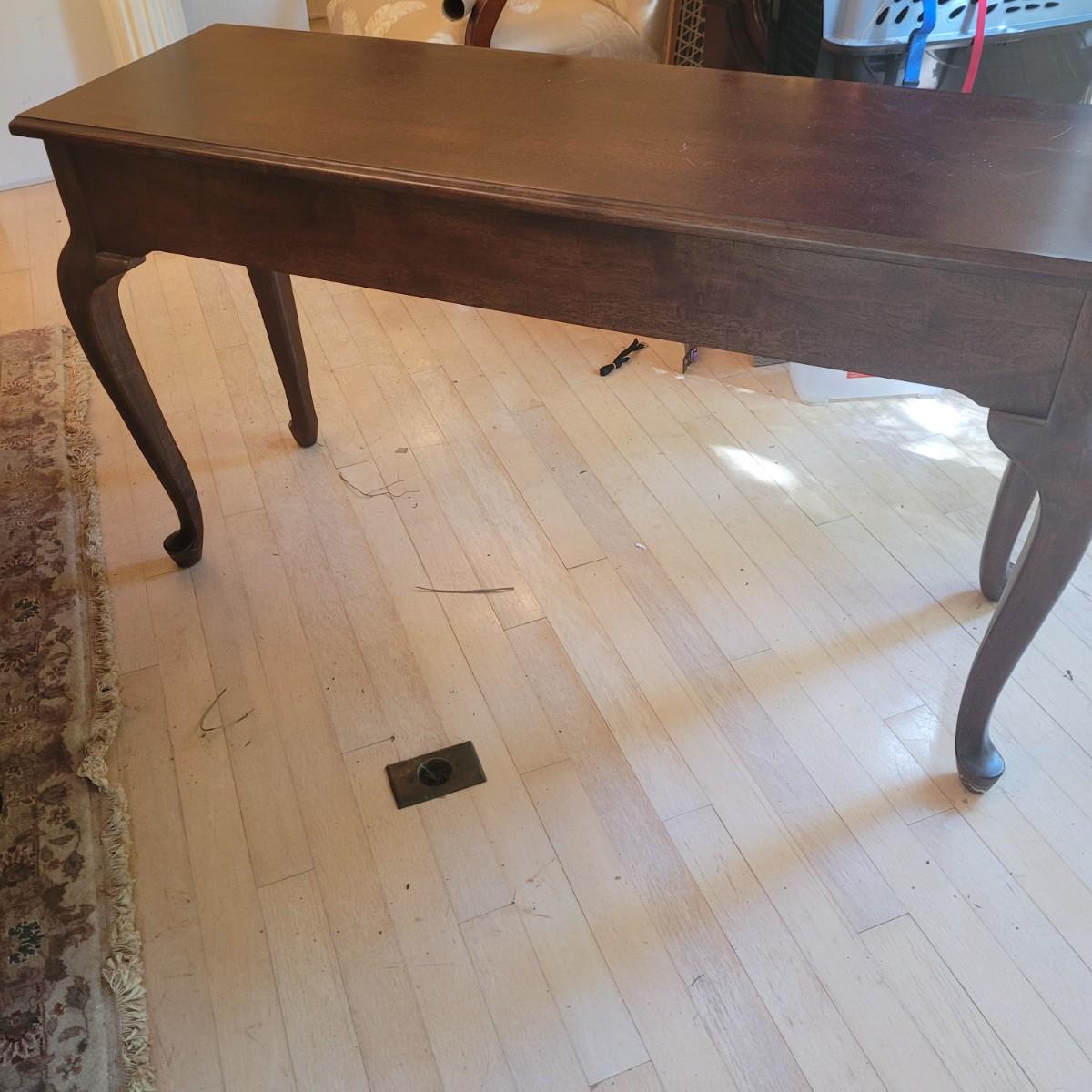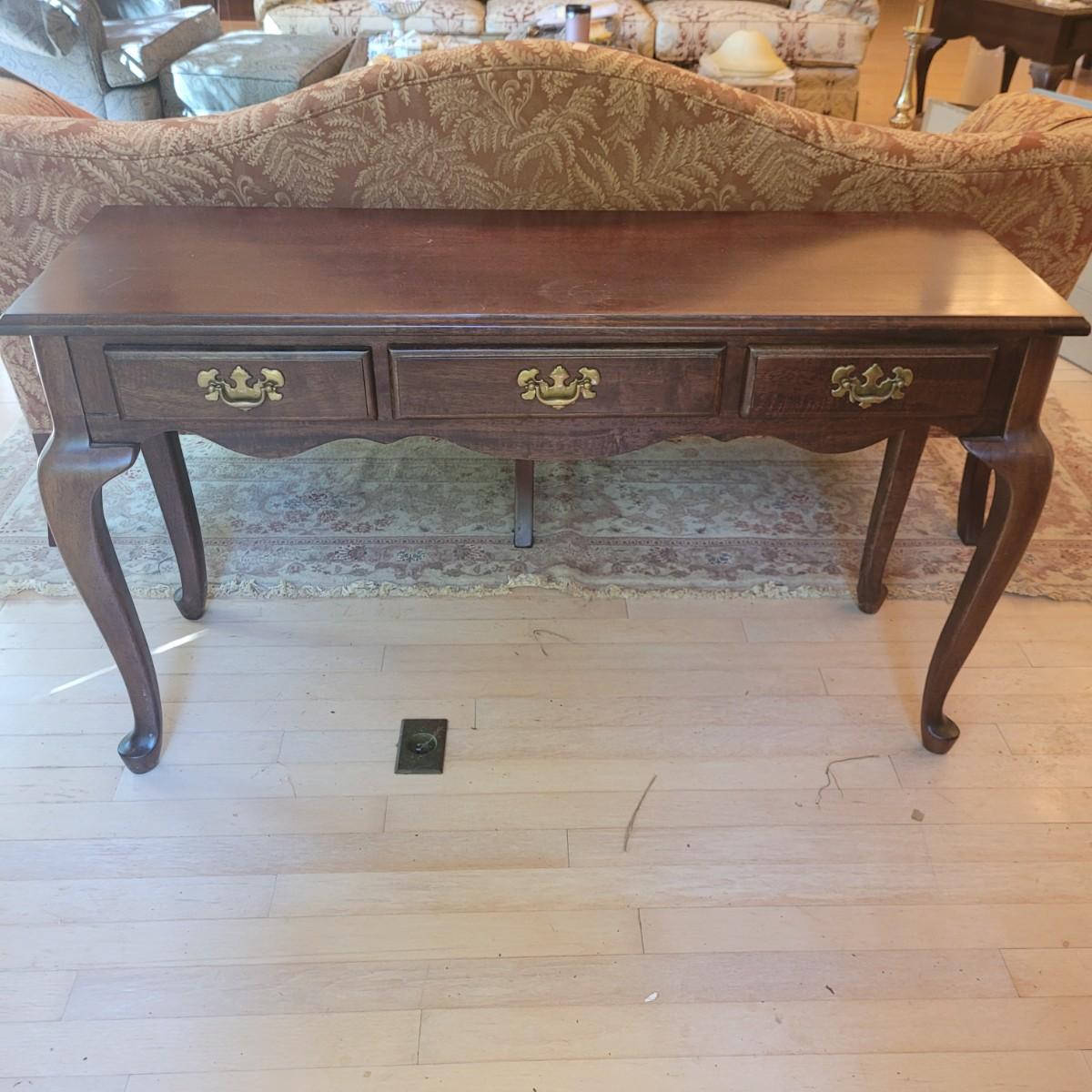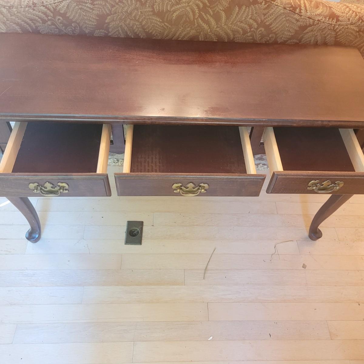 Wooden sofa table with three velvet lined drawers. Legs are sturdy, drawers open fairly easily (no rollers). Moderate amount of scuffs and scratches (see photos). Measures approximately 48"L x16"W x27.5"H. Local pickup only.
