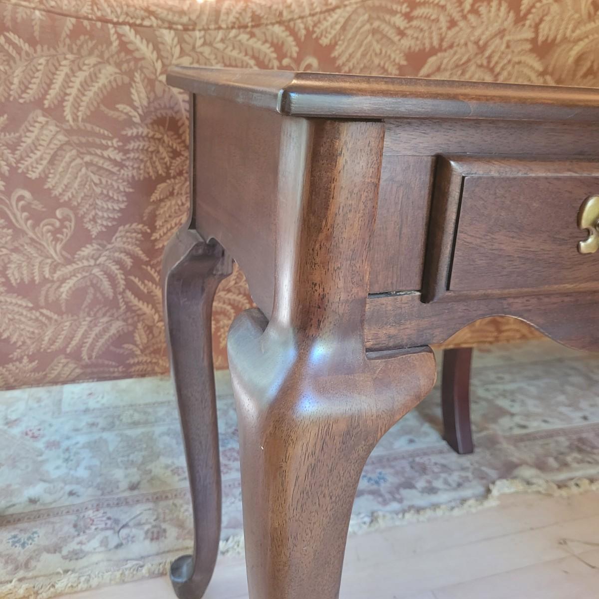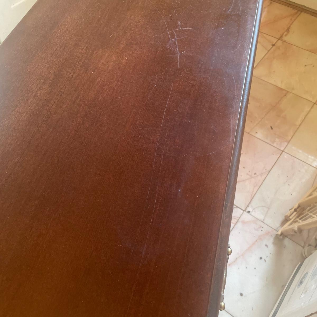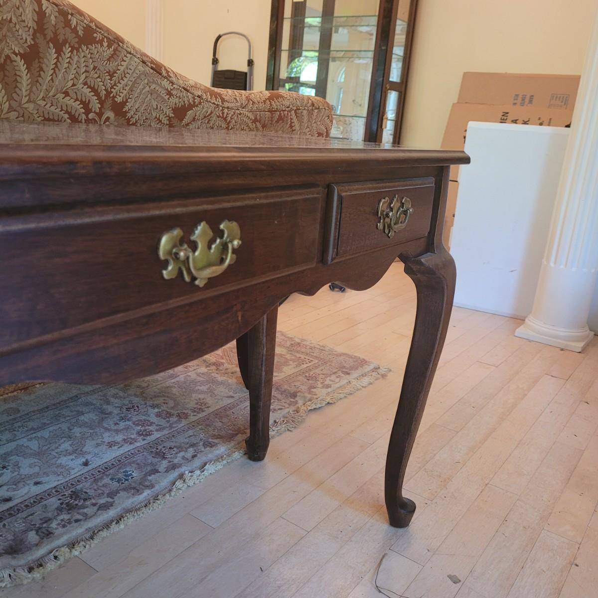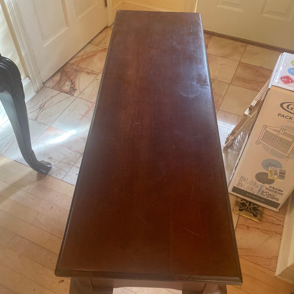 Wooden sofa table with three velvet lined drawers. Legs are sturdy, drawers open fairly easily (no rollers). Moderate amount of scuffs and scratches (see photos). Measures approximately 48"L x16"W x27.5"H. Local pickup only.