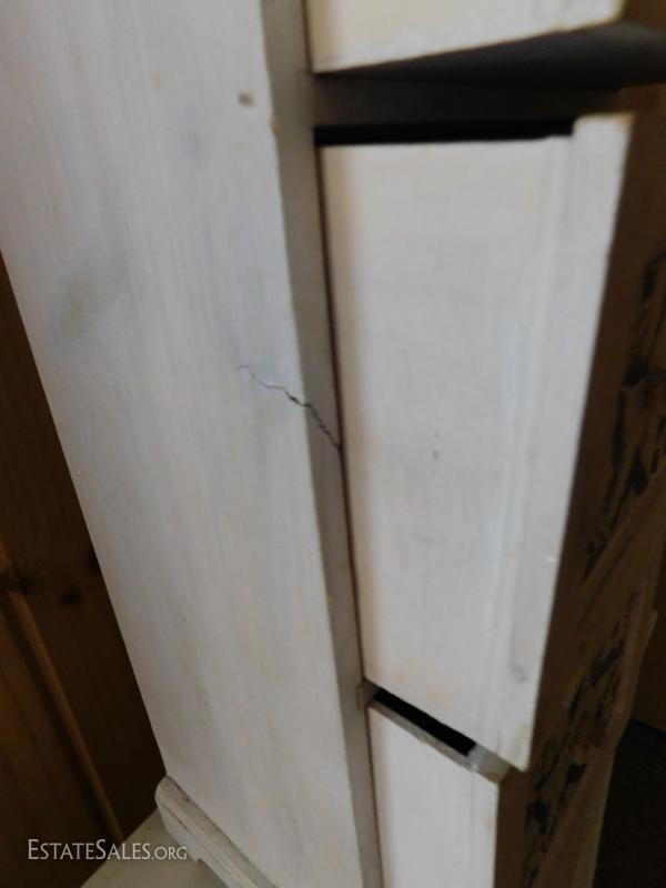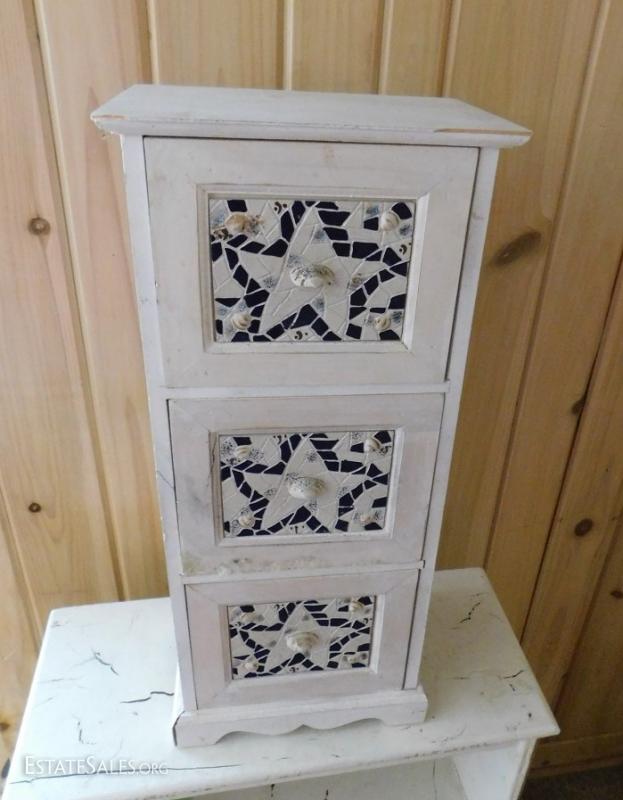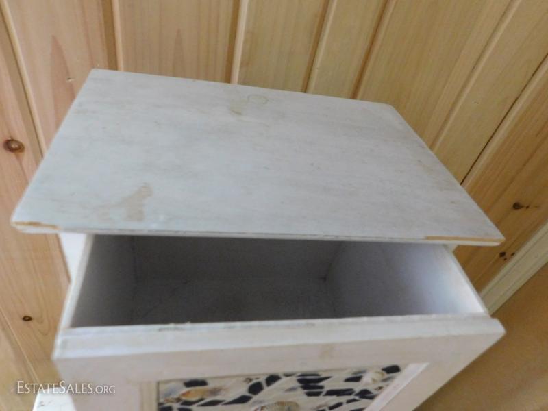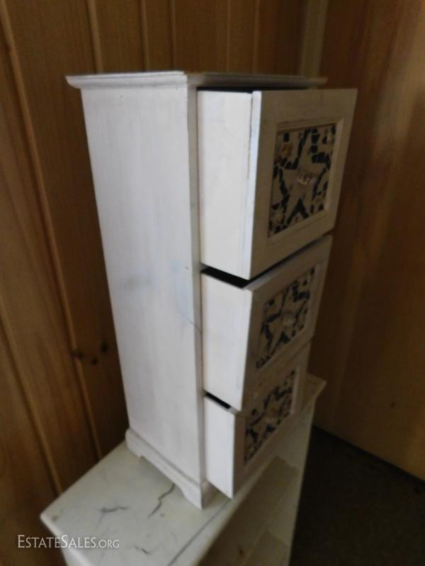 Three Drawer Storage Tower has tile with shells on face of drawers. Wood has some issues as shown.