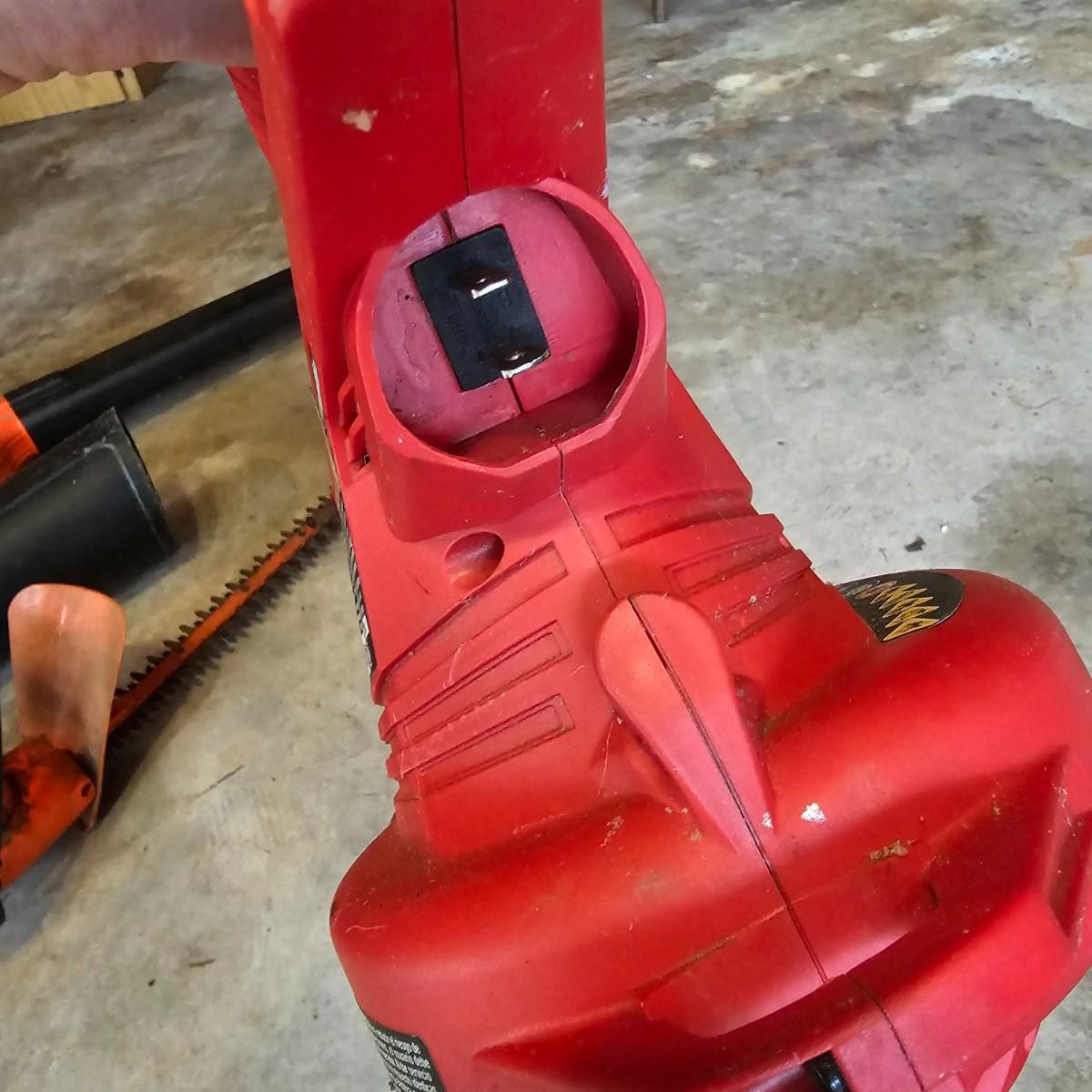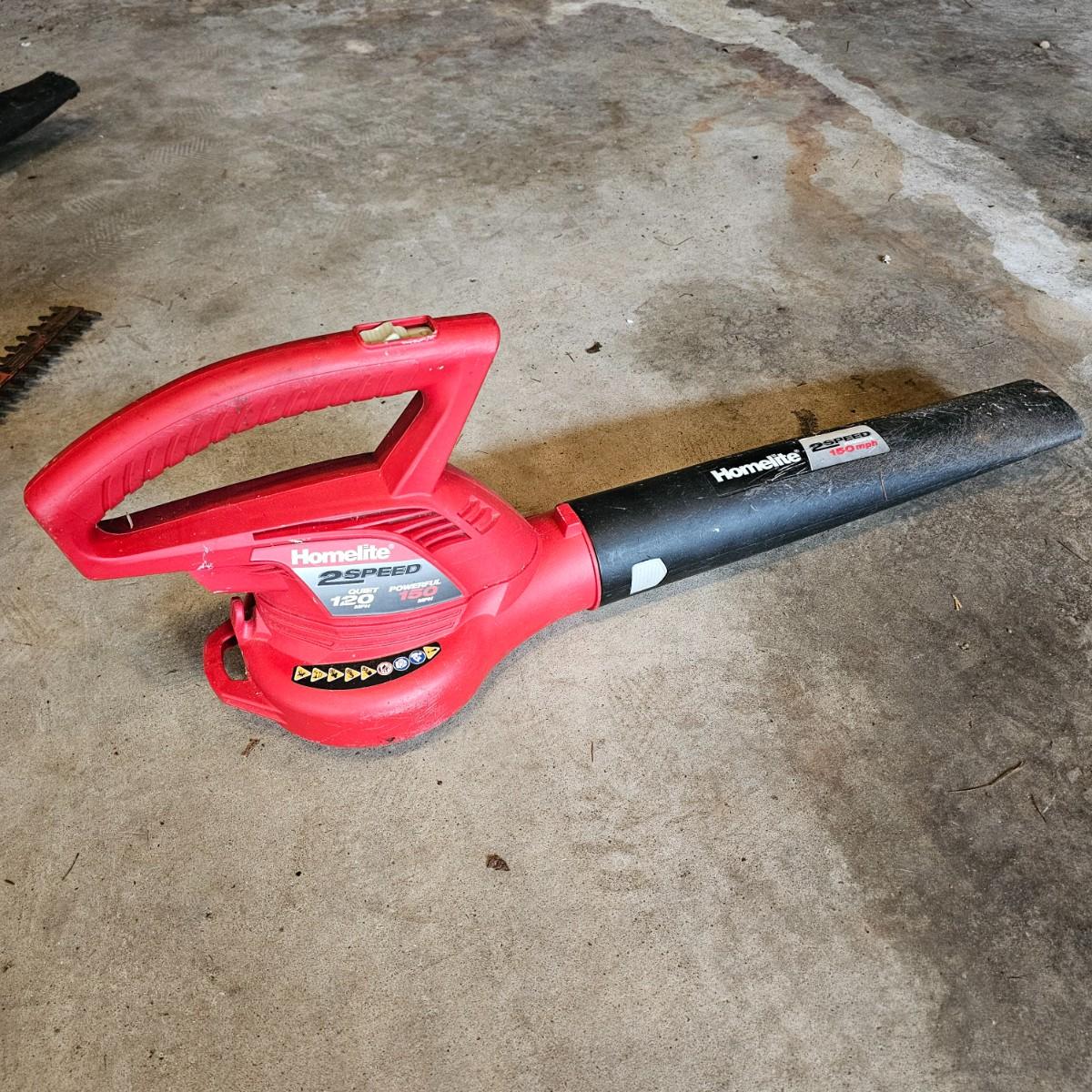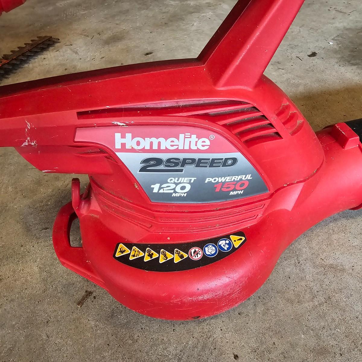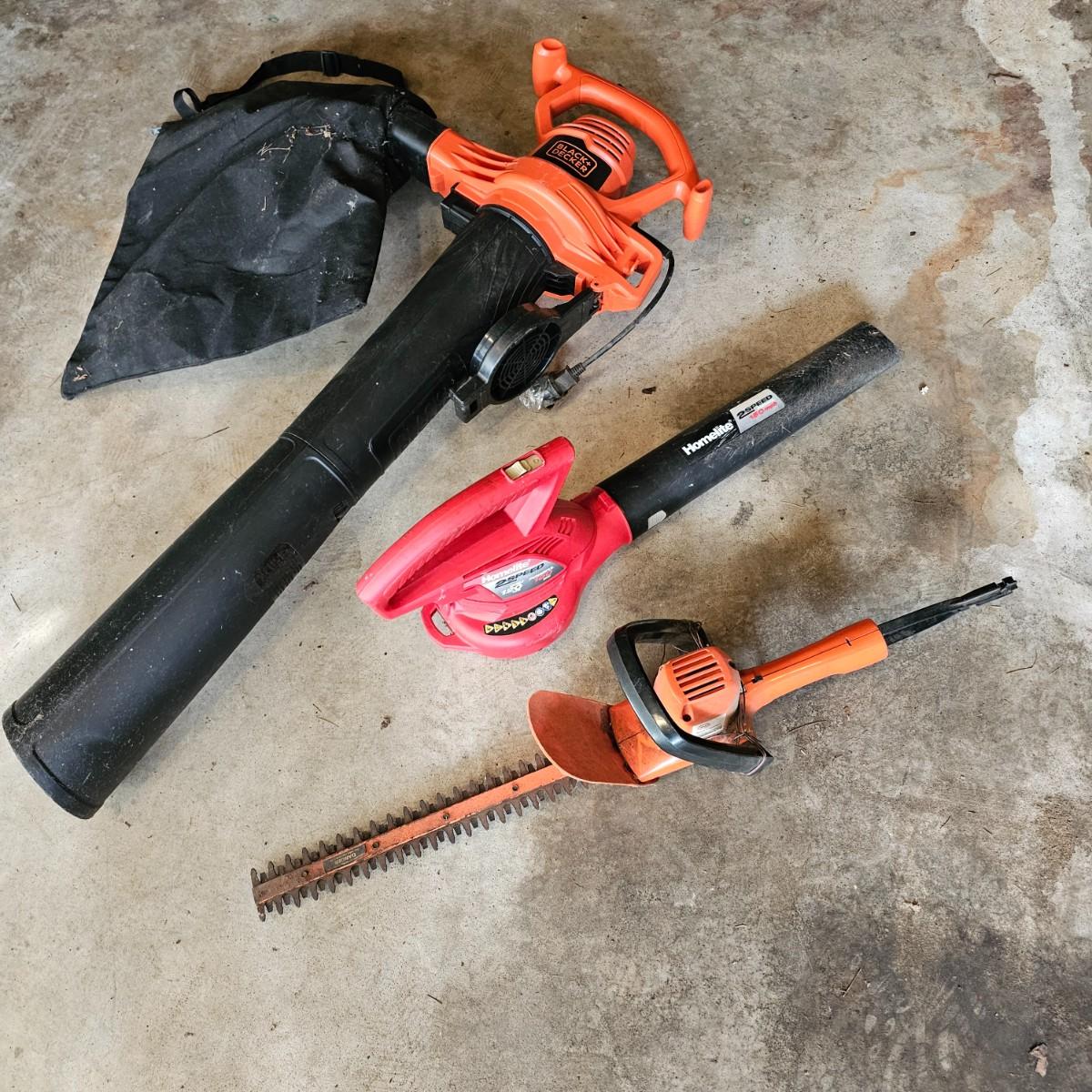 Two blowers and a hedge trimmer make up this lot. Small red Homelite blower is two speed, measures 6" x 29" long. Black & Decker hedge trimmer has 16" blade, measures 7" x 35" long. Handle has had some repair. Large unit is also Black & Decker and is a combo blower/vacuum, interchanging pieces and a mulching bag. 18" x 43" long. All units powered on when plugged in. See photos for details. Local pickup only.