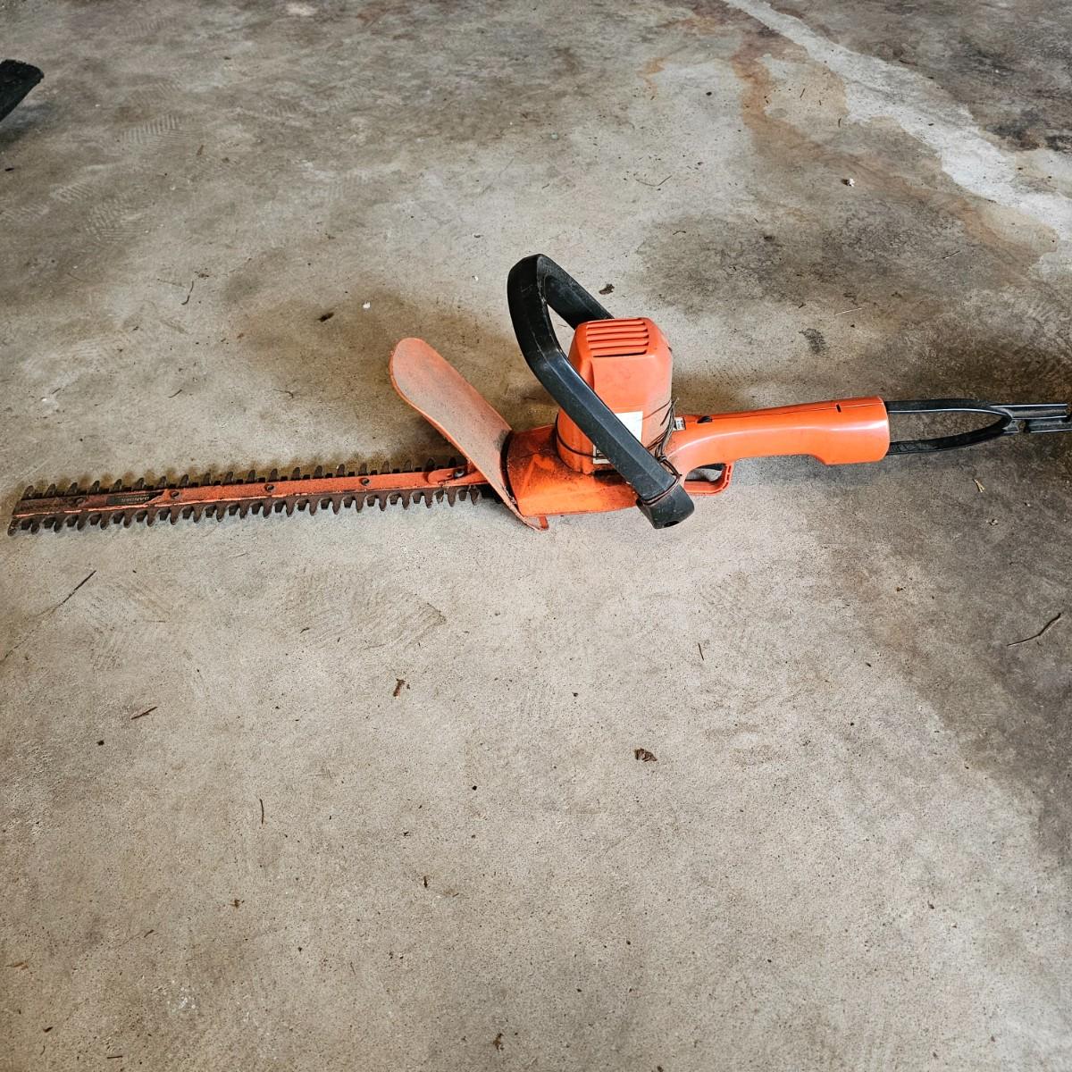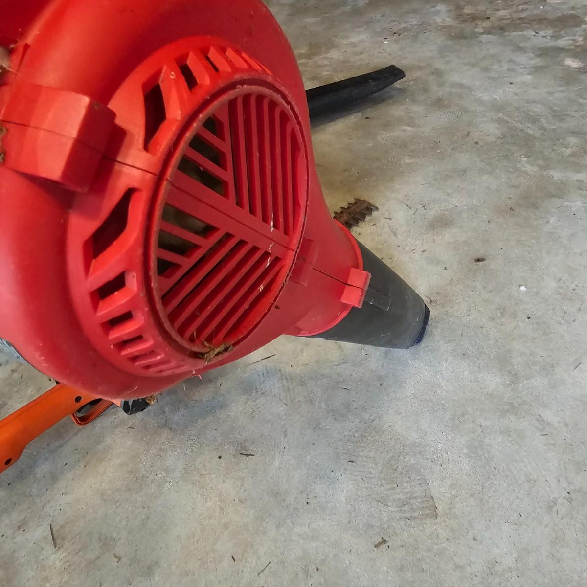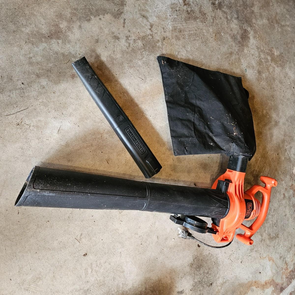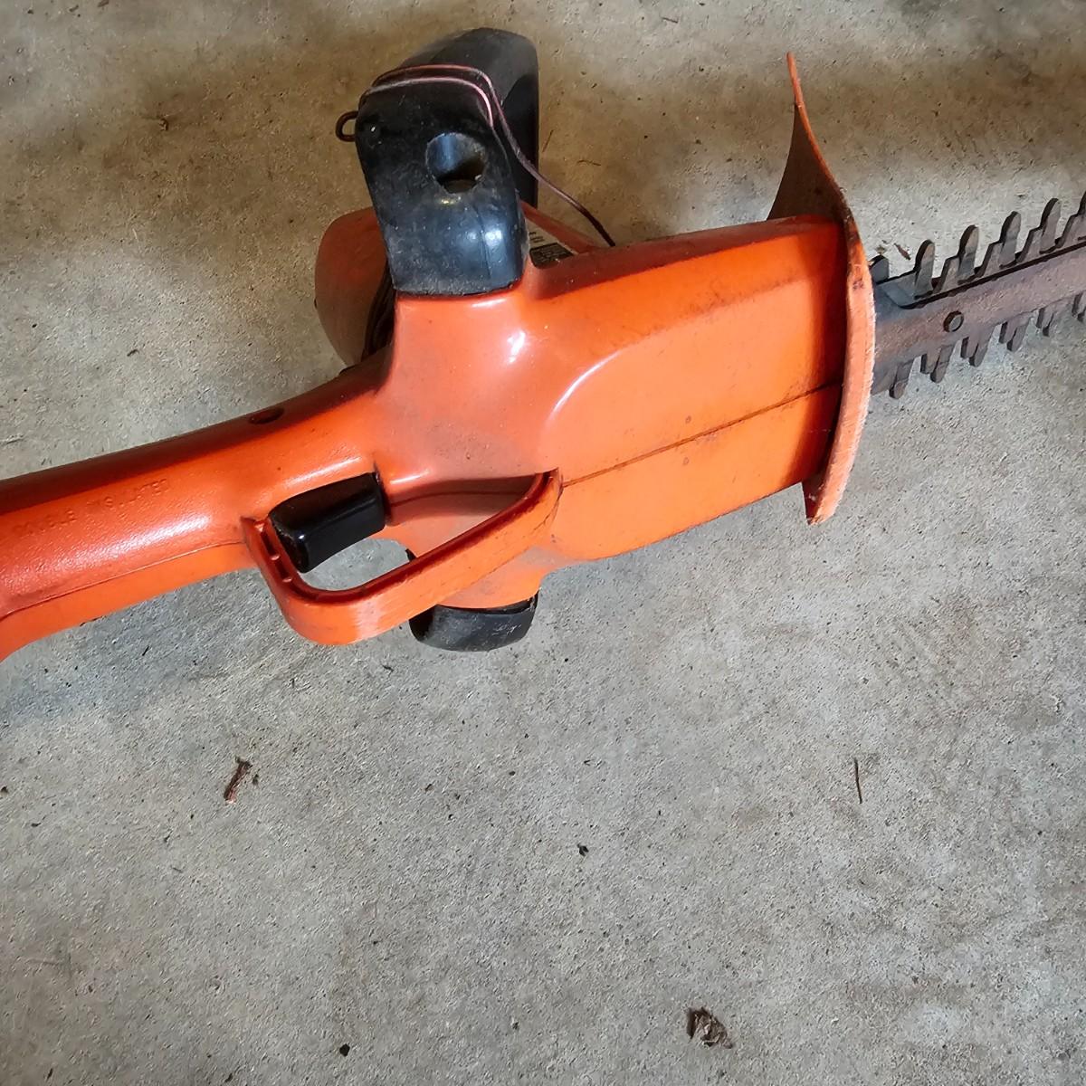Two blowers and a hedge trimmer make up this lot. Small red Homelite blower is two speed, measures 6" x 29" long. Black & Decker hedge trimmer has 16" blade, measures 7" x 35" long. Handle has had some repair. Large unit is also Black & Decker and is a combo blower/vacuum, interchanging pieces and a mulching bag. 18" x 43" long. All units powered on when plugged in. See photos for details. Local pickup only.