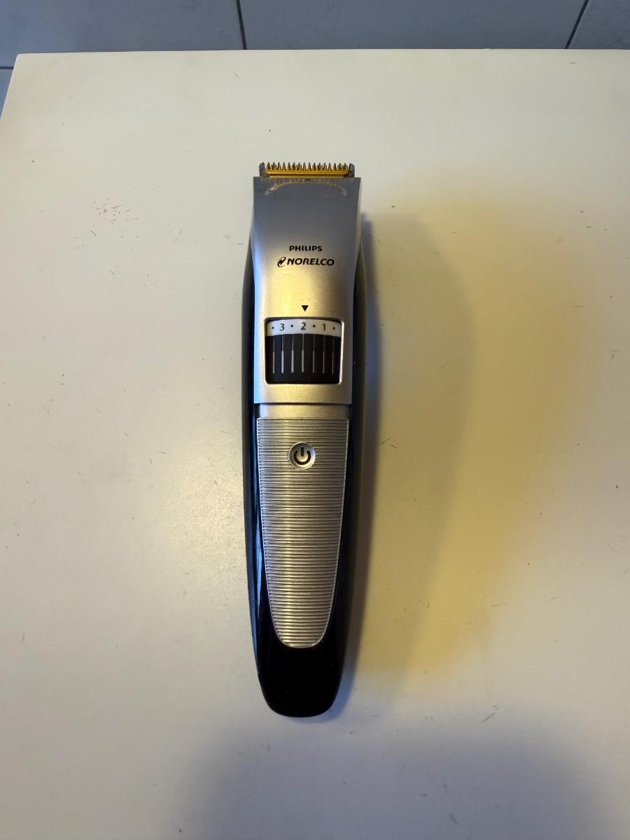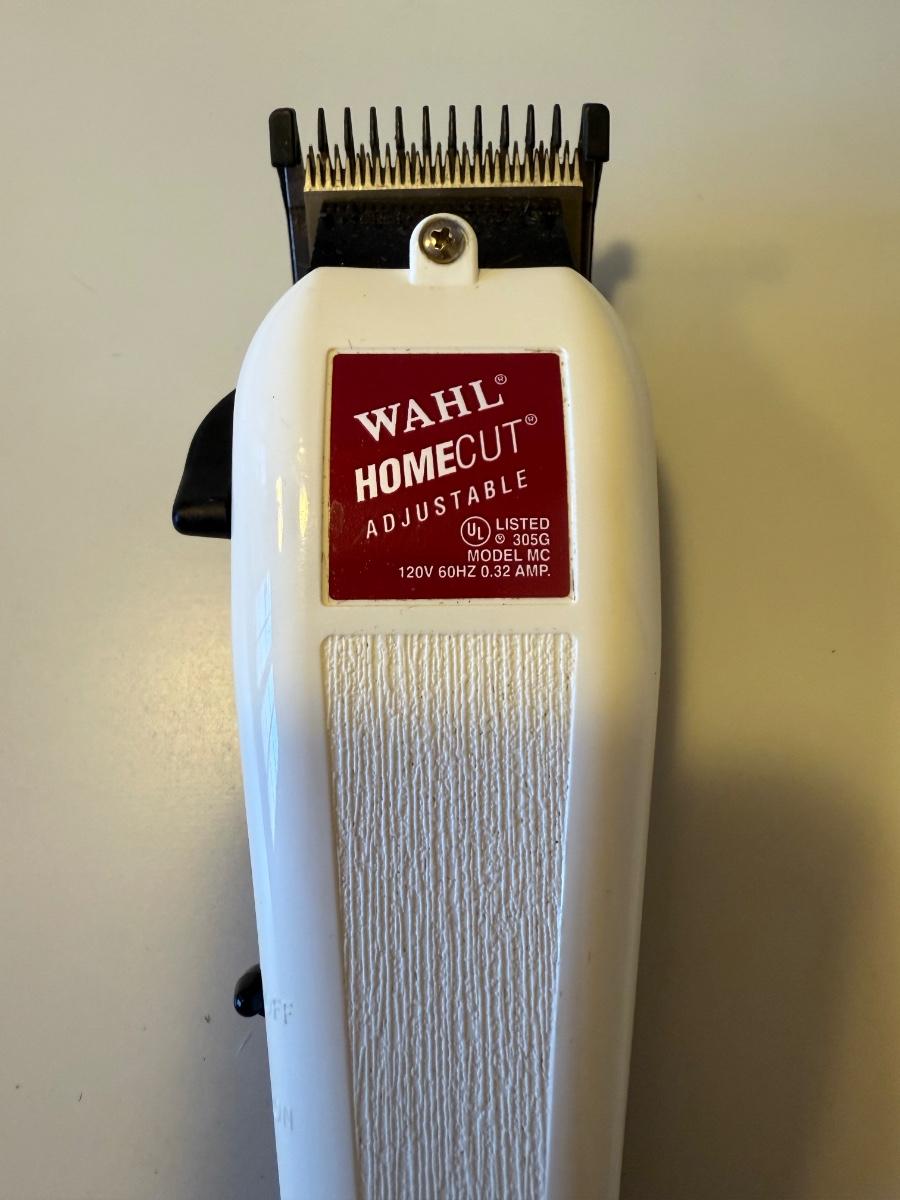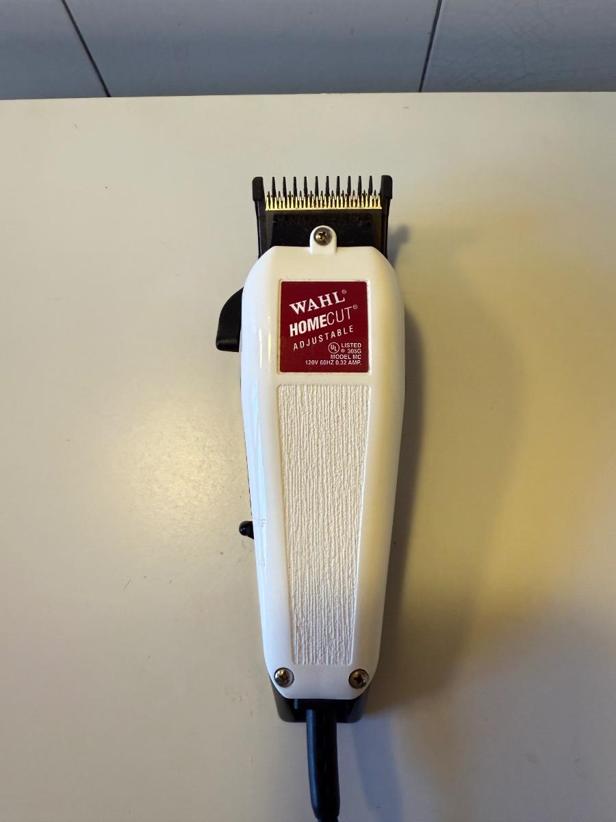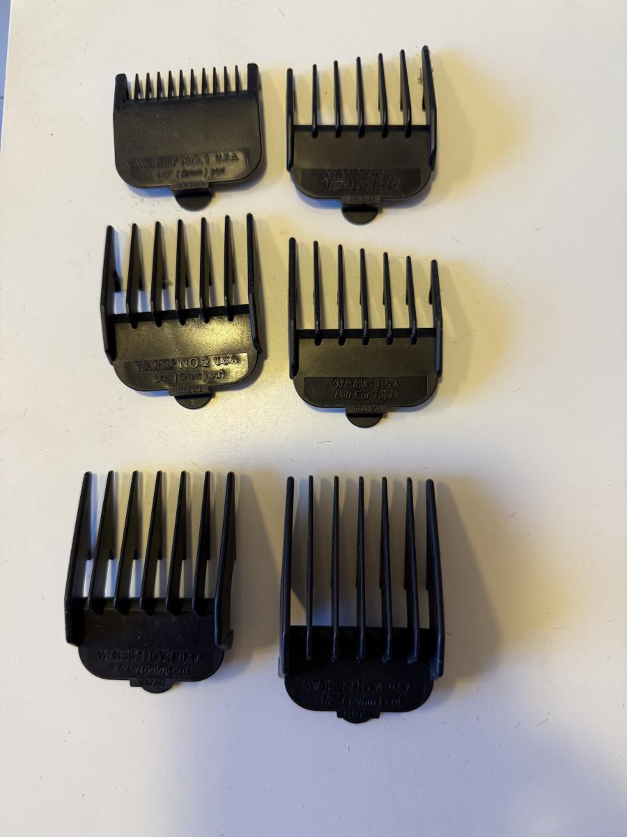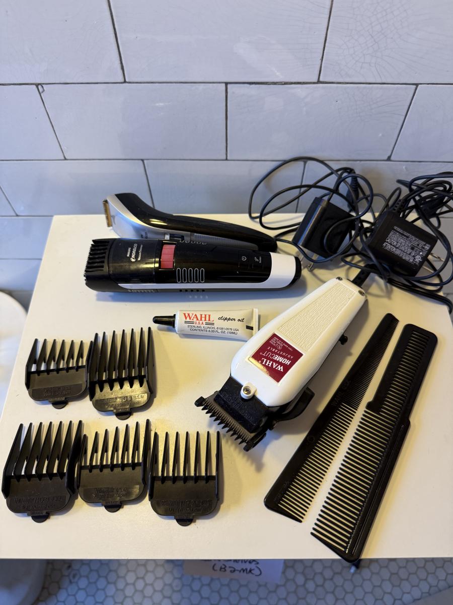 Three electric clippers/trimmers all power on when plugged in. The Wahl clipper comes with six different blade guards. The Philips Norelco has an adjustable head anywhere between 1/32” and 23/32”. The smaller Norelco adjusts as well on a scale of 1-10. Two plastic combs also included.