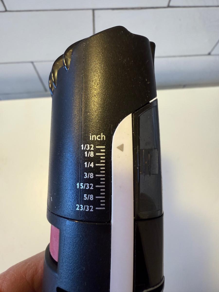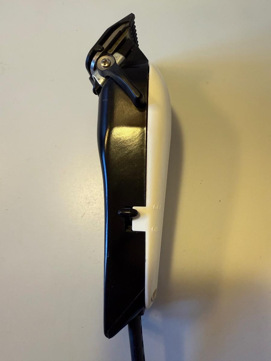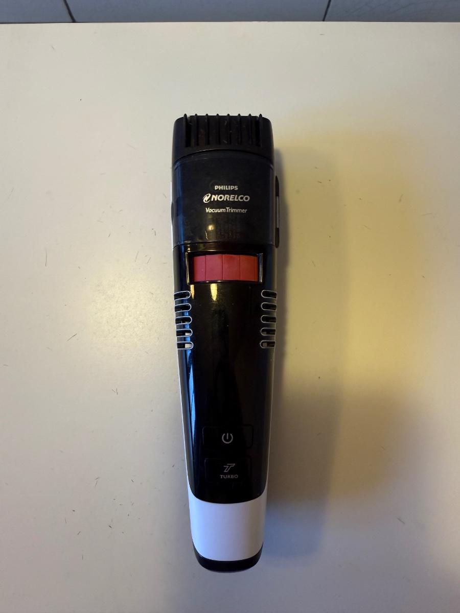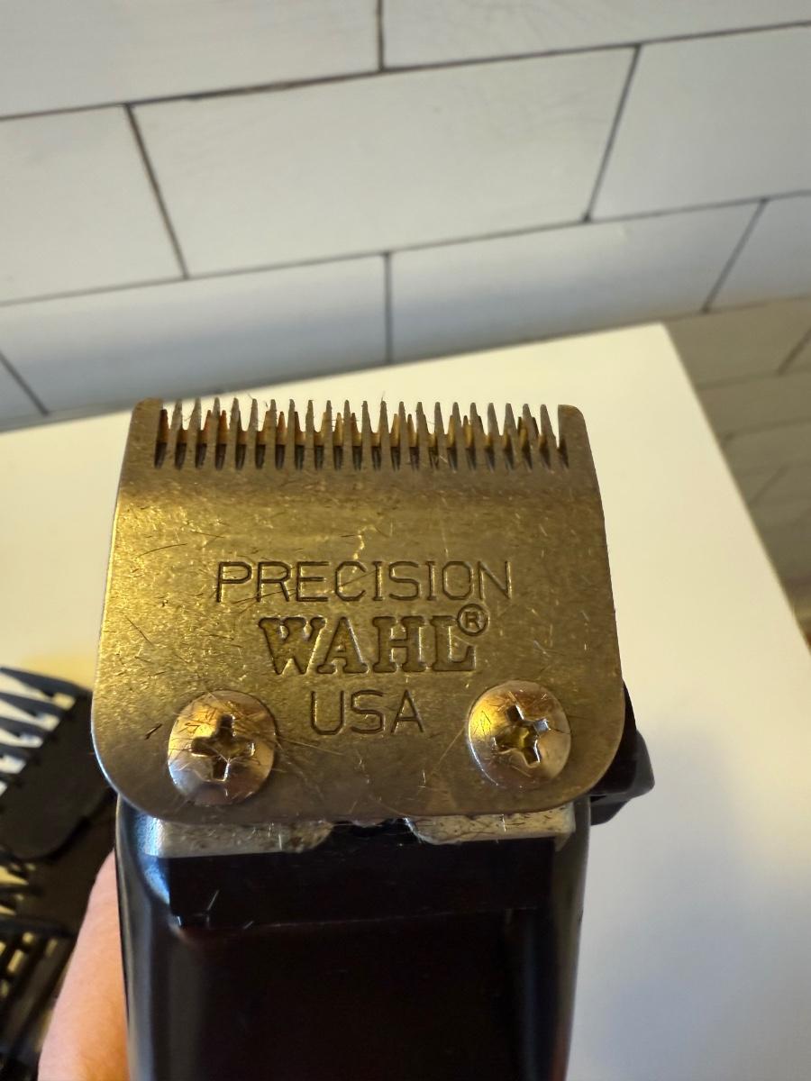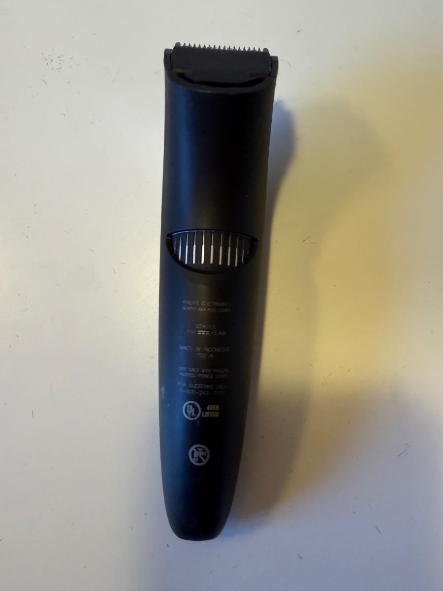Three electric clippers/trimmers all power on when plugged in. The Wahl clipper comes with six different blade guards. The Philips Norelco has an adjustable head anywhere between 1/32” and 23/32”. The smaller Norelco adjusts as well on a scale of 1-10. Two plastic combs also included.