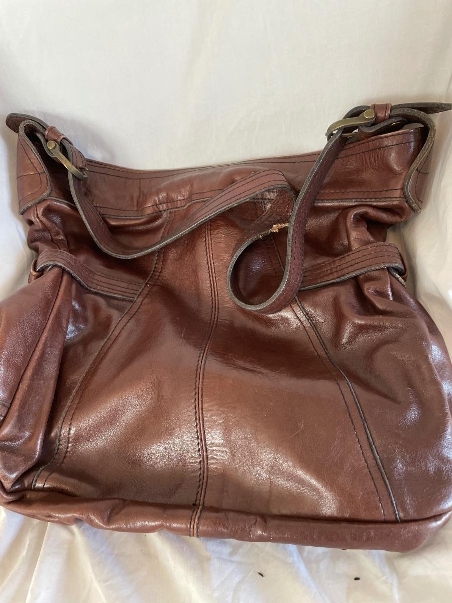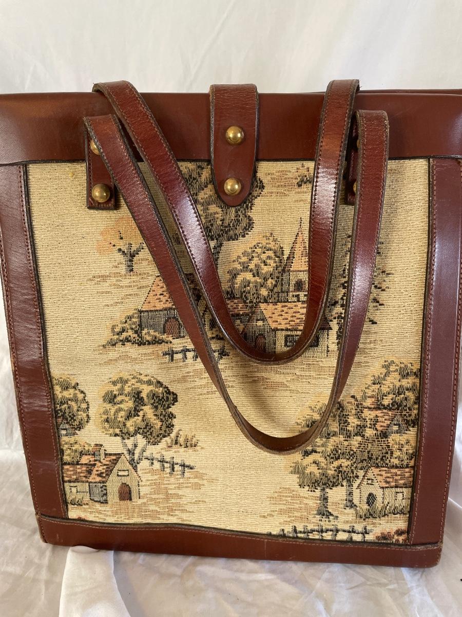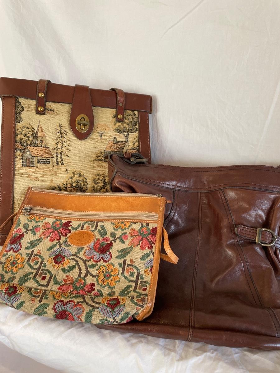 Brown leather by EM; tapestry; Mary Ann Rosenfeld… three fabulous handbags.