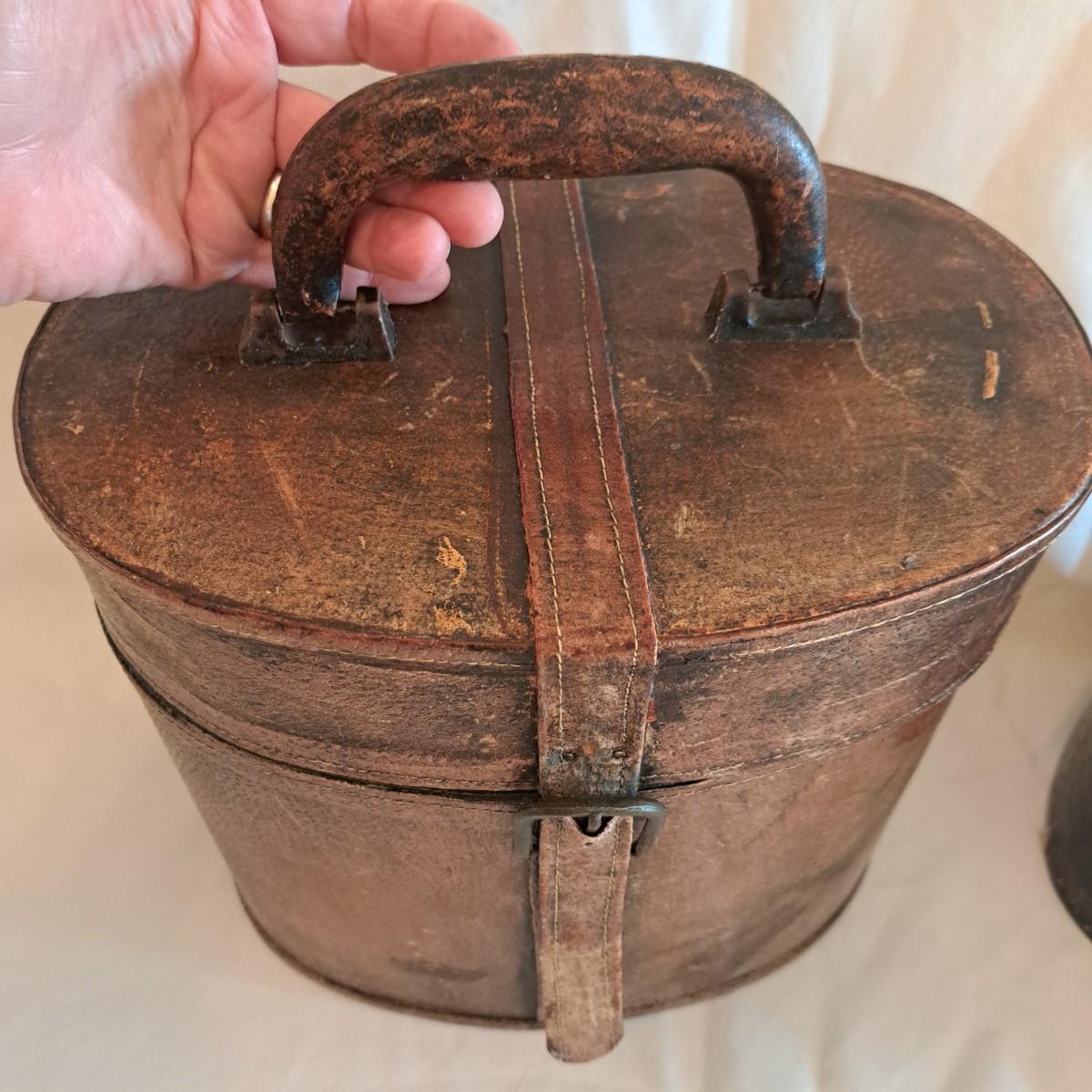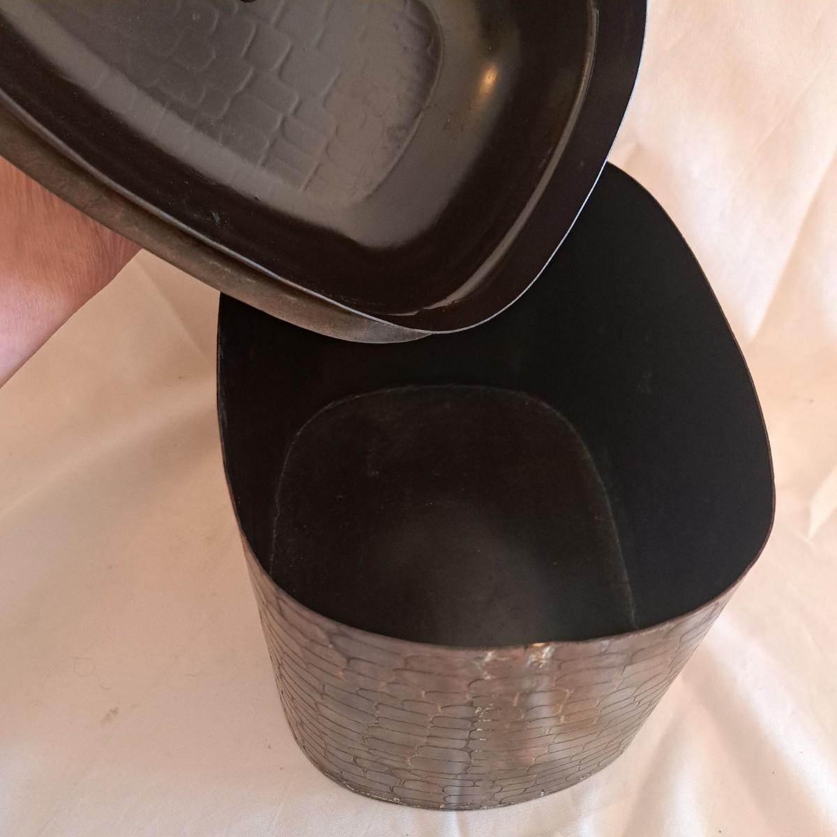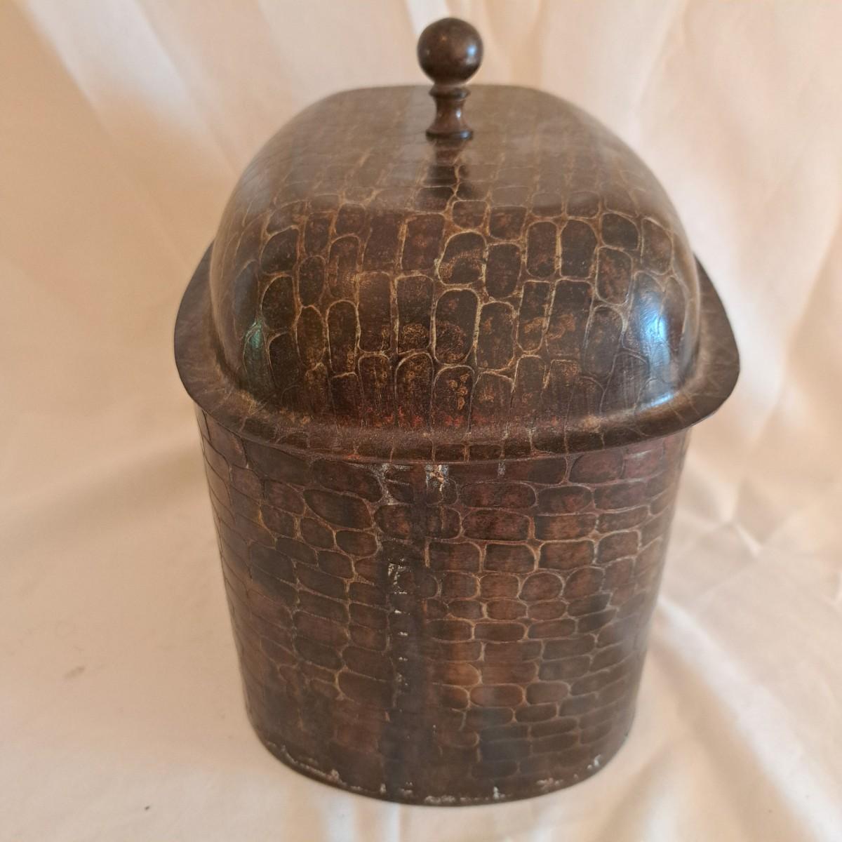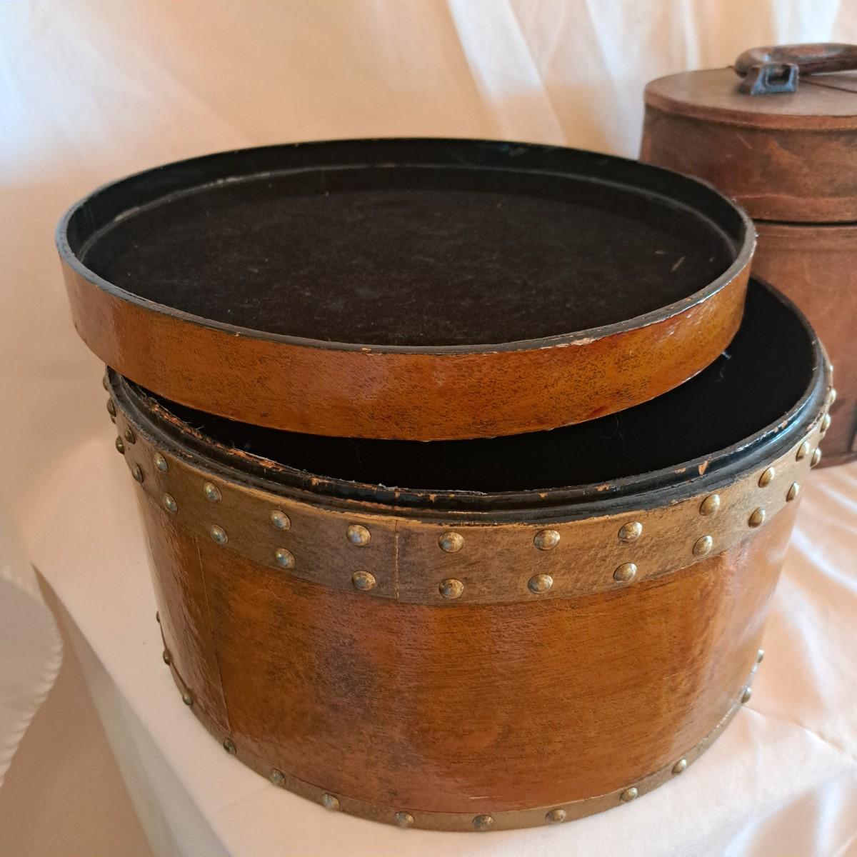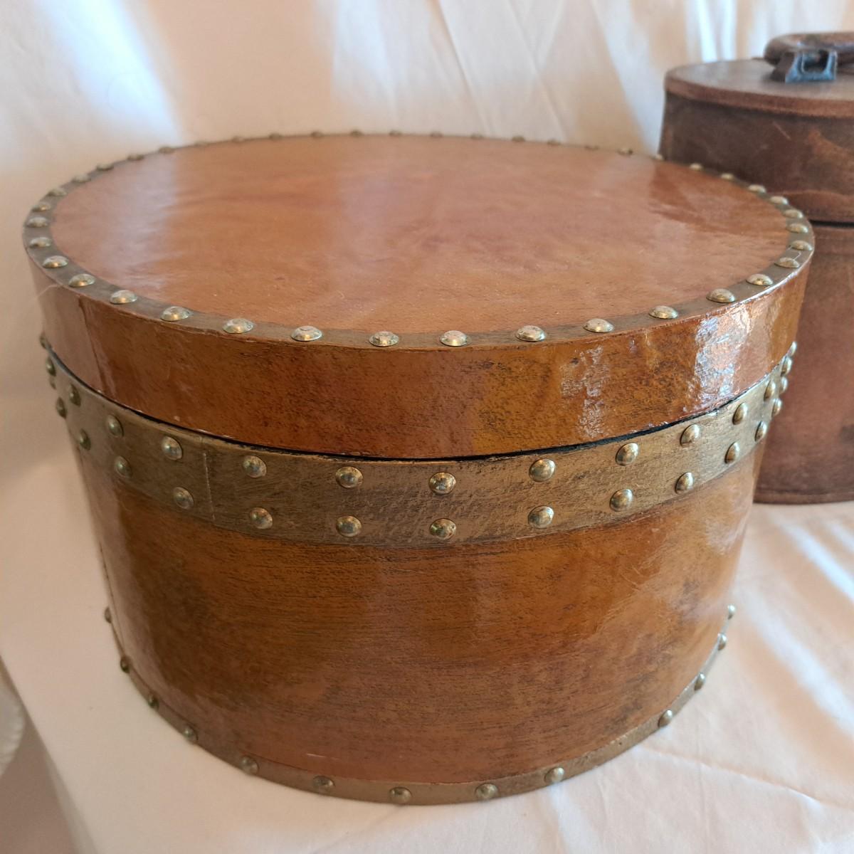 A threesome of somewhat distressed faux leather, wood and metal boxes ranging from 8.5"D x 9.5"H to 14"D x 9"H. Largest wooden round box has brass detail (side strips and studs) and is lined with velvet inside. The middle faux leather box is more like a carrying case with handle and has a strap with buckle - and magnetic snap - that opens to reveal a brown velveteen interior. Of note: the hole holding the buckle is slightly ripped as shown. The third brown and black box with lid has an exterior that mimics alligator scales and has a Made in India sticker at bottom. Shipping available.